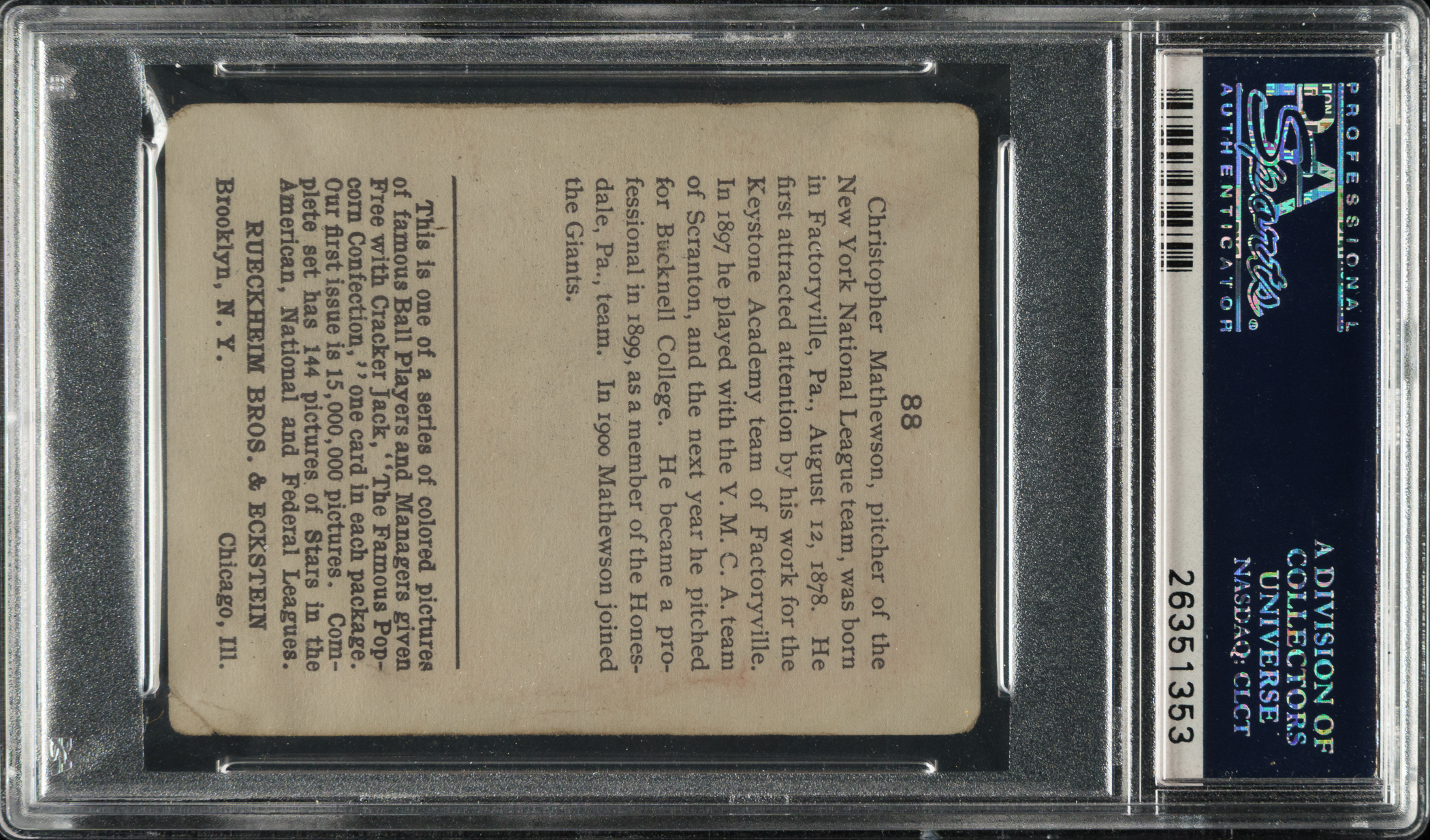 Graded GOOD+ 2.5 by PSA. Presented is an extremely attractive example of one of vintage-card collecting's most highly prized classics: Christy Mathewson from the 1914 Cracker Jack #144 series. This is one of the rarest and most desirable of all Mathewson cards and one of the most important of all Cracker Jacks. Christy Mathewson appears in a horizontal pitching pose in the 1914 Cracker Jack set, as opposed to the more familiar portrait pose of the 1915 set. Because there is no 1915 Cracker Jack alternative to the 1914 Cracker Jack Mathewson pitching pose, this card is of particularly great significance to Cracker Jack and Hall of Fame card collectors. It is universally recognized as one of the rarest and most significant Cracker Jack cards and is the key signature card of the entire 1914 Cracker Jack set. This example is exceptional for the grade, with flawless registration, bold color, and honest wear to the corners. A corner crease is visible on the upper-left (more noticeable from the reverse). Both front and back are clean with minimal caramel staining, a stark contrast to most examples, which usually display heavy staining from their exposure to the Cracker Jacks within the package. Cards from the 1914 series were attainable only directly from packages of Cracker Jacks and were not available in a boxed-set form, as was the case with the 1915 set. This is a stunning mid-grade example of this classic and significant prewar card featuring key Hall of Famer Christy Mathewson.