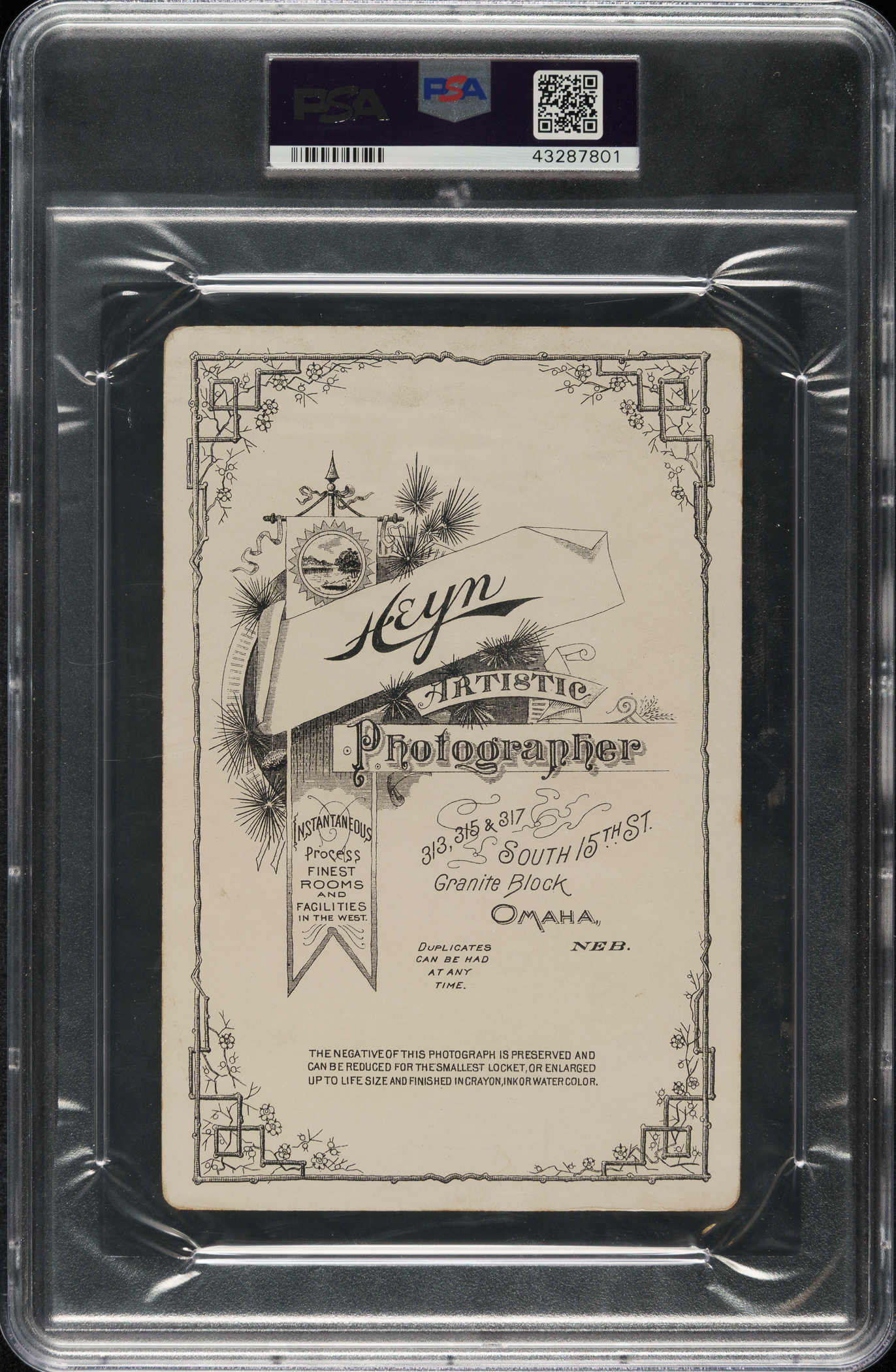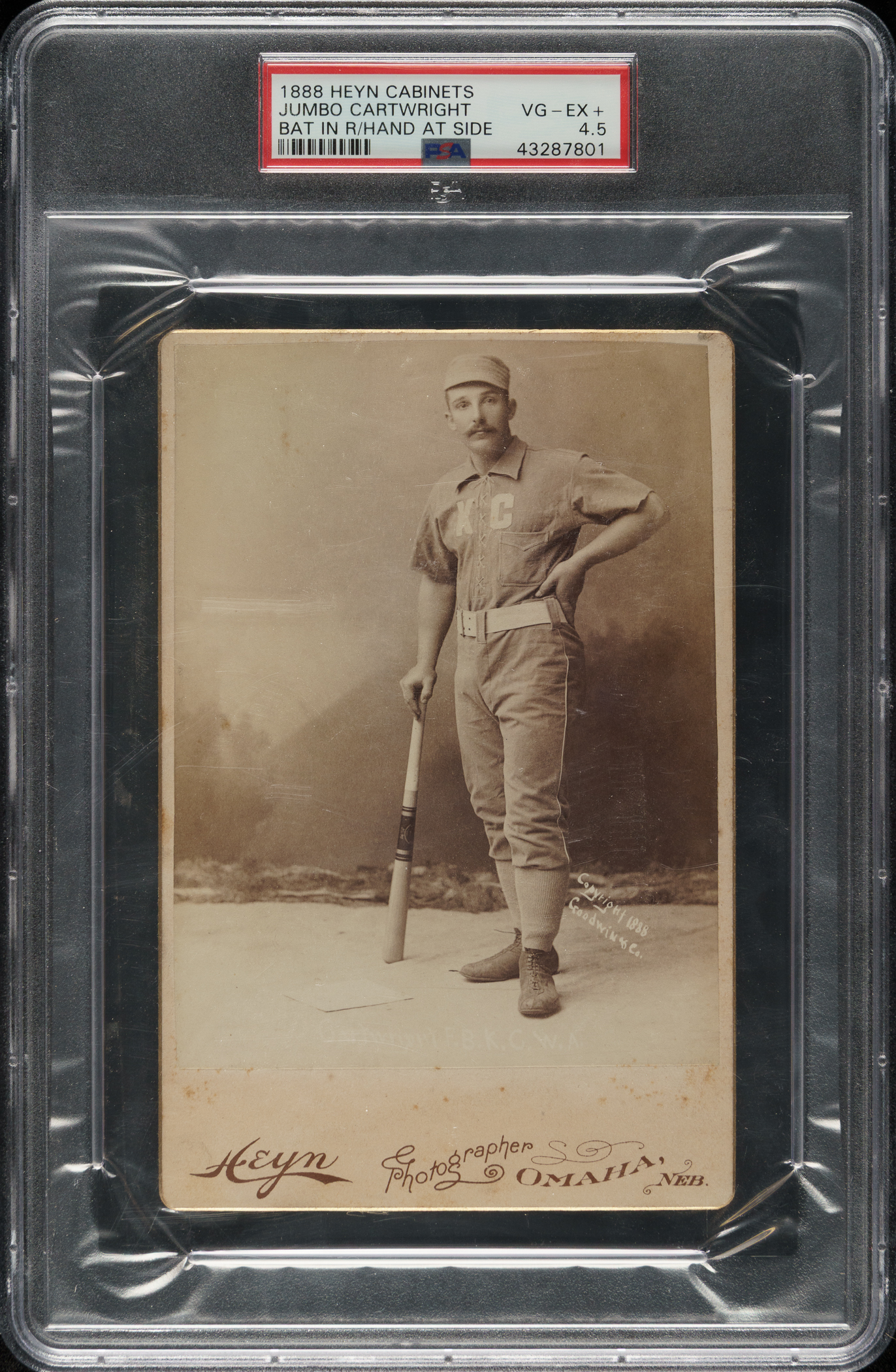Graded VG-EX+ 4.5 by PSA. This is the ONLY example that has ever been graded by PSA! N173 Goodwin Old Judge cabinet proof of Edward Charles "Jumbo" Cartwright. Produced by the Heyn photographic studio of Omaha, Nebraska, the card features the printed notation "Copyright 1888, Goodwin & Co." in the lower-right quadrant of the photo. As part of the production process for the N172 set, Goodwin & Co. would contract with various photographers to obtain original images from staged photo shoots done in their studios. The "proof" cabinets produced by these studios, such as Heyn, were provided not only to Goodwin and other companies for their commercial use but were also often given to players, family, or made available to the public as a means of advertising for the respective studio. In the offered cabinet photo, which has exceptional clarity, Cartwright is depicted leaning on his bat (Pose #70-4). A very elaborate advertisement for the Heyn studio appears on the reverse. Cartwright played five seasons at the Major League level (St. Louis Browns and Washington Senators), finishing with a .295 career batting average. He is best known for driving in seven runs during one inning of a game, a record that stood for 109 years. The cabinet card (4.25 x 6.5 inches) displays modest corner wear and very light foxing along the base of the mount. This would be a significant and worthy addition to even the most advanced 19th century baseball collection.