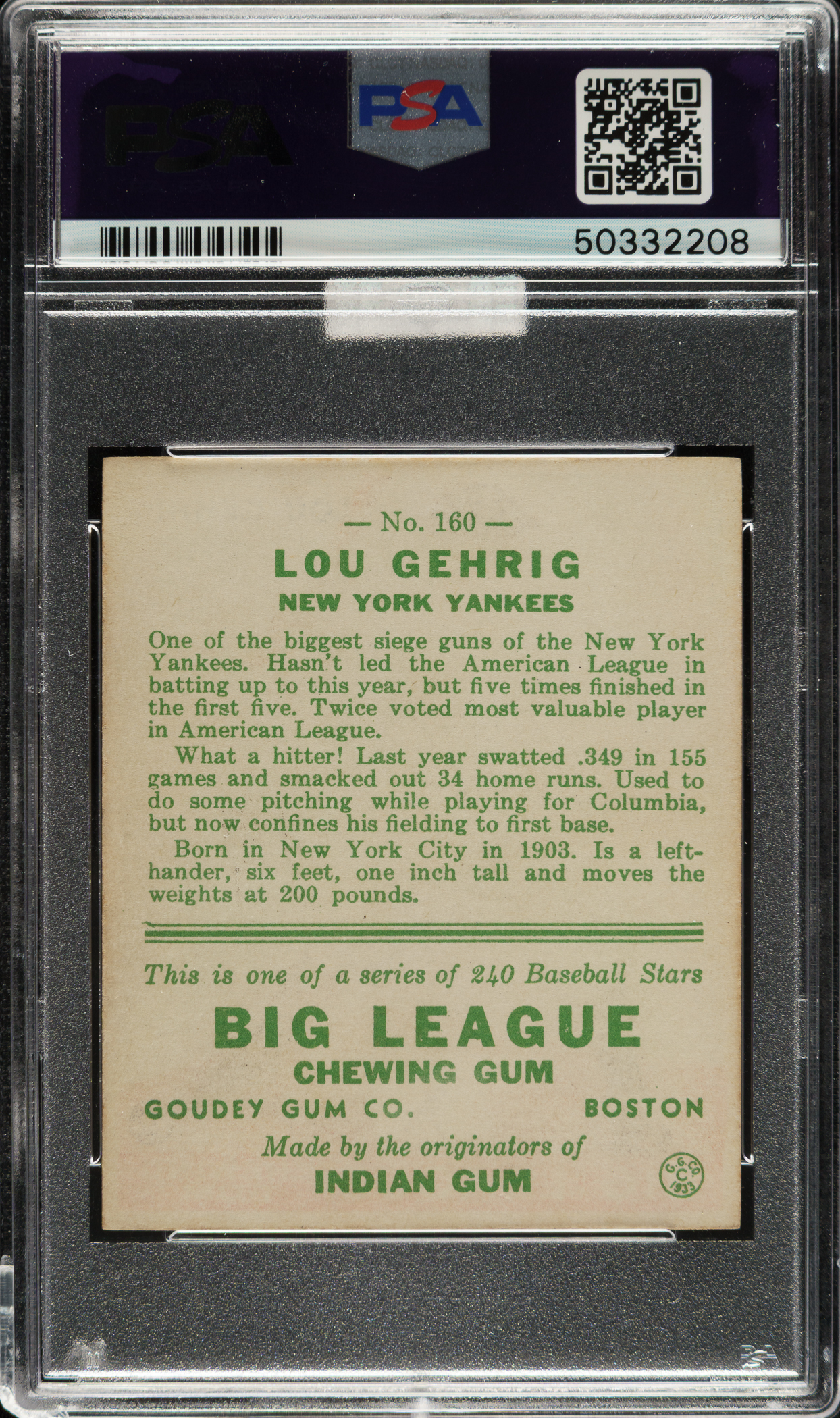 1933 R319 Goudey #160 Lou Gehrig PSA NM 7 (MBA Gold Diamond)