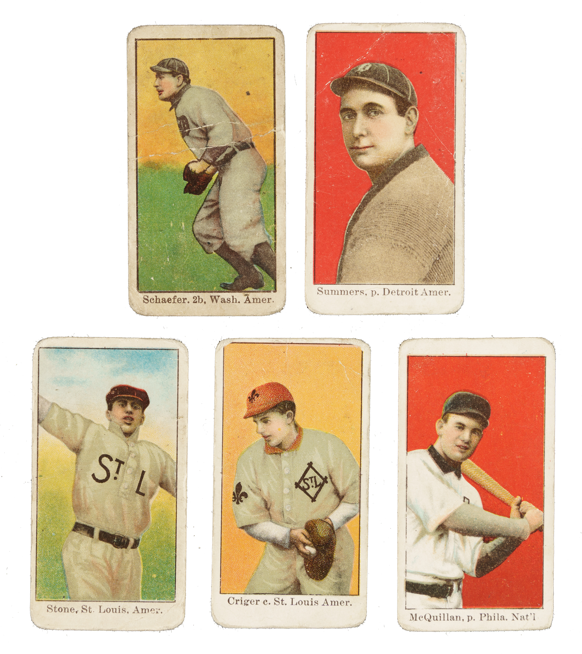 Collection of five 1909-1911 E90-1 American Caramel cards. This collection consists of the following: Criger (Fr), McQuillan (Gd+), Schaefer (Pr), Stone (Gd), and Summers (Pr). Total: 5 cards.