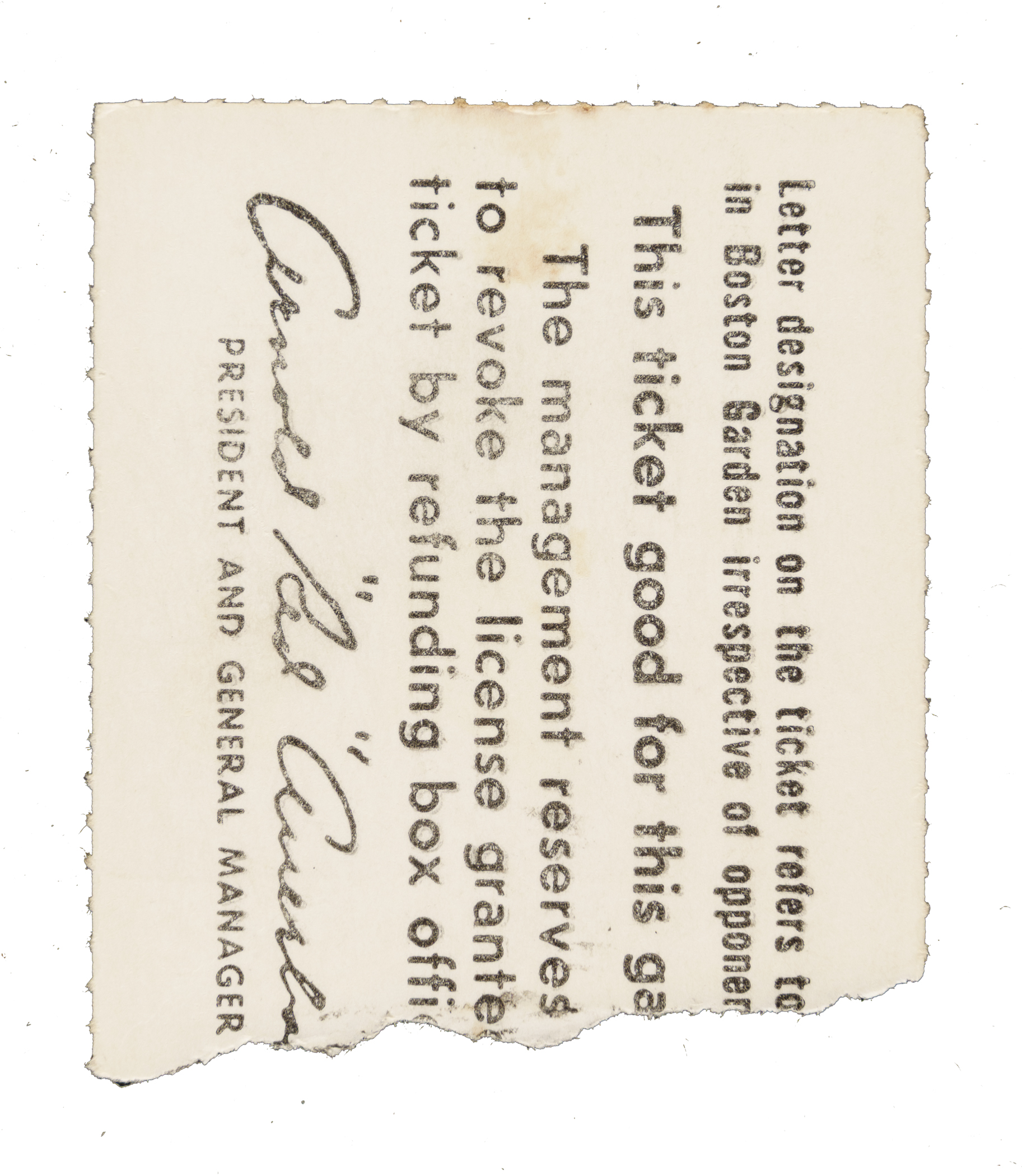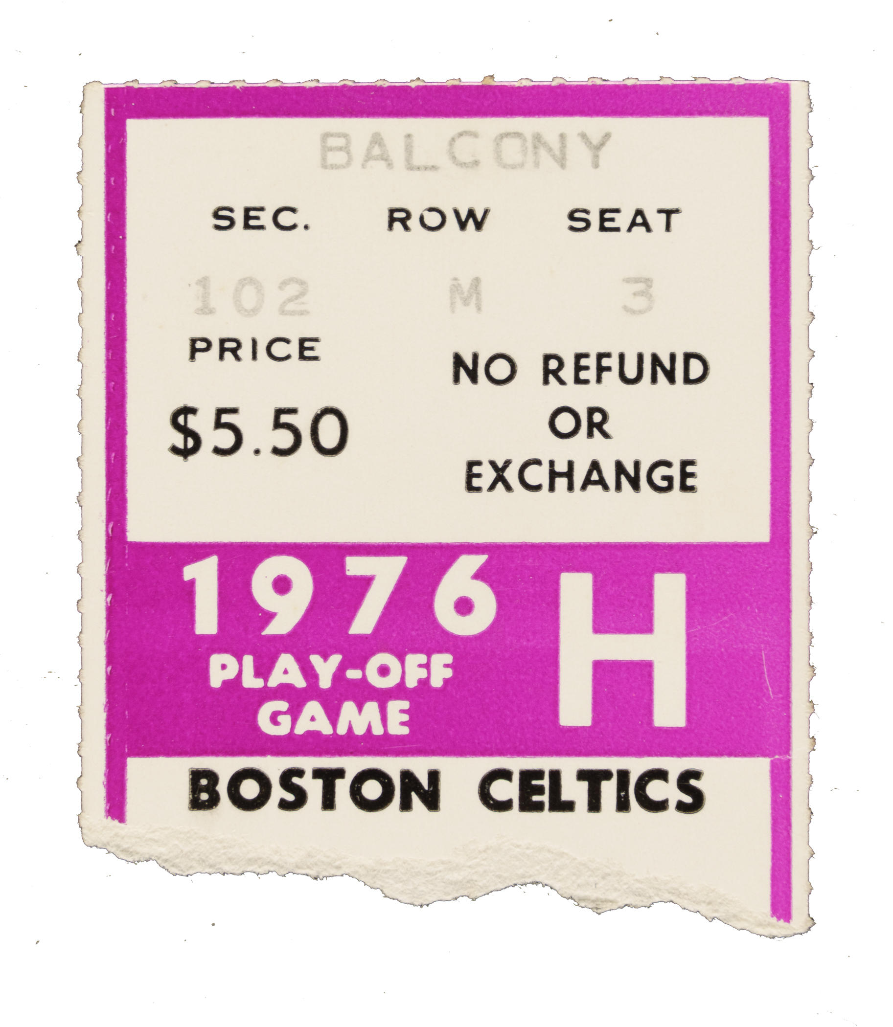 Boston Celtics ticket stub (1-5/8 x 1-7/8 inches) issued for Game 5 of the 1976 NBA Finals against the Phoenix Suns at the Boston Garden. In a contest some NBA historians consider "the greatest game ever played," the Celtics outlasted the Suns 128-126 in a three-overtime thriller. The Celtics would go onto to clinch the series the following game. Very Good condition overall.