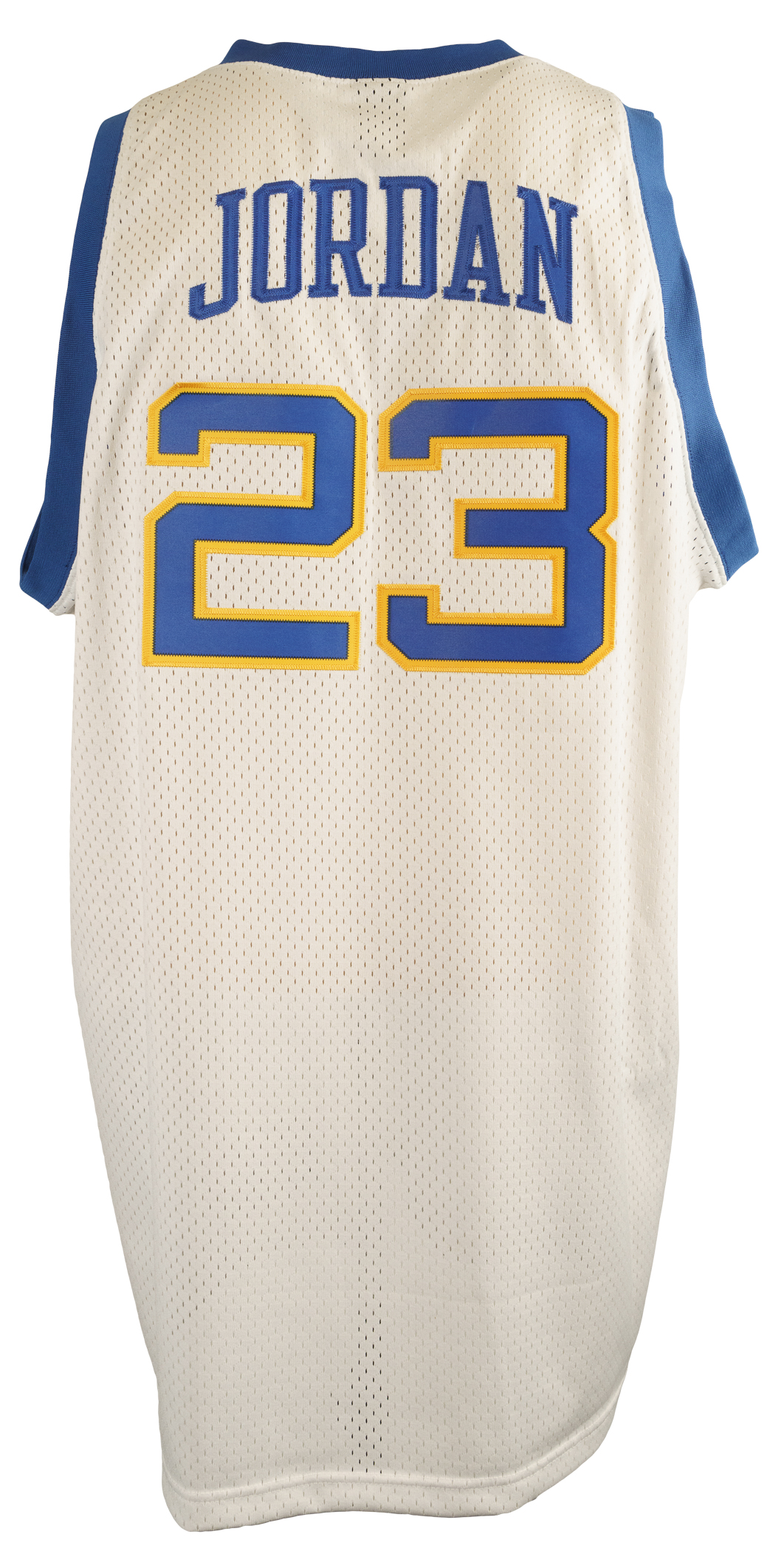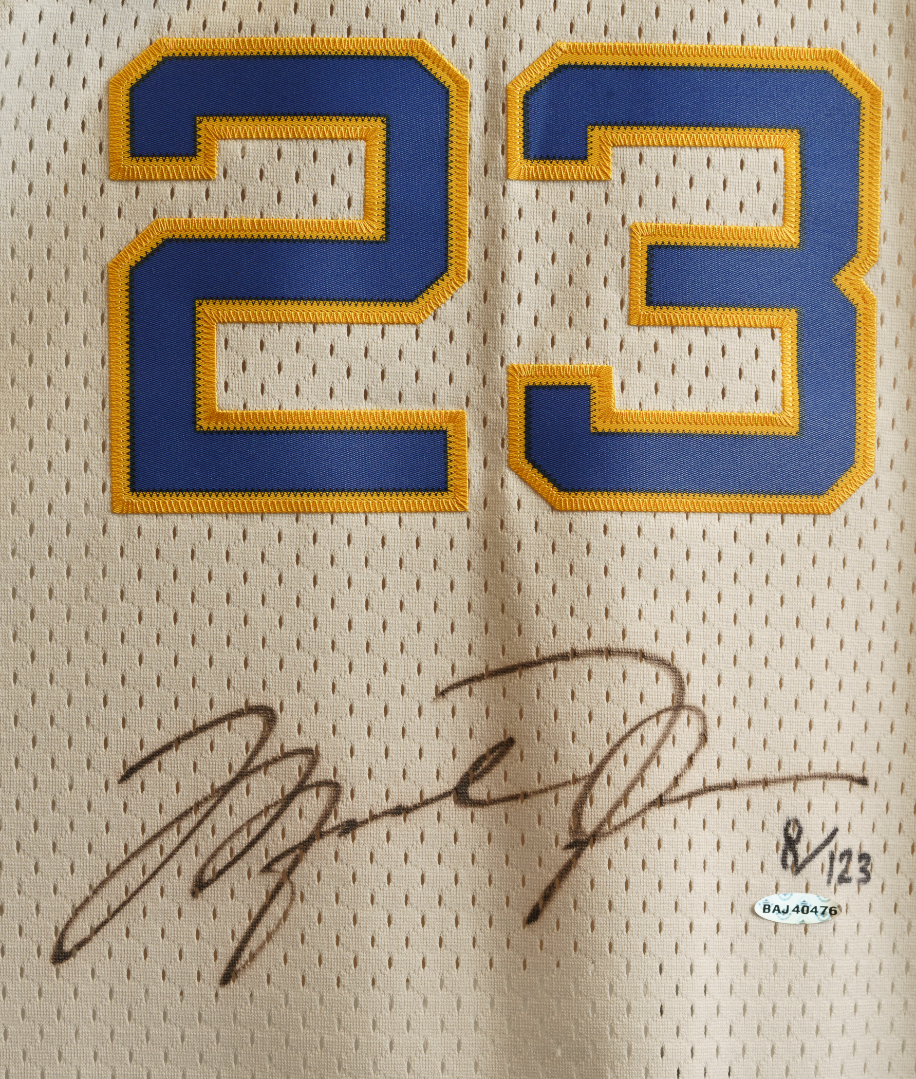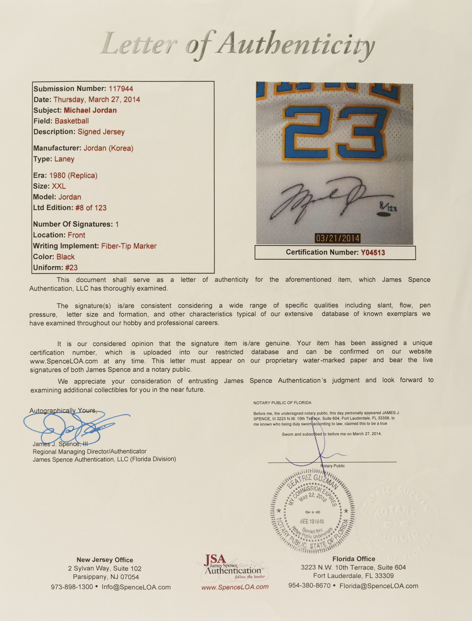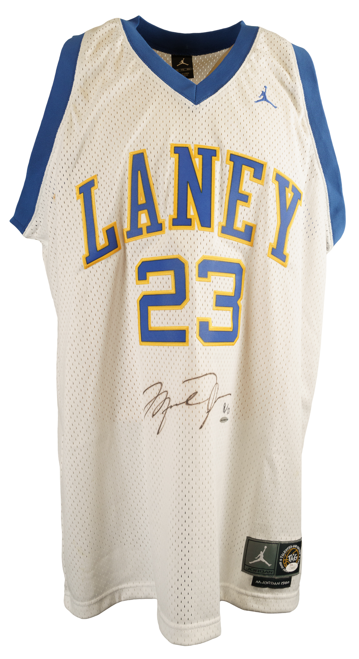Michael Jordan Laney High School replica jersey signed by him in black marker on the front. Numbered 8/123 below Jordan's signature. The Jordan Brand replica jersey (size XXL) is in Near Mint condition overall. An Upper Deck certification sticker is affixed below the limitation number. Full LOA from James Spence/JSA.
