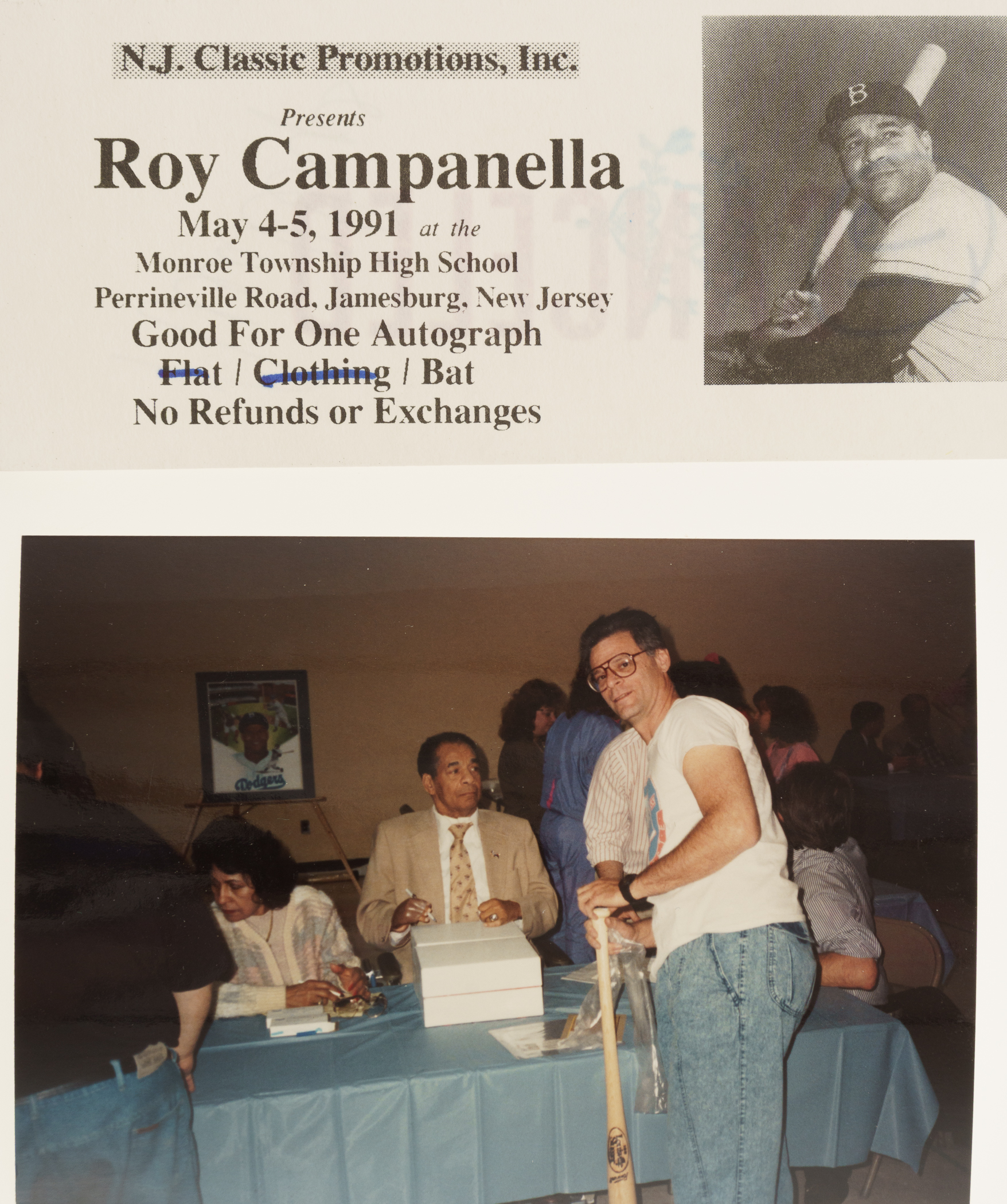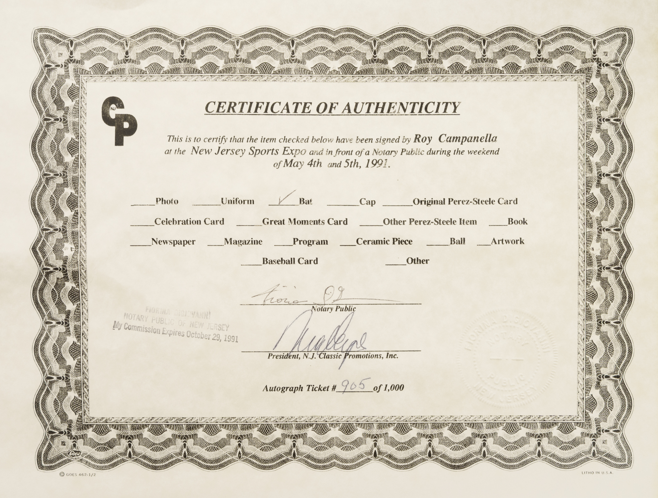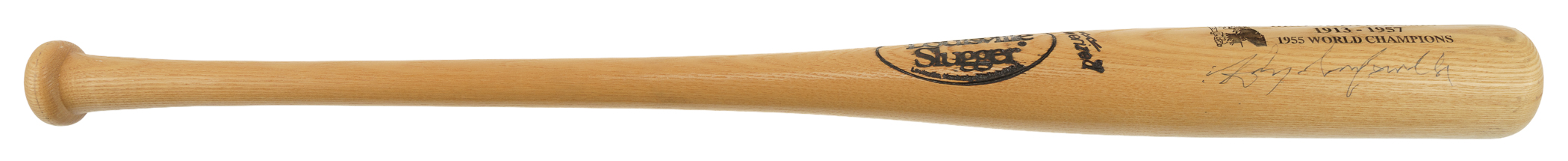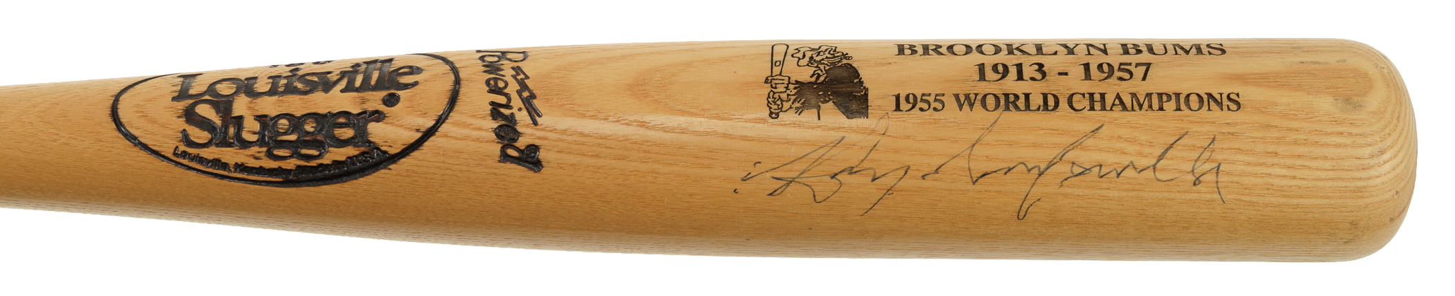 Brooklyn Dodgers Hall of Famer Roy Campanella signed bat. This item was acquired by our consignor during a show signing in 1991. The card is accompanied by a notarized COA and an autograph ticket from the show, as well as a photo of our consignor with Campanella during the signing. Full LOA from James Spence/JSA. The size/weight of this item requires that there will be an additional shipping charge for this lot.
