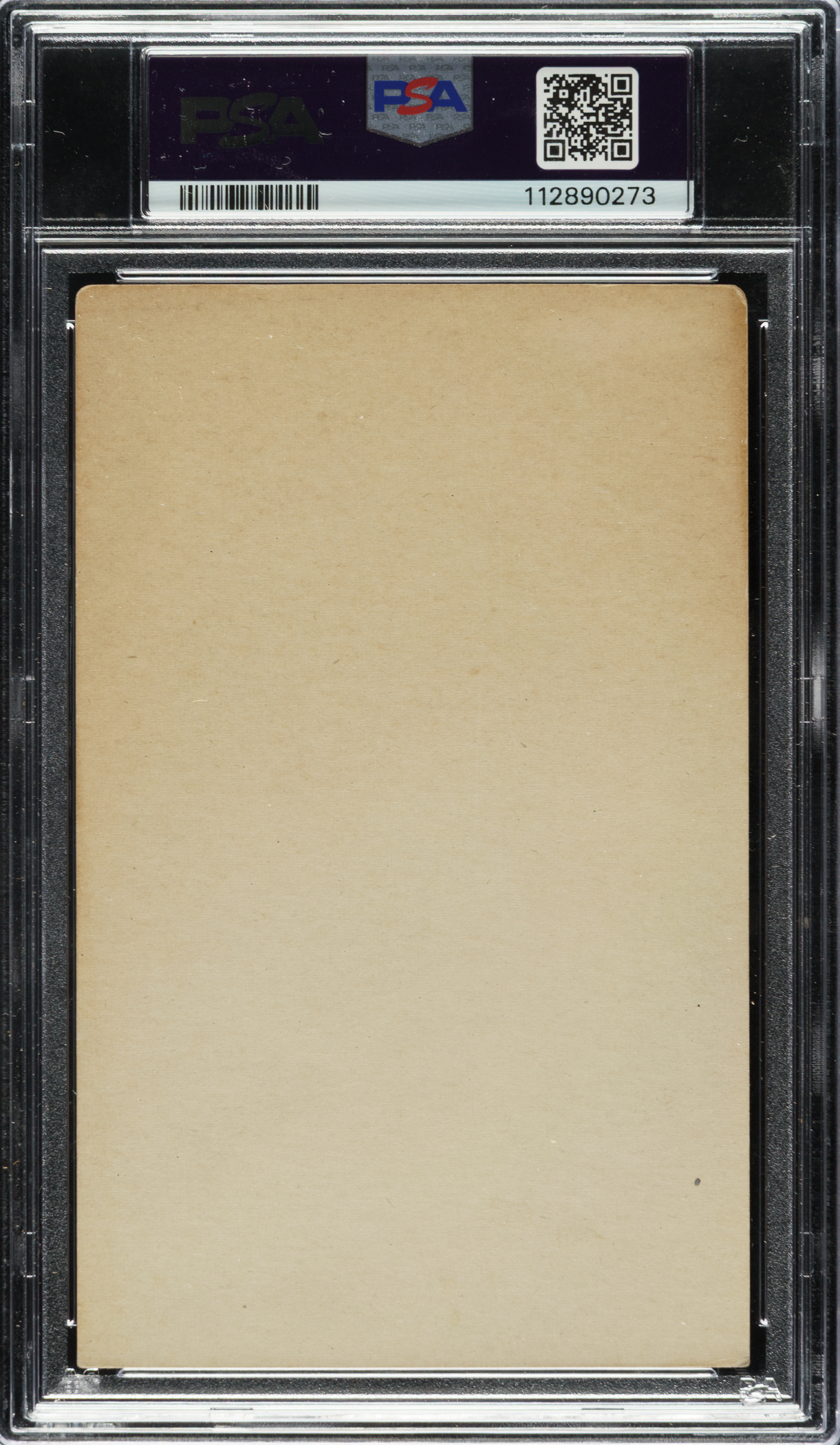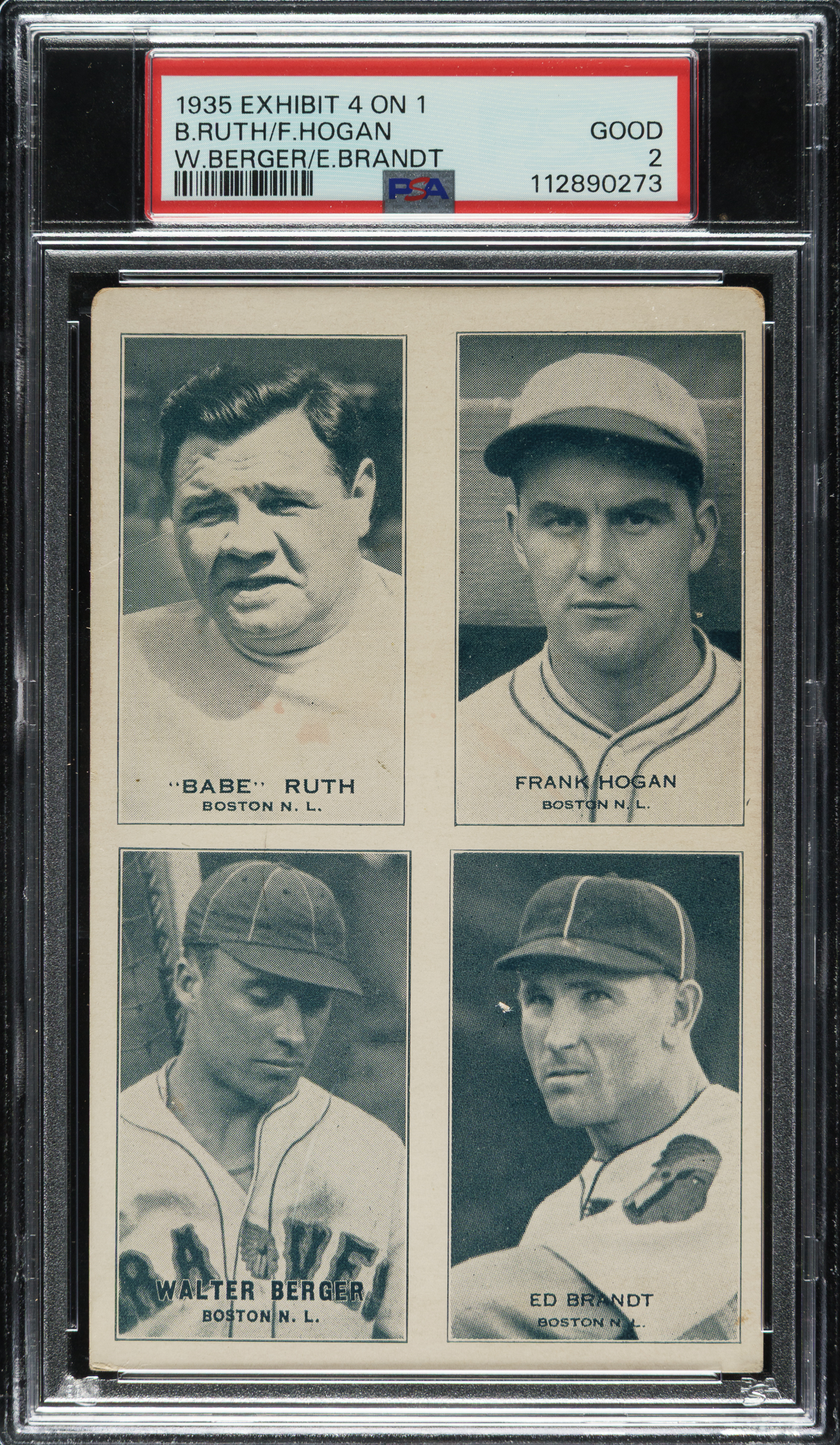Graded GOOD 2 by PSA. Very attractive example of the key card from the 1935 Four-On-One Exhibit set featuring slate blue portraits of Boston Braves stars Babe Ruth, Frank Hogan, Wally Berger, and Ed Brandt. The blank-back card was produced by the Exhibit Supply Company of Chicago. This, along with his 1935 Goudey card, was Ruth's last card ever issued as a player. Ruth left the Yankees following the 1934 season to join the Boston Braves. He stayed with the Braves only a few weeks, playing in just 28 games, before announcing his retirement in late May 1935. The card displays outstanding clarity and moderate corner wear (weaker top two). The blank back is clean. Wrinkles and spots of discoloration along the Ruth panel contribute to the assigned grade. This is a solid example of one of the most interesting, significant, and overlooked of all Babe Ruth rarities.