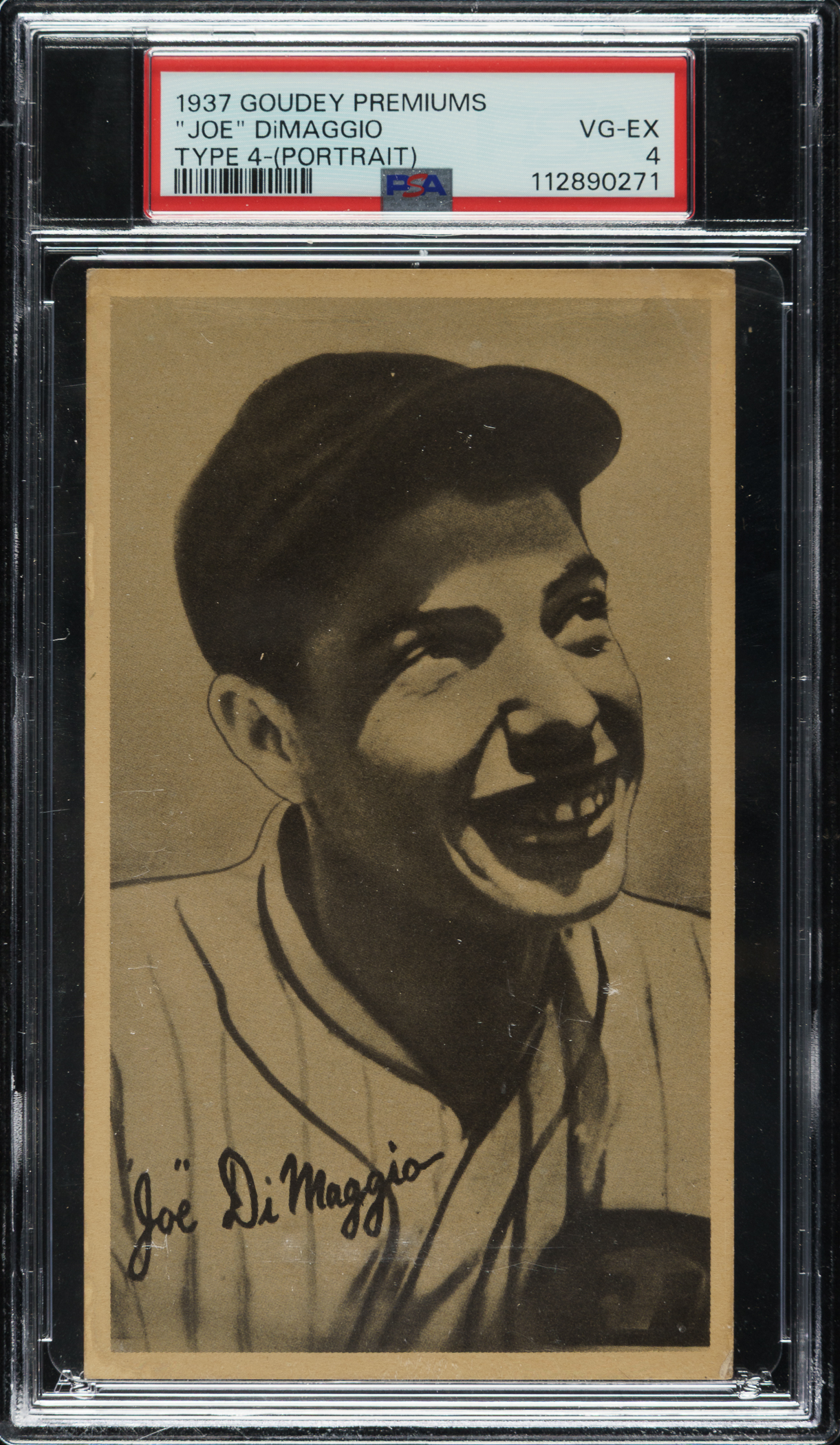 Graded VG-EX 4 by PSA. Outstanding mid-grade example of Hall of Famer Joe DiMaggio from the 1937 R314 Goudey Wide Pen Premium (Type 4) series. This example features a crisp image, light corner wear (weaker bottom right), and excellent centering. Clean reverse. There is a small crease below the top-right corner noted for accuracy. This is a fantastic example of this often-overlooked Joe DiMaggio card.