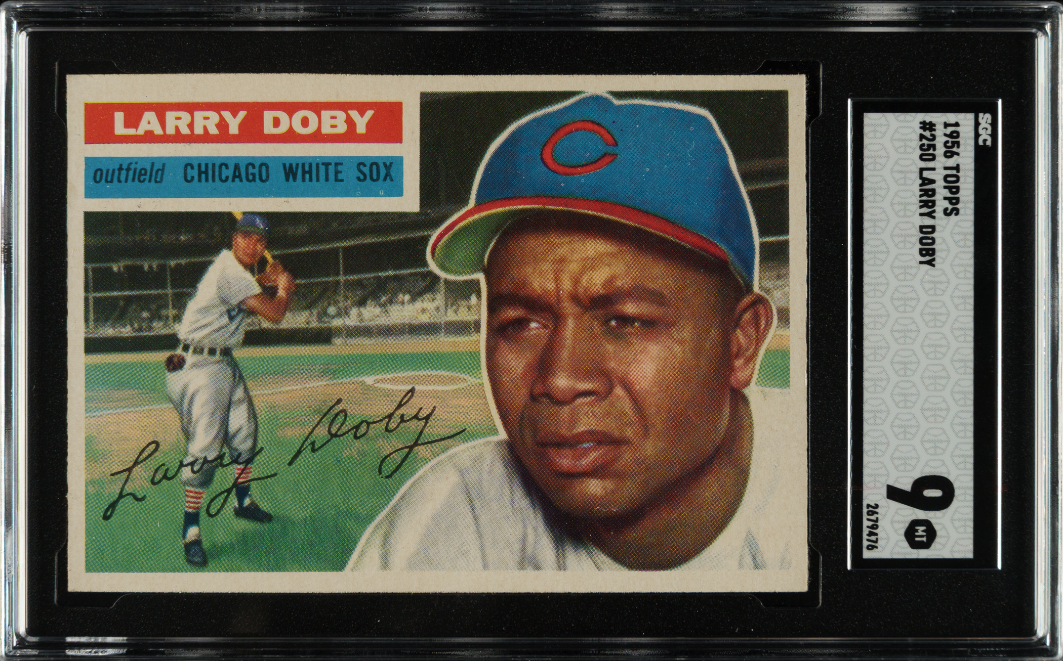 Graded MINT 9 by SGC. Of the more than 400 examples of this card SGC has evaluated to date, only two have achieved this grade, with none graded higher. Extraordinary example of Cleveland Indians Hall of Famer Larry Doby from the classic 1956 Topps set. This card displays brilliant colors, outstanding contrast, four sharp corners, and excellent centering. Clean reverse. 1956 Topps cards typically suffer from a variety of condition problems, including print defects and a tendency to have soft corners, which make high-grade examples particularly difficult to find. An exceptional high-grade example worthy of the finest 1956 Topps set or Hall of Famer card collection.