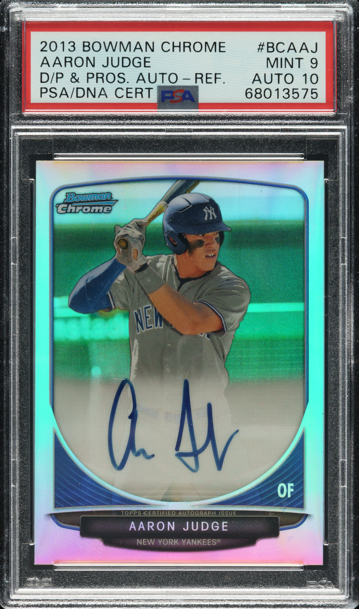 Incredible example of Aaron Judge's 2013 Bowman Chrome Draft Picks & Prospects Autographs #BCA-AJ Refractor card. Judge has signed the card in blue marker on the front. Graded MINT 9 by PSA with GEM 10 signature. A stunning signed prospect card featuring this popular New York Yankees superstar.