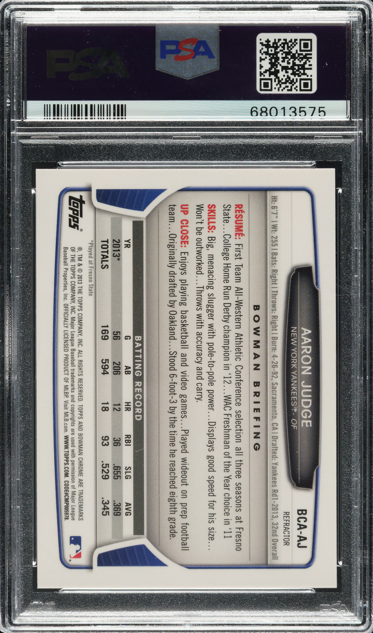 2013 Bowman Chrome Draft Picks & Prospects Autographs #BCA-AJ Aaron Judge Refractor PSA MINT 9 with GEM MINT 10 Signature