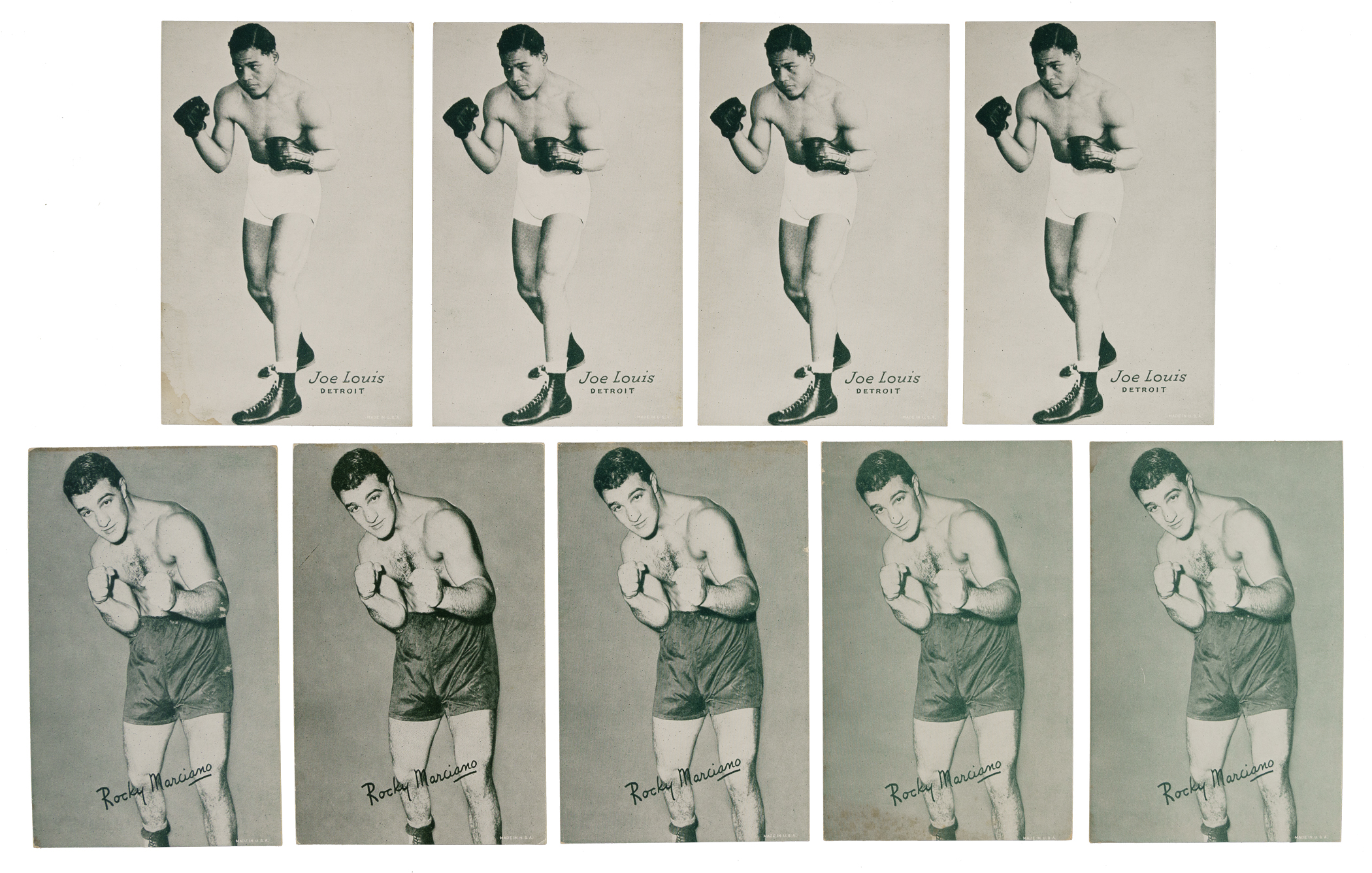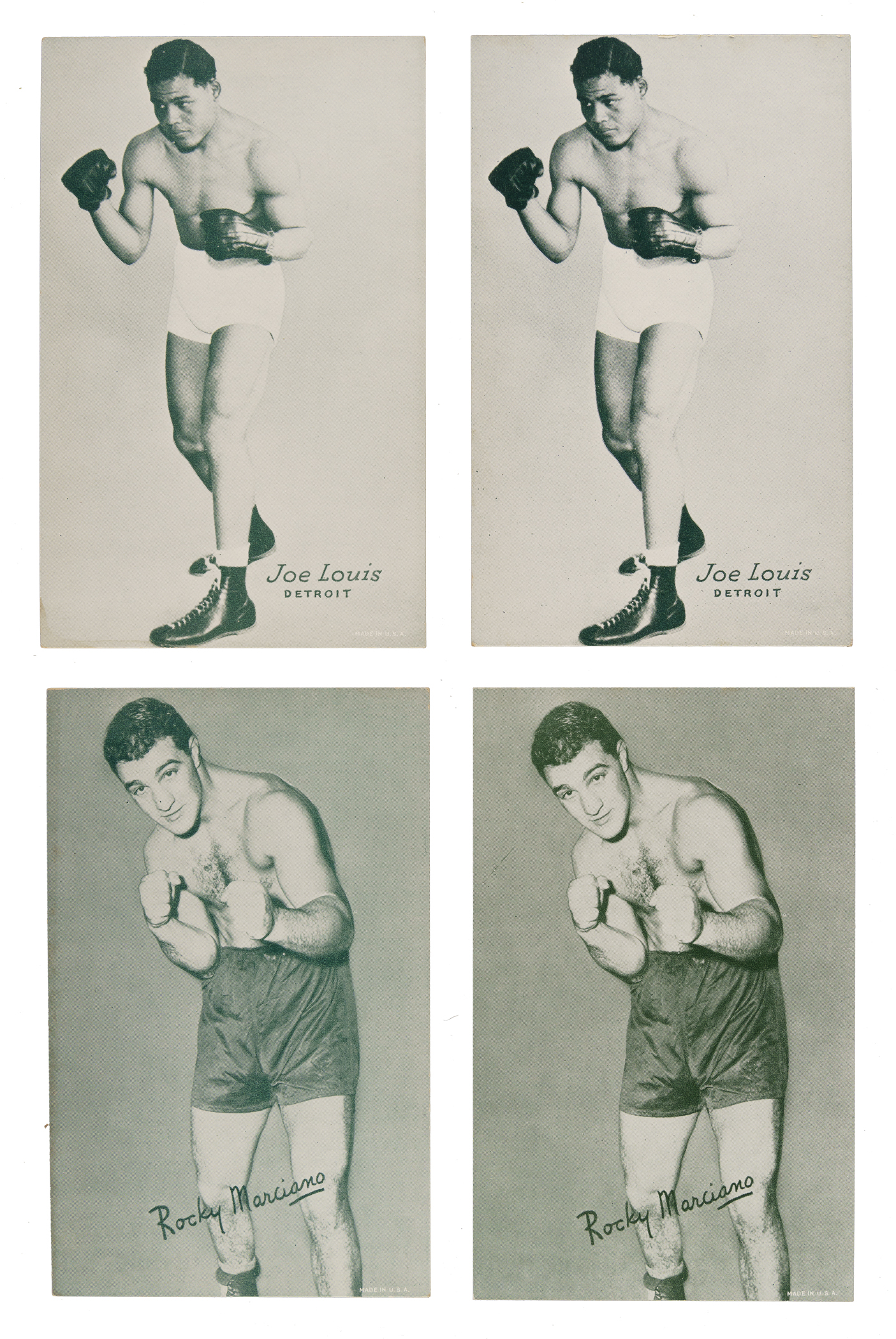 Collection of thirteen 1947-1966 Exhibits boxing cards, featuring boxing Hall of Famers Joe Louis and Rocky Marciano. Each card has a pencil mark on the reverse aside from one Marciano. The following grades are without respect to this characteristic. This collection consists of the following: Six Louis (Ex, two Vg-Ex, two Vg, and Fr) and seven Marciano (Ex/no pencil on reverse, Vg-Ex, Vg+, two Vg, and two Gd). Total: 13 cards.