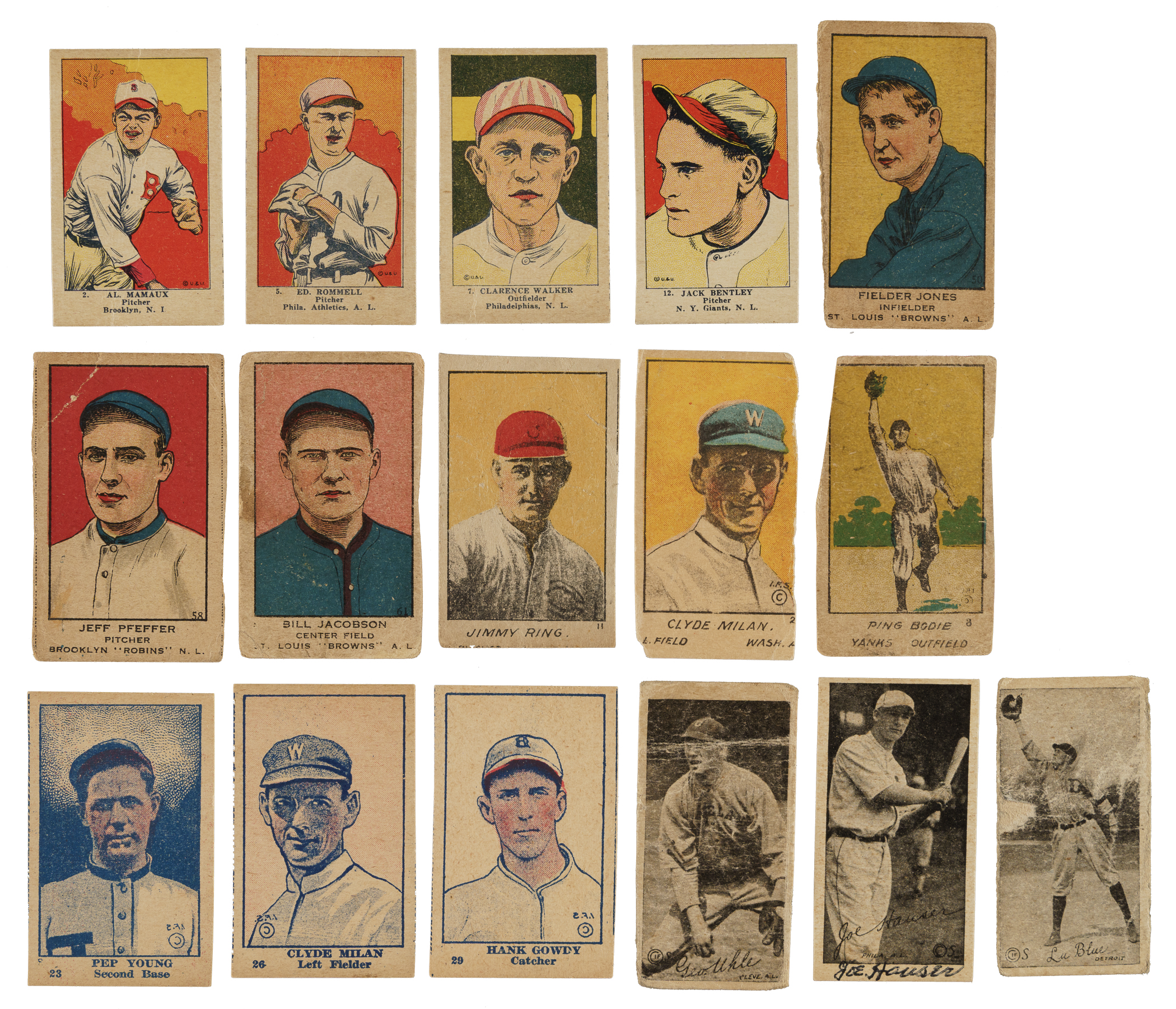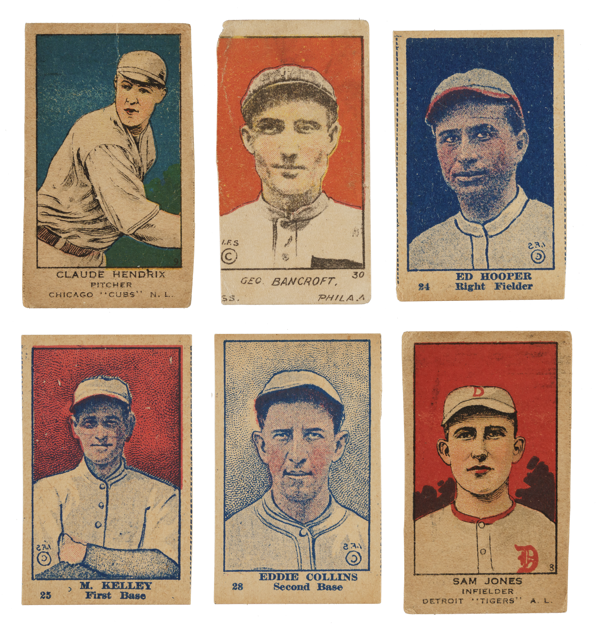 Collection of twenty-two 1920 to 1923 Strip-Cards, highlighted by Eddie Collins. All the grades in the following condition composite are without respect to the neatness of the cut, as some of the cards are cut inside of the borders and would only qualify for "Authentic" if submitted for professional grading. This collection consists of the following: 1) 1919-1921 W514 (5 cards): #8 (Gd+), 9 (Pr), 50 (Fr-Gd), 58 (Pr), and 61 (Pr due mostly to pen on reverse). 2) 1920 W516-1 (3 cards): #11 (Pr), 25 (Pr), and 30 Bancroft (Pr). 3) 1920-1921 W516-2-1 (6 cards): #23 (Vg-Ex), 24 Hooper (Vg), 25 Kelley (Ex), 26 (Ex-Mt), 28 E. Collins (Ex), and 29 (Vg-Ex). 4) 1920-1921 W516-2-2 (1 card): #8 (Pr). 5) 1923 W515 (4 cards): #2 (Pr-Fr), 5 (Pr-Fr), 7 (Pr), and 12 (Pr due mostly to pieces of tape on reverse). 6) 1923 W572 (3 cards): Blue (Pr), Hauser (writing in pen, otherwise Ex), and Uhle (Pr). Total: 22 cards.