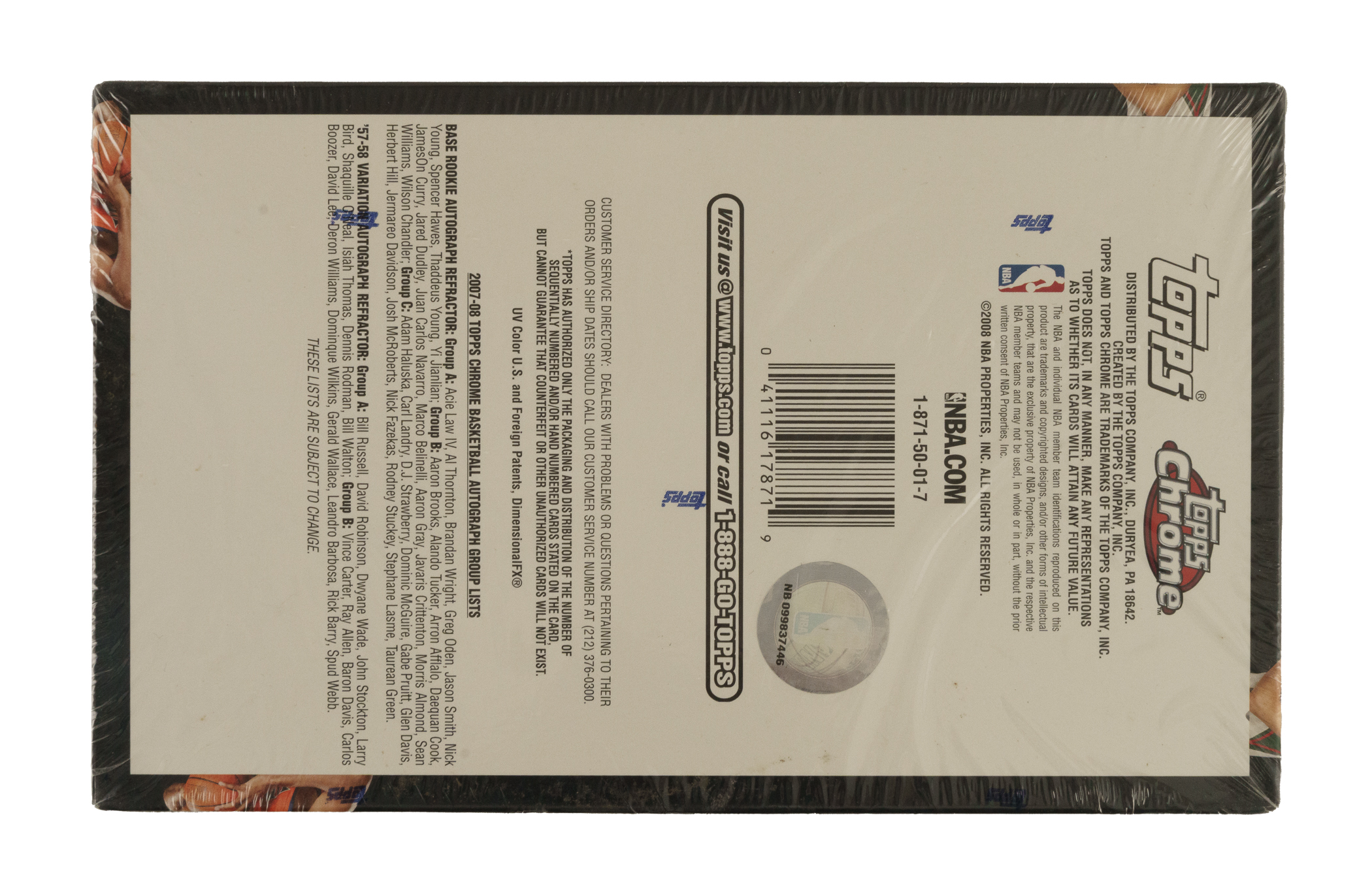 Presented is an original unopened hobby box of 2007-2008 Topps Chrome Basketball with twenty-four packs that each contain four cards for a total of 96 cards. The entire box comes factory shrink-wrapped by Topps. The set is highlighted by the rookie card of Kevin Durant along with numerous other prospects and veterans alike. Within each box, there is one rookie autograph card. An outstanding unopened hobby box from this popular, modern basketball issue.