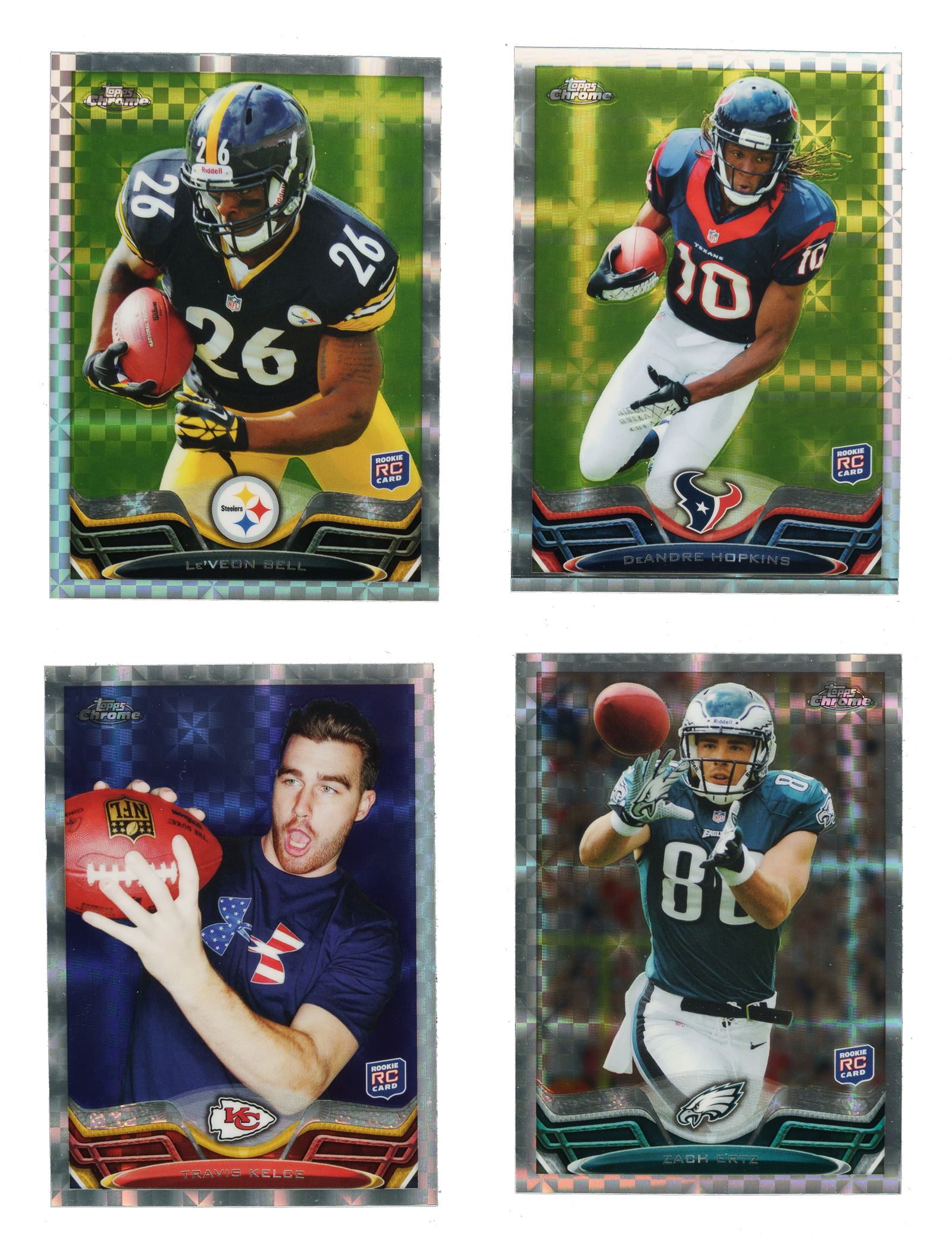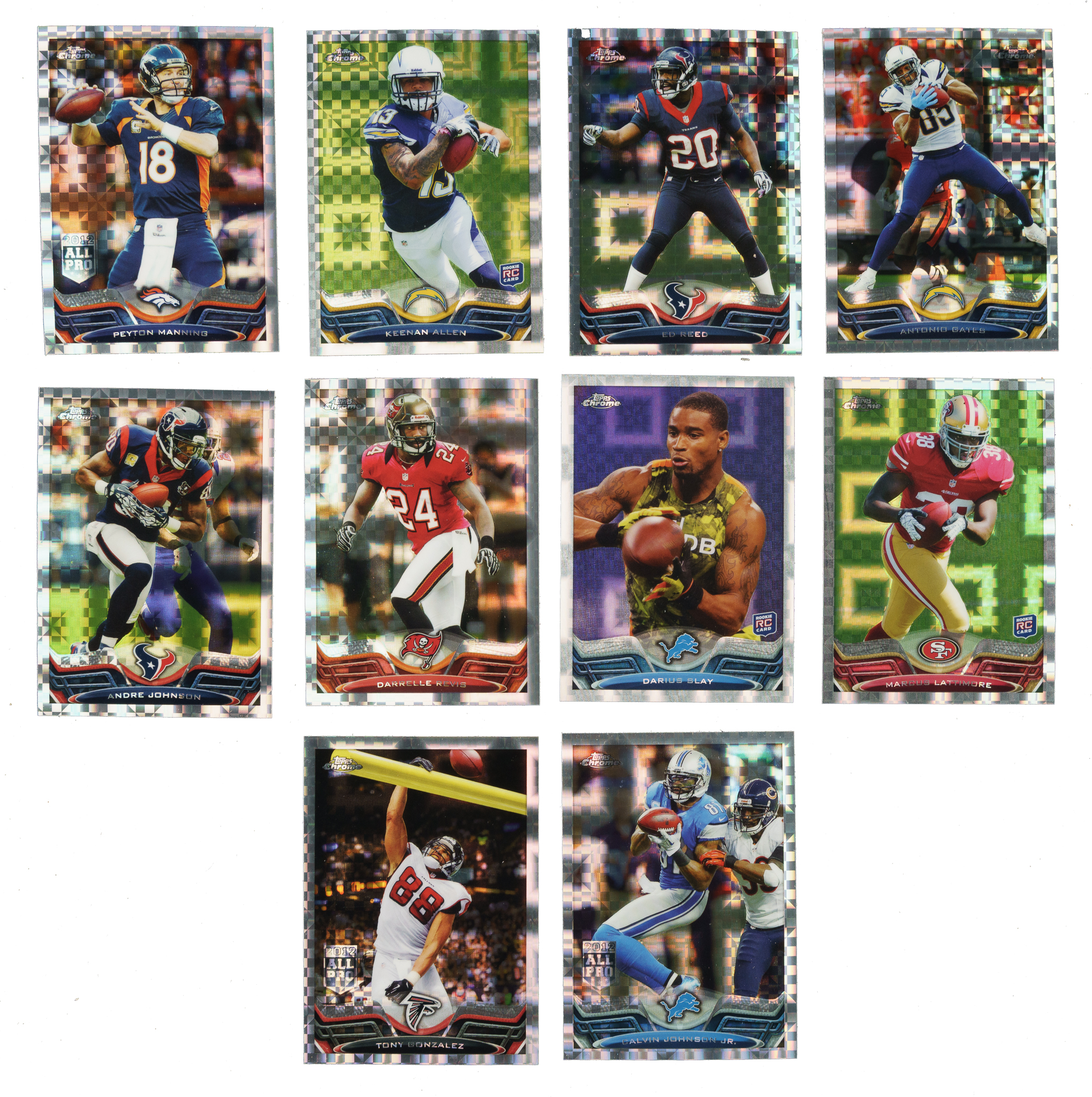Presented is a complete 230-card set of 2013 Topps Chrome Football Xfractors, highlighted by Travis Kelce and DeAndre Hopkins rookie cards. Condition ranges from Ex-Mt to Mint (averaging Nr/Mt/Nr/Mt-Mt). Keys: #1 P. Manning (Ex-Mt), 14 Allen RC (Nr/Mt+), 34 Reed (Nr/Mt-Mt), 51 Gates (Nr/Mt-Mt), 76 Ertz RC (Nr/Mt-Mt), 85 A. Johnson (Nr/Mt-Mt), 118 Kelce RC (Nr/Mt-Mt+), 154 Hopkins RC (Nr/Mt-Mt), 160 Revis (Ex-Mt+), 167 Slay RC (Nr/Mt-Mt+), 170 Lattimore RC (Mint), 180 Gonzalez (Ex-Mt), 198 Bell RC (Mint), and 200 C. Johnson (Nr/Mt-Mt). Total: 230 cards. The size/weight of this item requires that there will be an additional shipping charge for this lot.