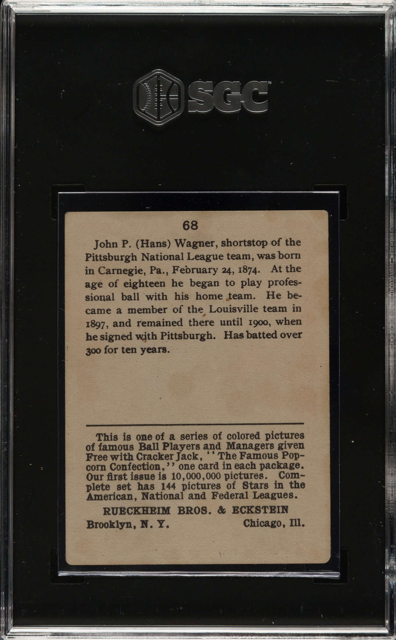 Graded VG 3 by SGC. The 1914 Cracker Jack is understandably one of Honus Wagner's most striking and popular cards. The "Flying Dutchman" is one of the big four key cards in the set, along with Cobb, Mathewson, and Jackson. This well-centered card has an extremely bold red background, outstanding registration, and moderate corner wear. Bright and clean, both front and back, with faint hints of caramel staining (which is usually found on #144 series cards). There is a tiny crease visible just below the top-left corner. The 1914 Cracker Jacks, of course, are far rarer to find in high grade than their 1915 counterparts, because the 1914 #144 series cards were issued only in boxes of Cracker Jack. This card would be a highlight addition to any collection of Cracker Jack, Honus Wagner, or vintage Hall of Fame cards.