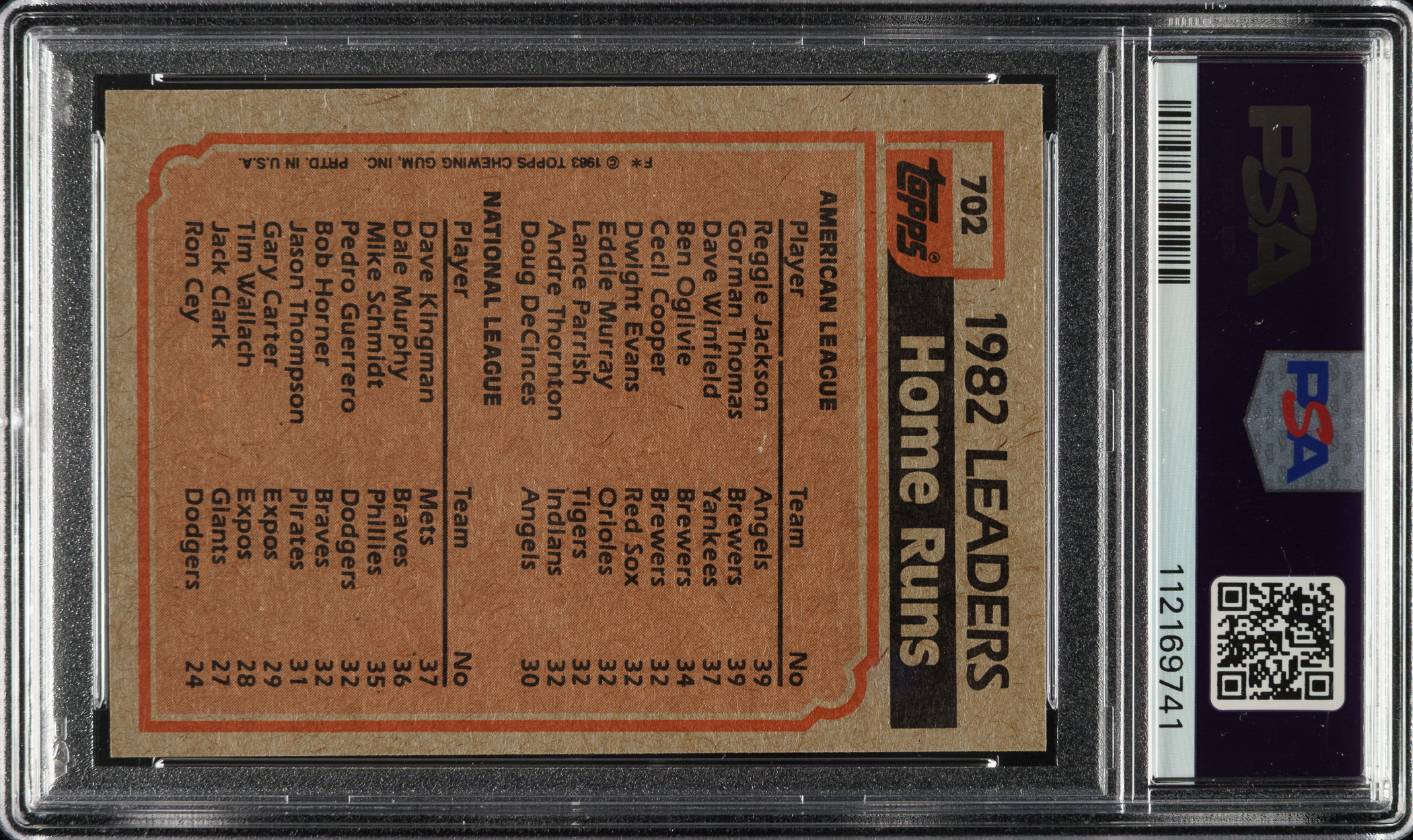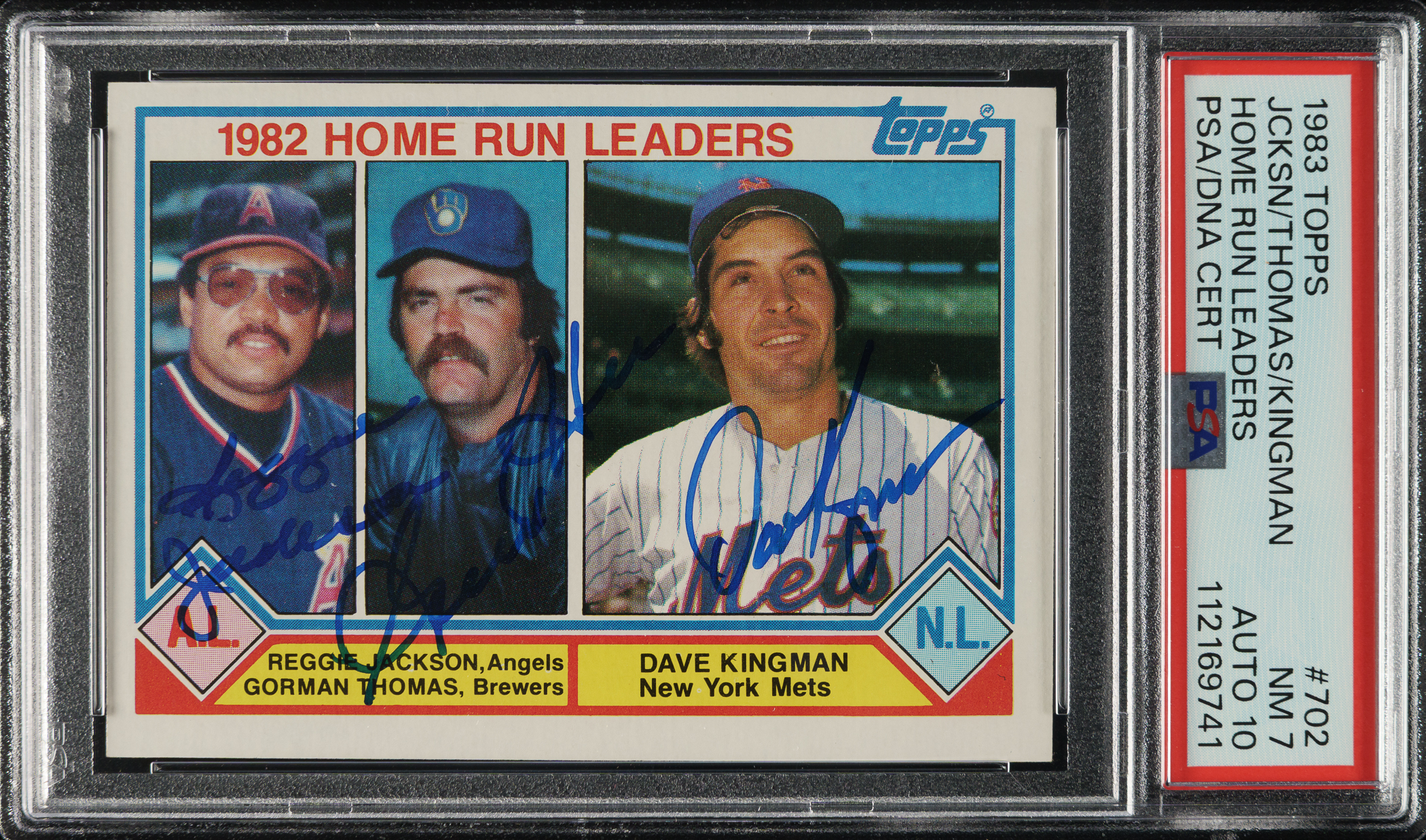 Signed 1983 Topps #702 Home Run Leaders with Reggie Jackson, Gorman Thomas and Dave Kingman PSA NM 7 with GEM MINT 10 Signatures