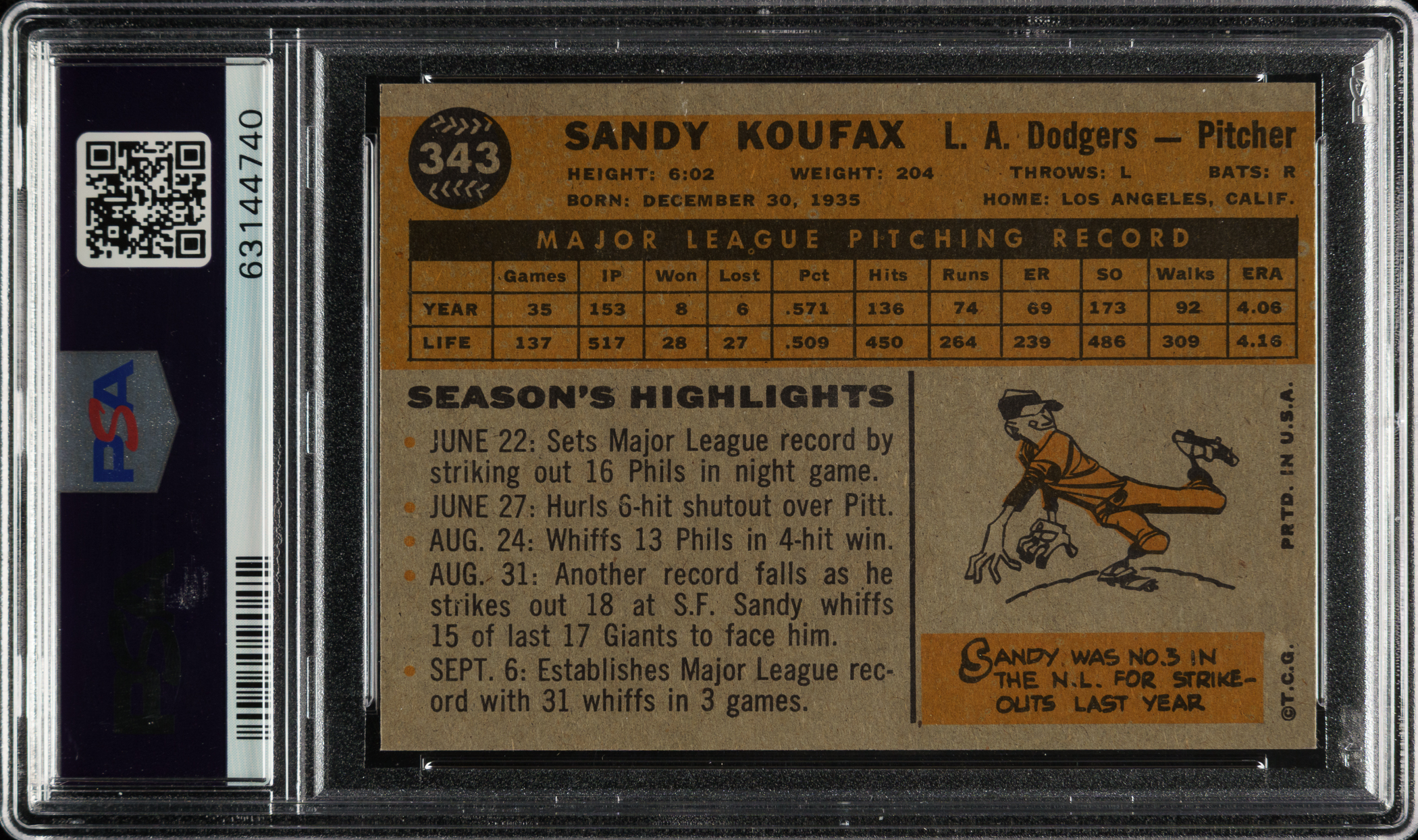 1960 Topps #343 Sandy Koufax PSA MINT 9