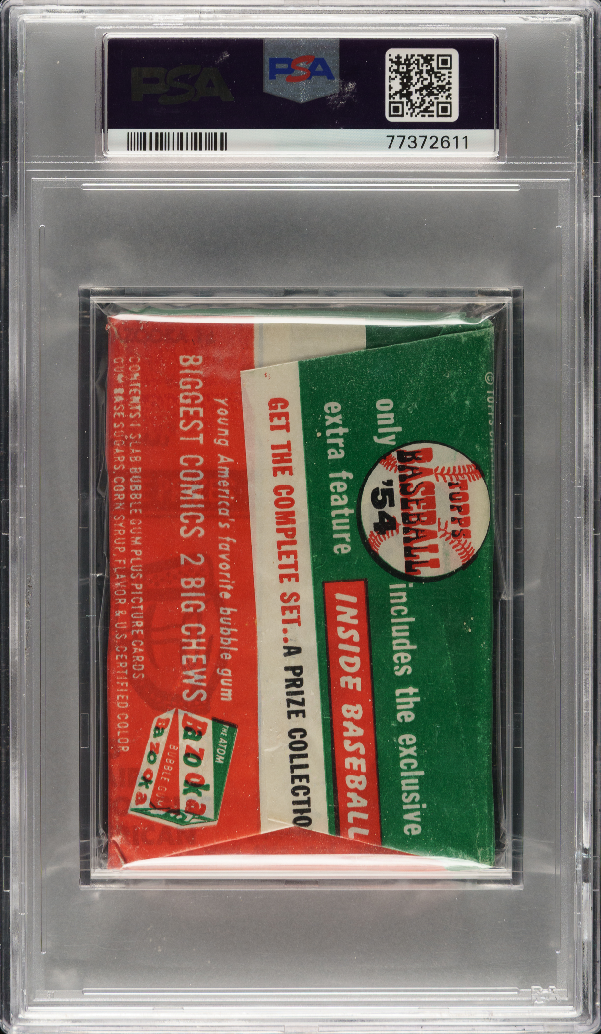 Graded EX-MT 6 by PSA. Presented is a rare, unopened 1954 Topps five-cent wax pack ("dated" variation) with six cards inside. The offered pack has miraculously survived more than 70 years and continues to display bright colors and a tight seal. As is common with packs from this era, moderate corner wear (including a small tear on the upper left) is present and the gum inside is broken. These packs are, of course, very rare, and this is one of the few survivors from the glory days of baseball cards of the early 1950s. This is without a doubt one of the most impressive unopened packs we have ever had the privilege of offering, and it is one that we are confident will be a worthy addition to even the most advanced 1954 Topps or unopened wax pack collection.