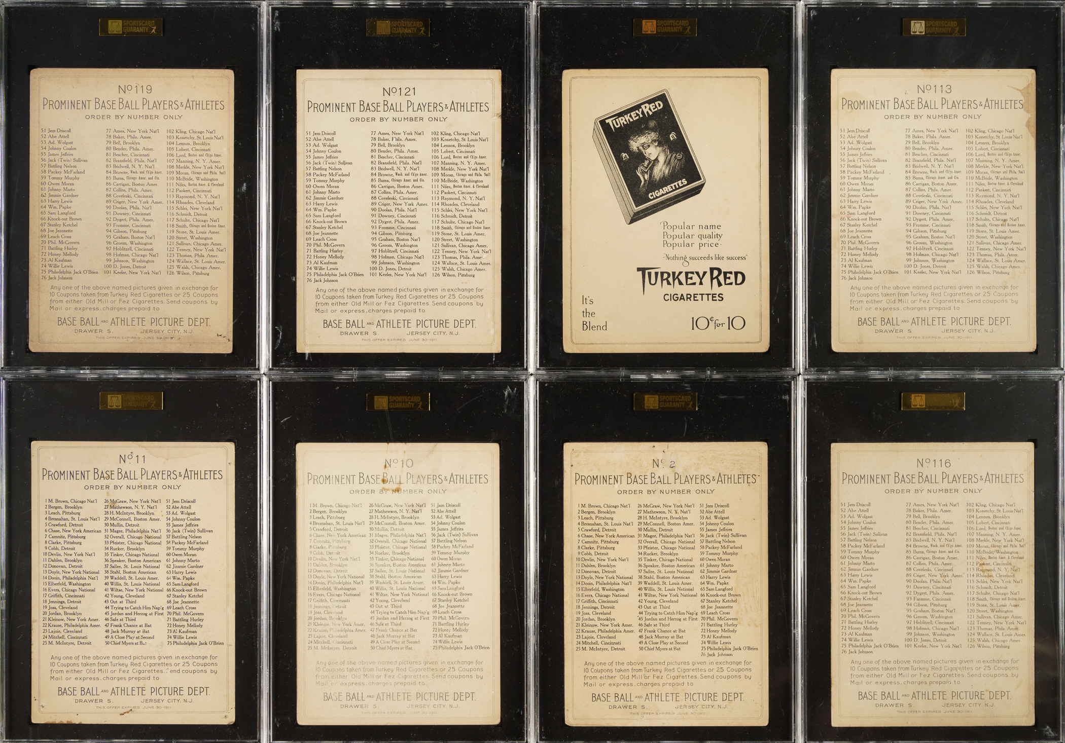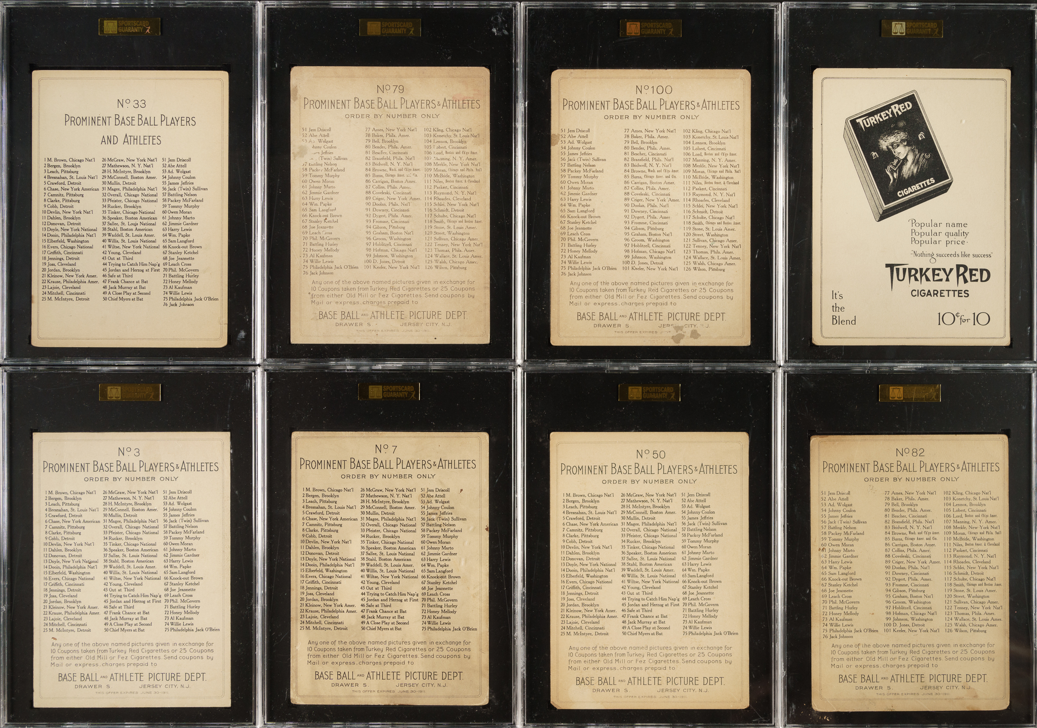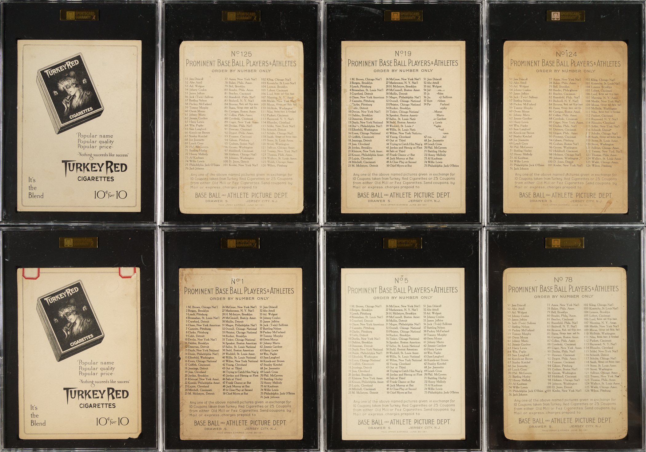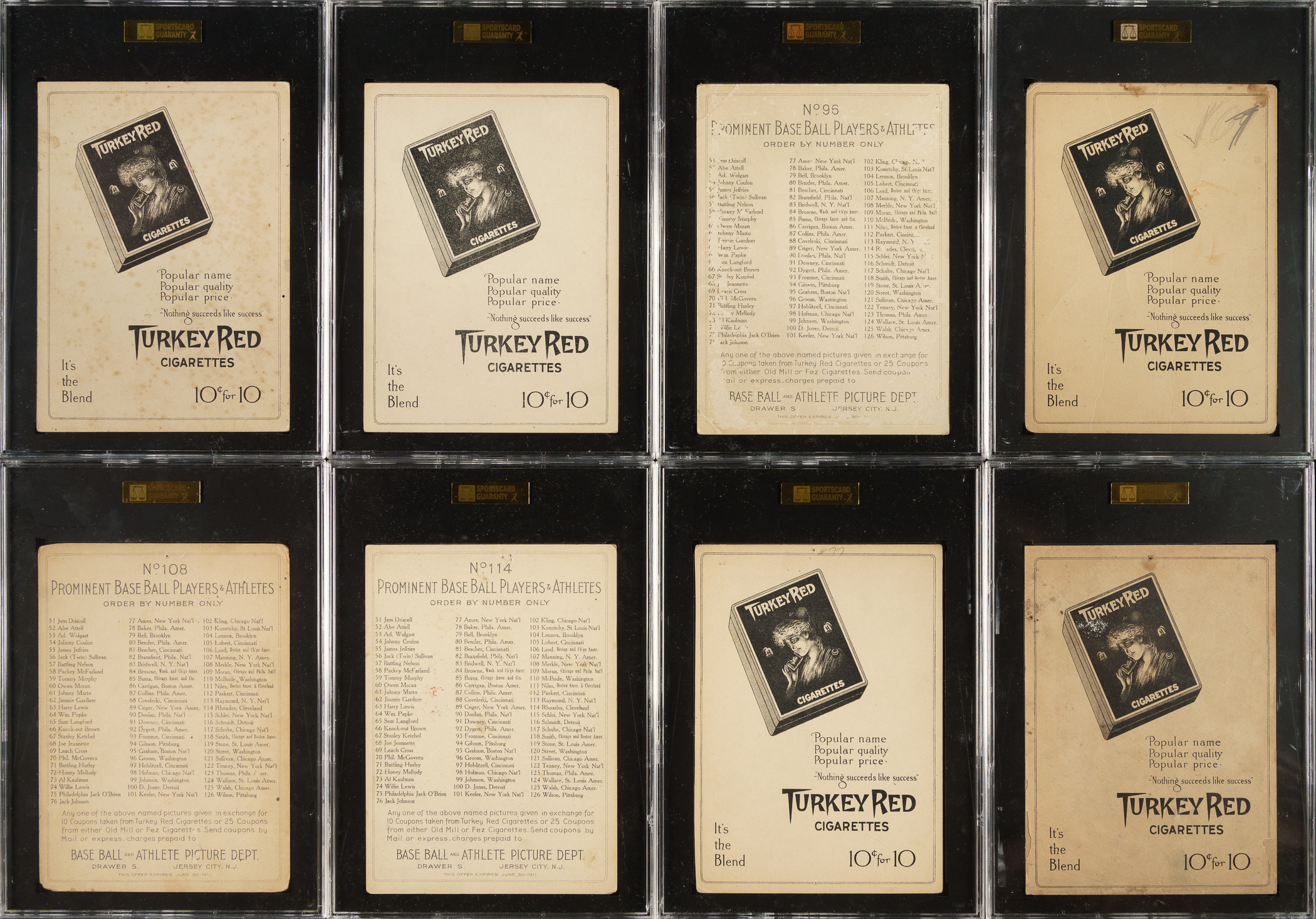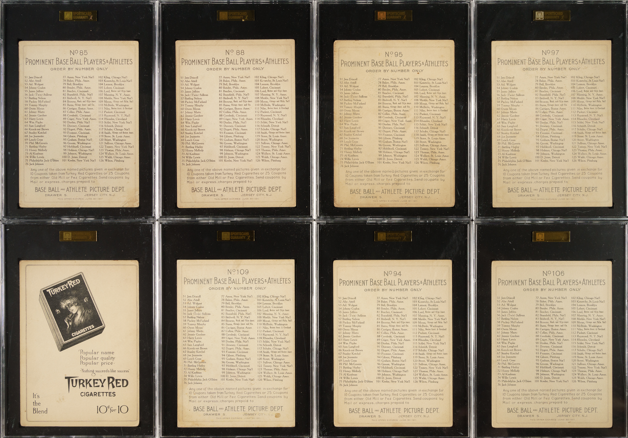 Offered here is a very presentable mixed-grade T3 Turkey Red complete set, assembled by a long-time collector over a period of many years. Turkey Red cabinet cards are one of the most highly prized of all tobacco issues, and are rarely offered as a complete set. They were available only by mail in exchange for coupons packaged with Turkey Red Cigarettes. Because Turkey Reds are large cards that are easily damaged, they are particularly difficult to find in high grade. This lot includes all 100 baseball players (#1-50 and #77-126) plus all four variations (#28, 90, 112, and 122) for a total of 104 cards. Each card has been professionally graded and encapsulated by SGC. At the time the SGC Registry was discontinued , this was the only fully completed T3 Master Set and the third highest ranked T3 set in terms of quality. Seventeen cards have a Turkey Red advertisement on the backs, one card has a rare checklist (no offer) back, while the balance are checklist (with offer) backs.