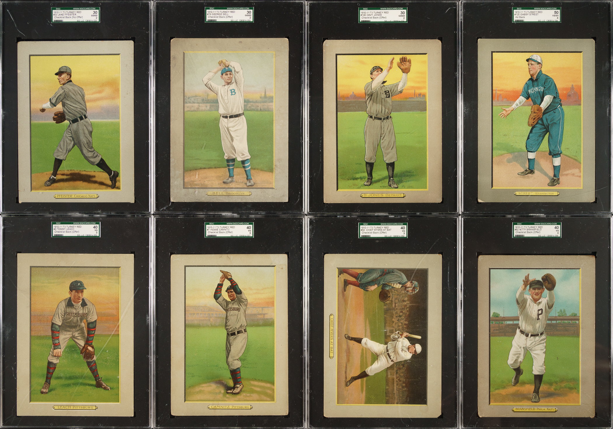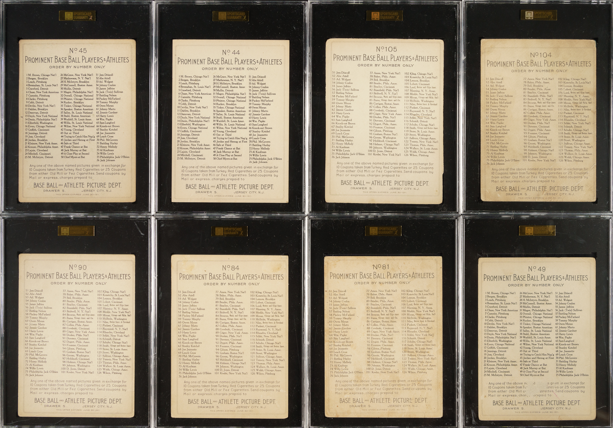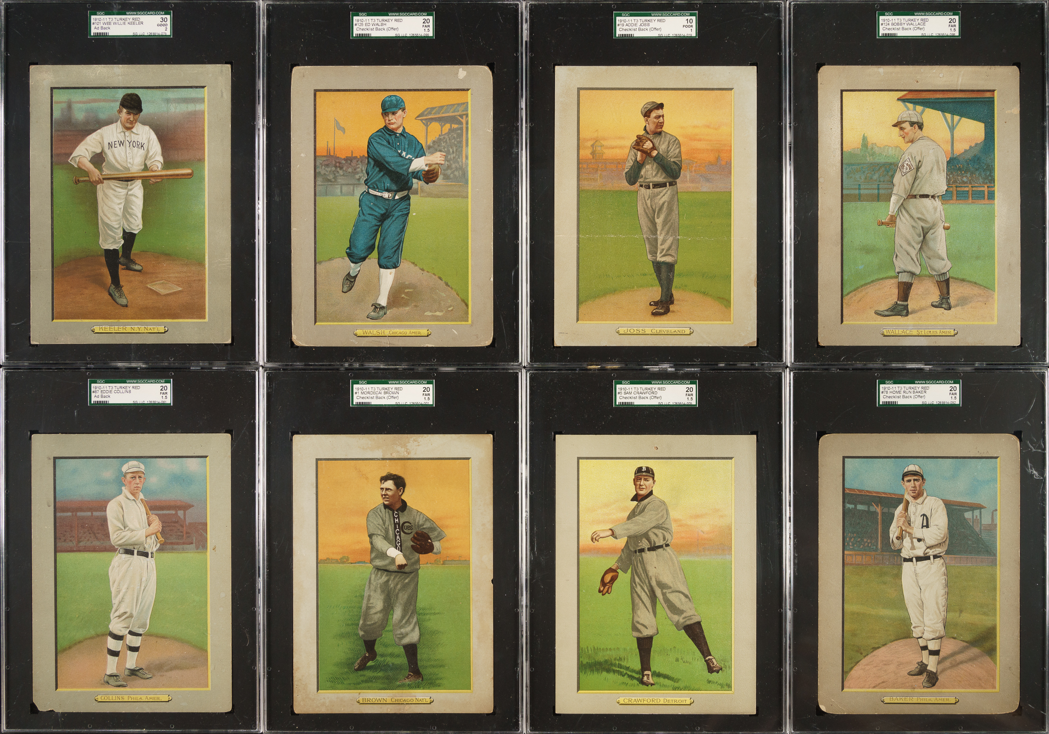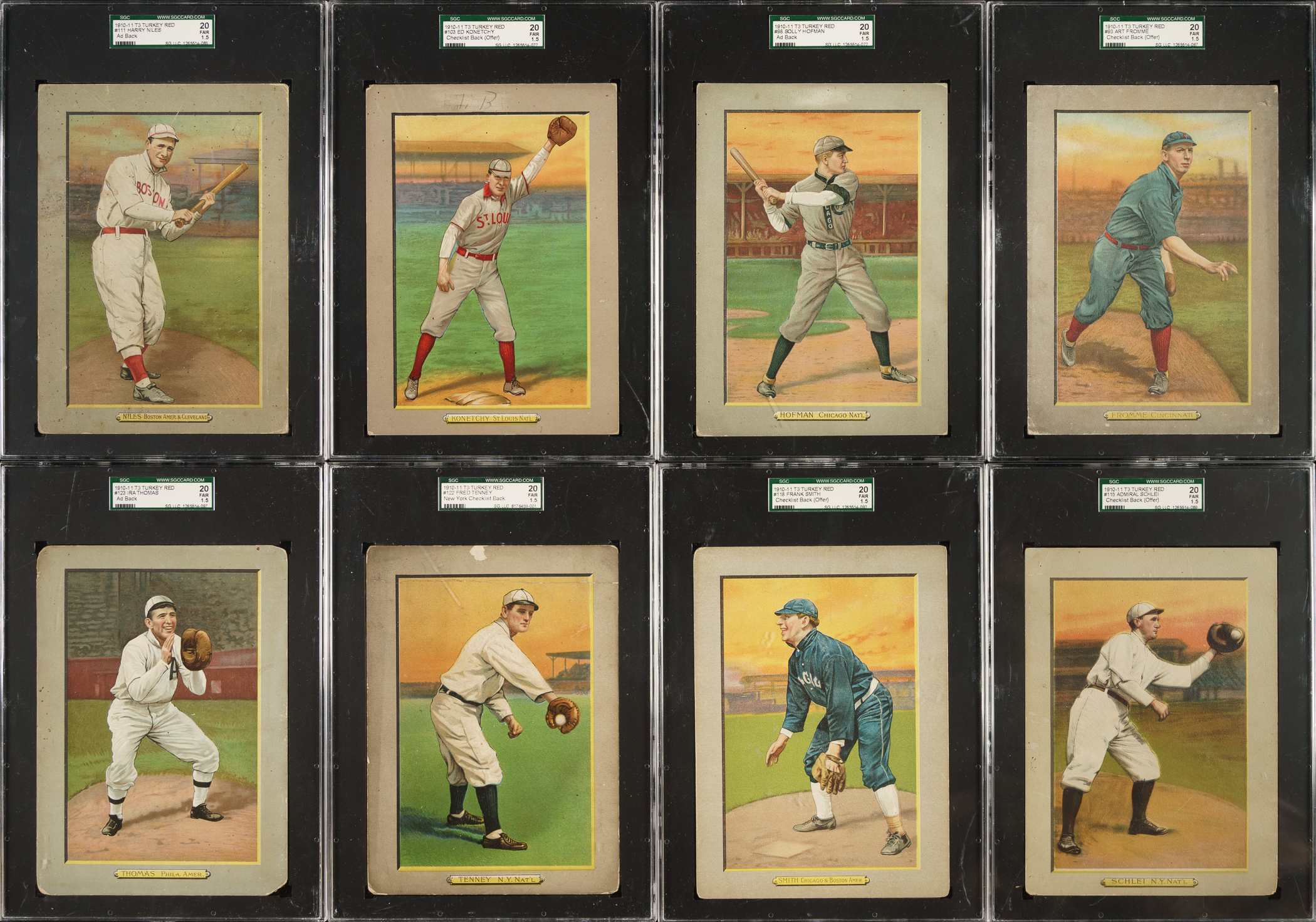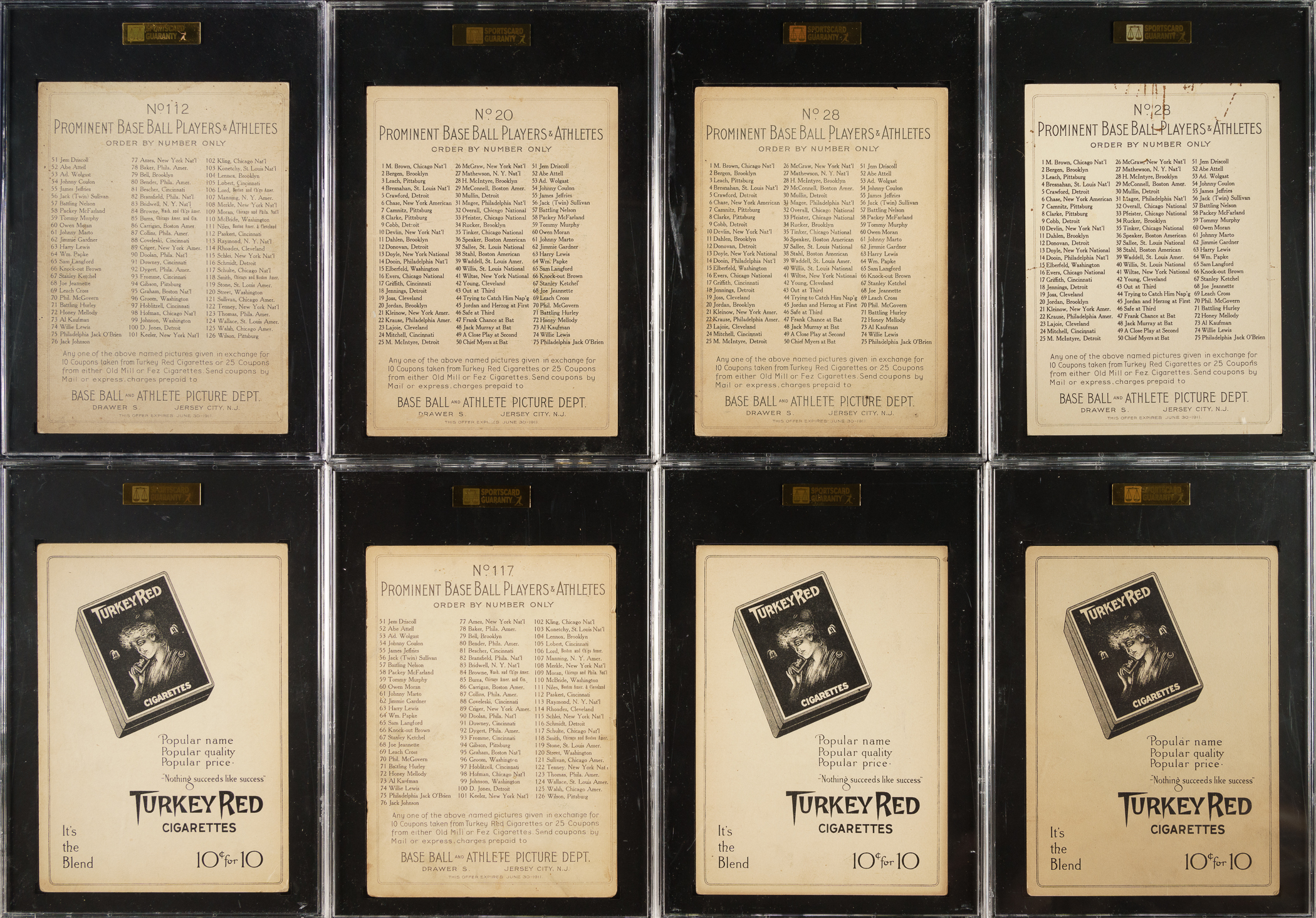 Offered here is a very presentable mixed-grade T3 Turkey Red complete set, assembled by a long-time collector over a period of many years. Turkey Red cabinet cards are one of the most highly prized of all tobacco issues, and are rarely offered as a complete set. They were available only by mail in exchange for coupons packaged with Turkey Red Cigarettes. Because Turkey Reds are large cards that are easily damaged, they are particularly difficult to find in high grade. This lot includes all 100 baseball players (#1-50 and #77-126) plus all four variations (#28, 90, 112, and 122) for a total of 104 cards. Each card has been professionally graded and encapsulated by SGC. At the time the SGC Registry was discontinued , this was the only fully completed T3 Master Set and the third highest ranked T3 set in terms of quality. Seventeen cards have a Turkey Red advertisement on the backs, one card has a rare checklist (no offer) back, while the balance are checklist (with offer) backs.