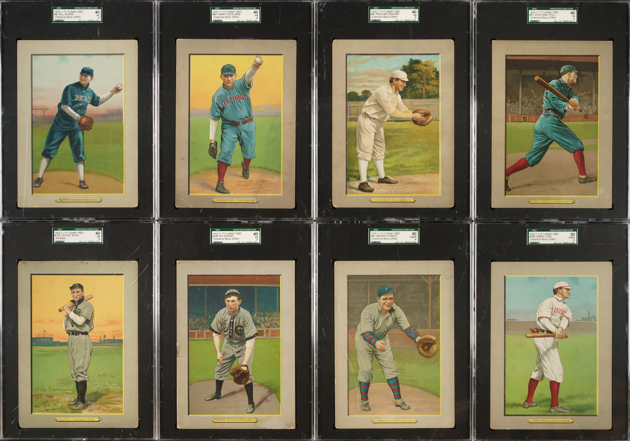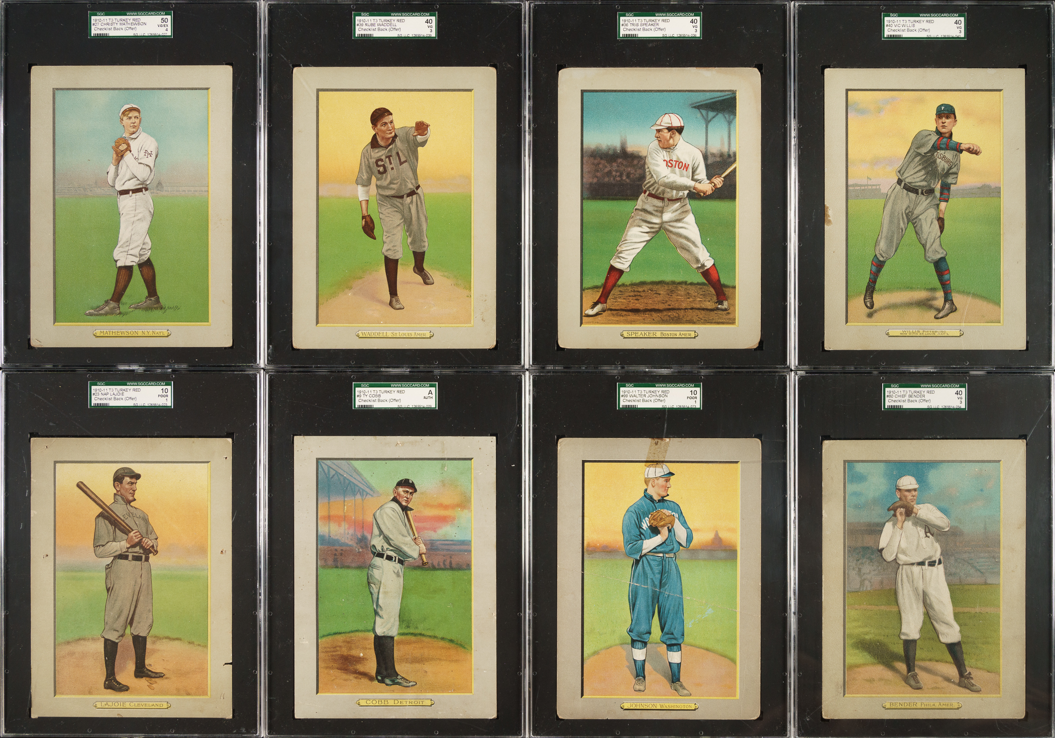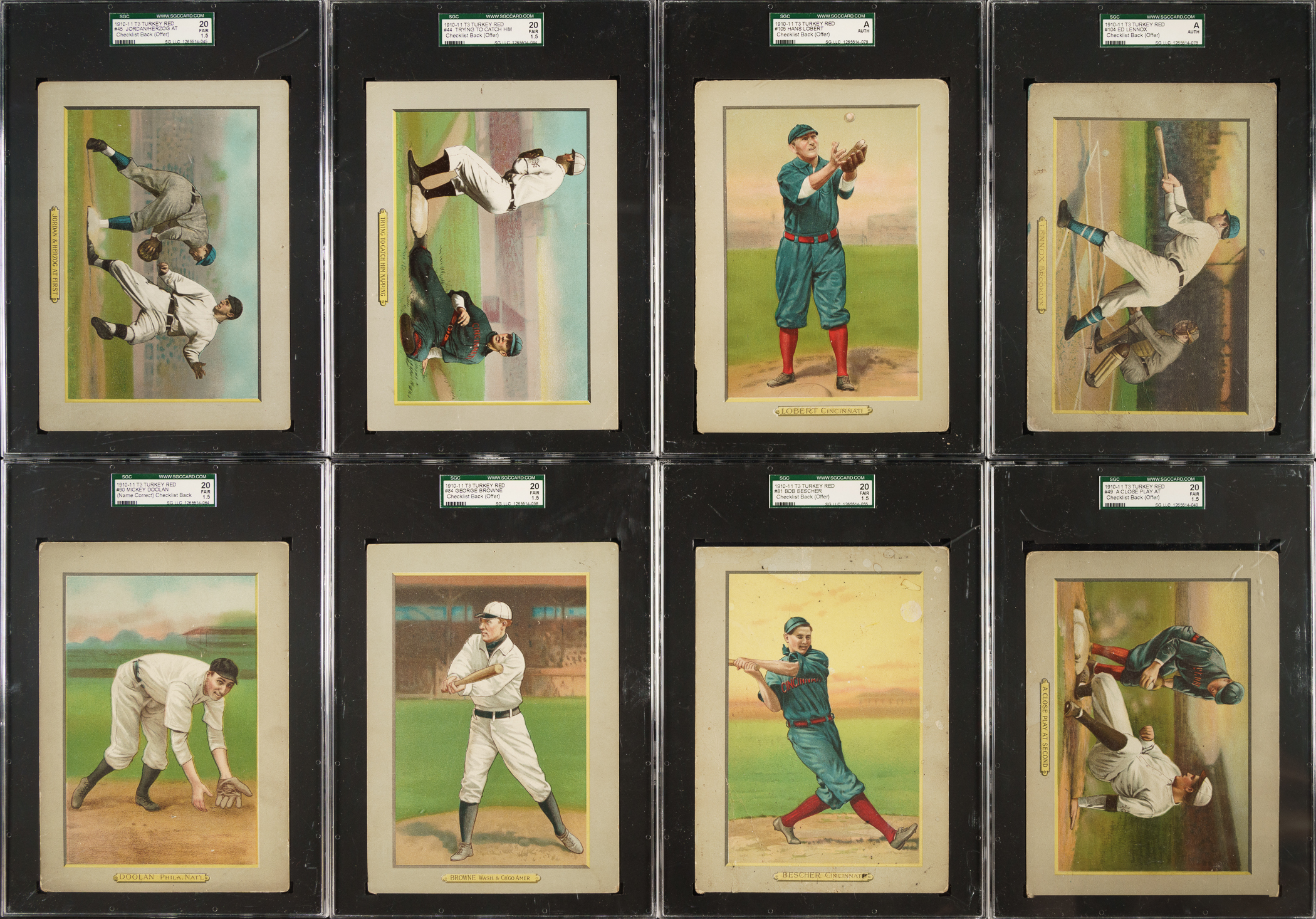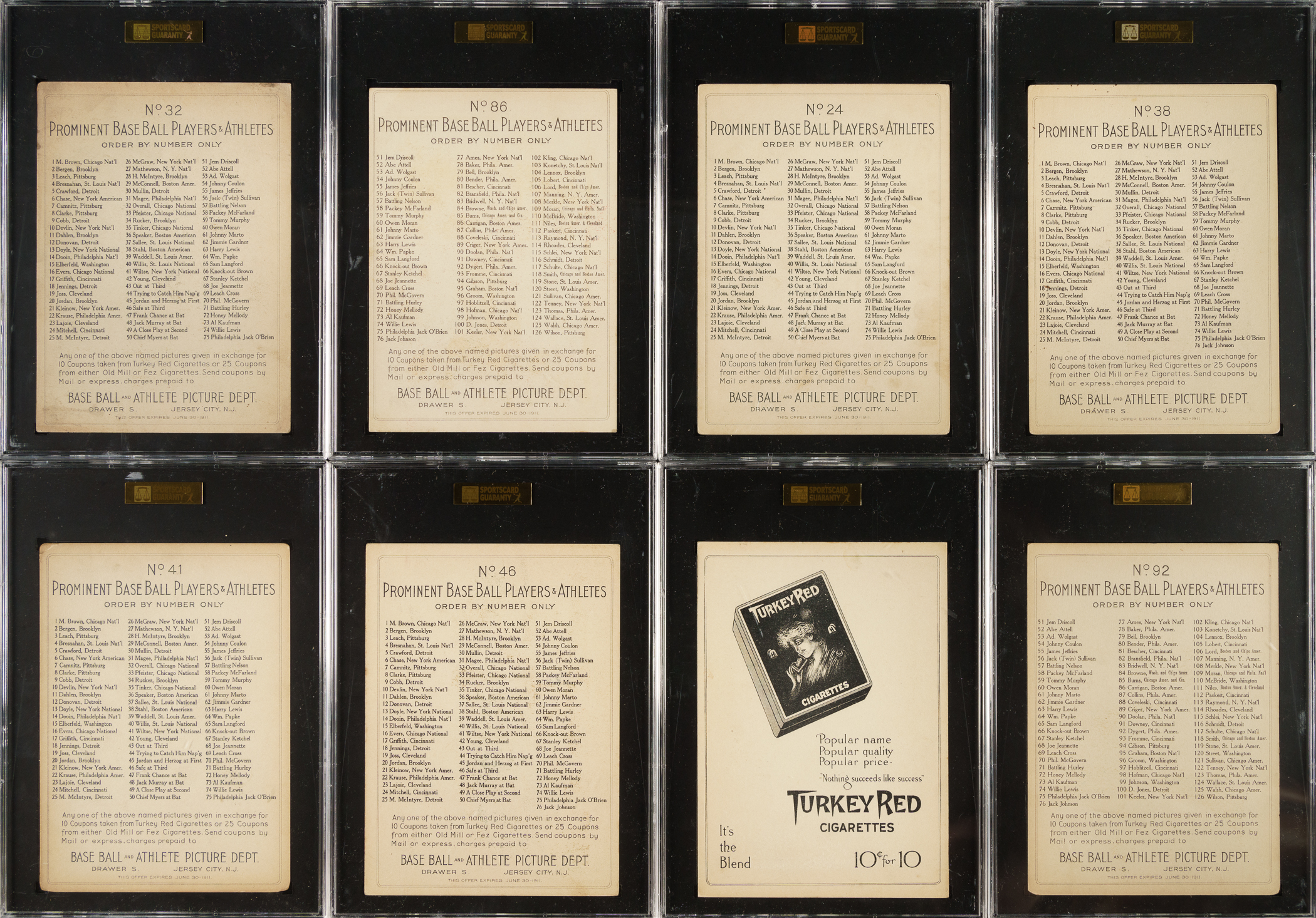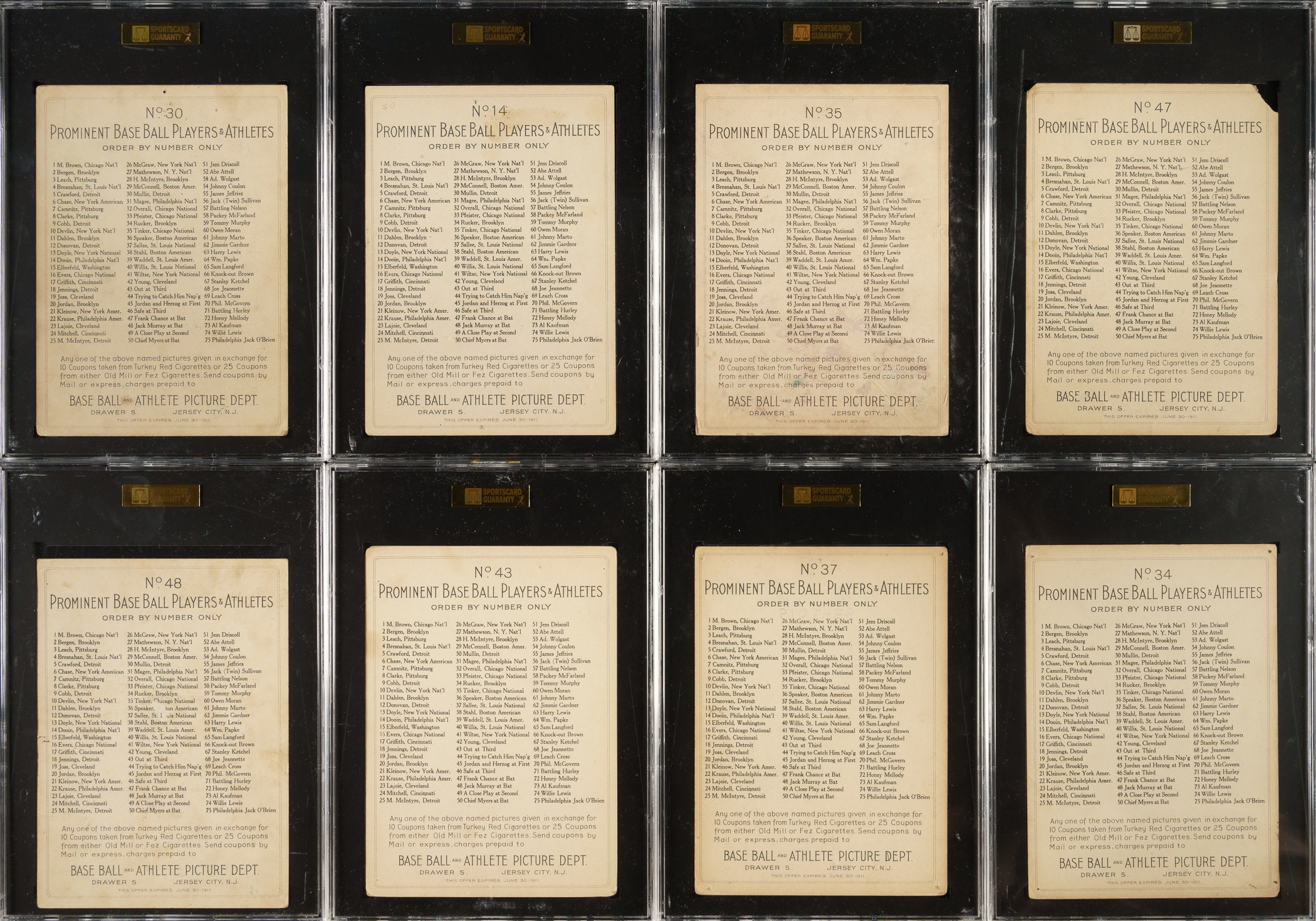 Offered here is a very presentable mixed-grade T3 Turkey Red complete set, assembled by a long-time collector over a period of many years. Turkey Red cabinet cards are one of the most highly prized of all tobacco issues, and are rarely offered as a complete set. They were available only by mail in exchange for coupons packaged with Turkey Red Cigarettes. Because Turkey Reds are large cards that are easily damaged, they are particularly difficult to find in high grade. This lot includes all 100 baseball players (#1-50 and #77-126) plus all four variations (#28, 90, 112, and 122) for a total of 104 cards. Each card has been professionally graded and encapsulated by SGC. At the time the SGC Registry was discontinued , this was the only fully completed T3 Master Set and the third highest ranked T3 set in terms of quality. Seventeen cards have a Turkey Red advertisement on the backs, one card has a rare checklist (no offer) back, while the balance are checklist (with offer) backs.