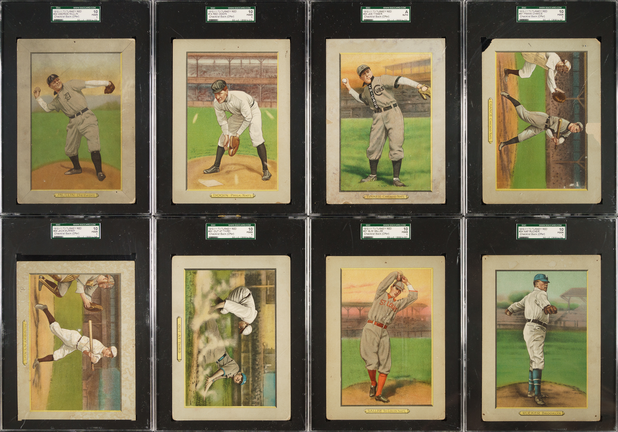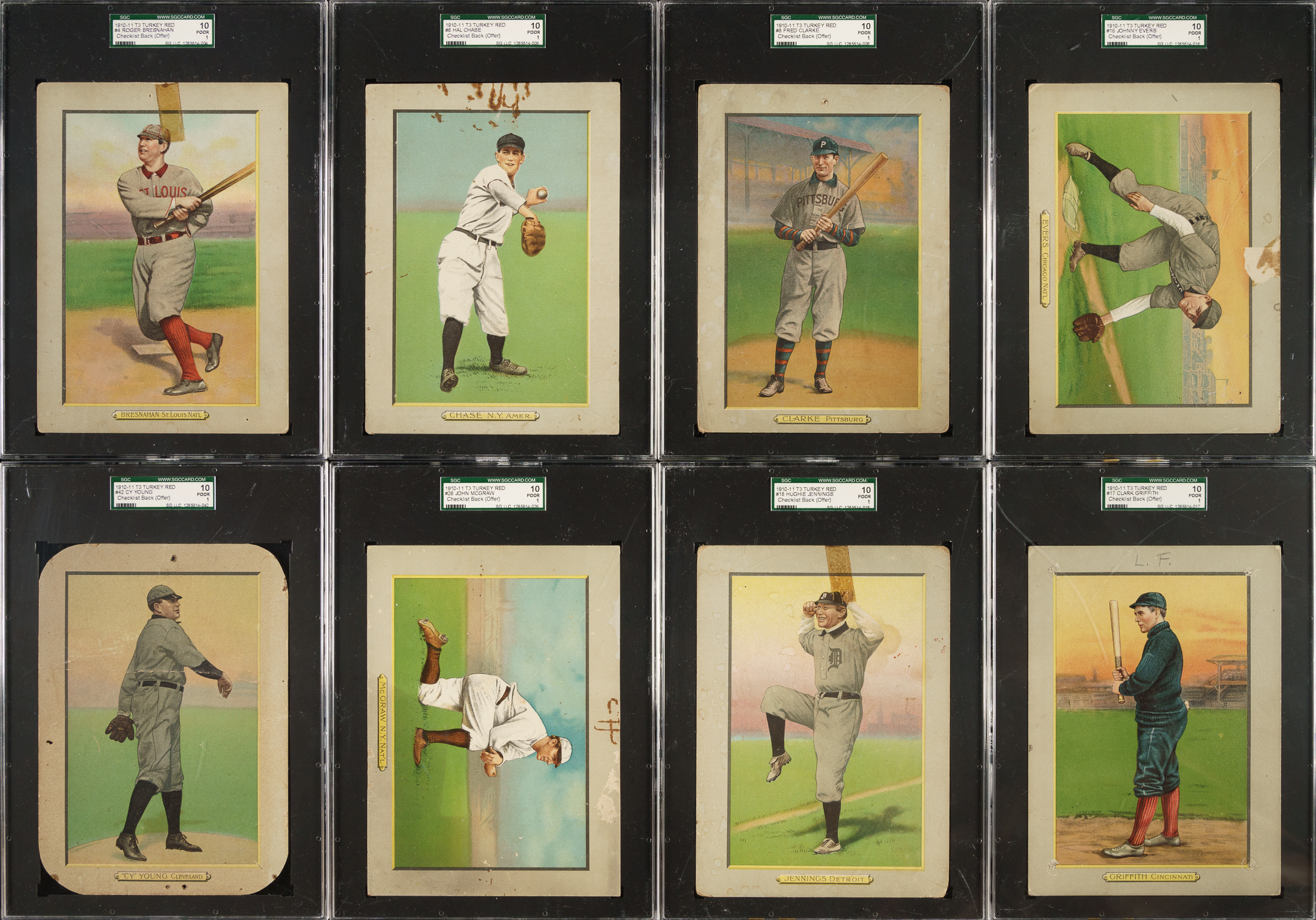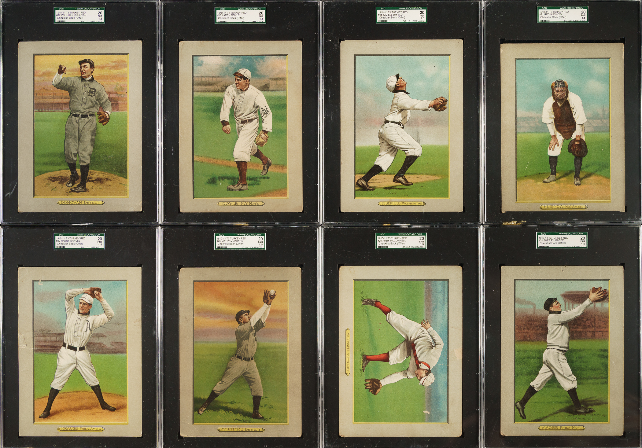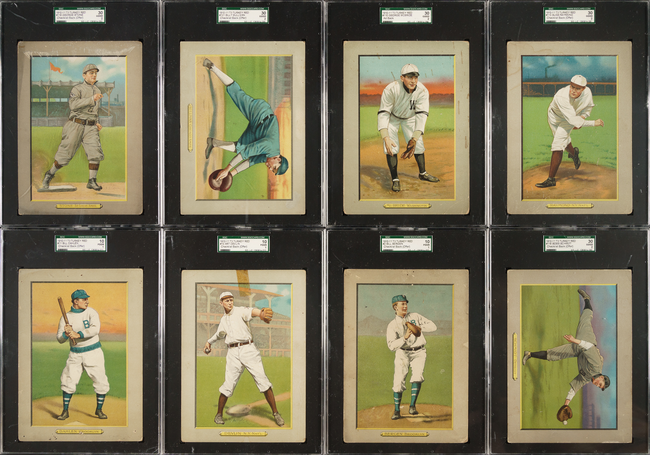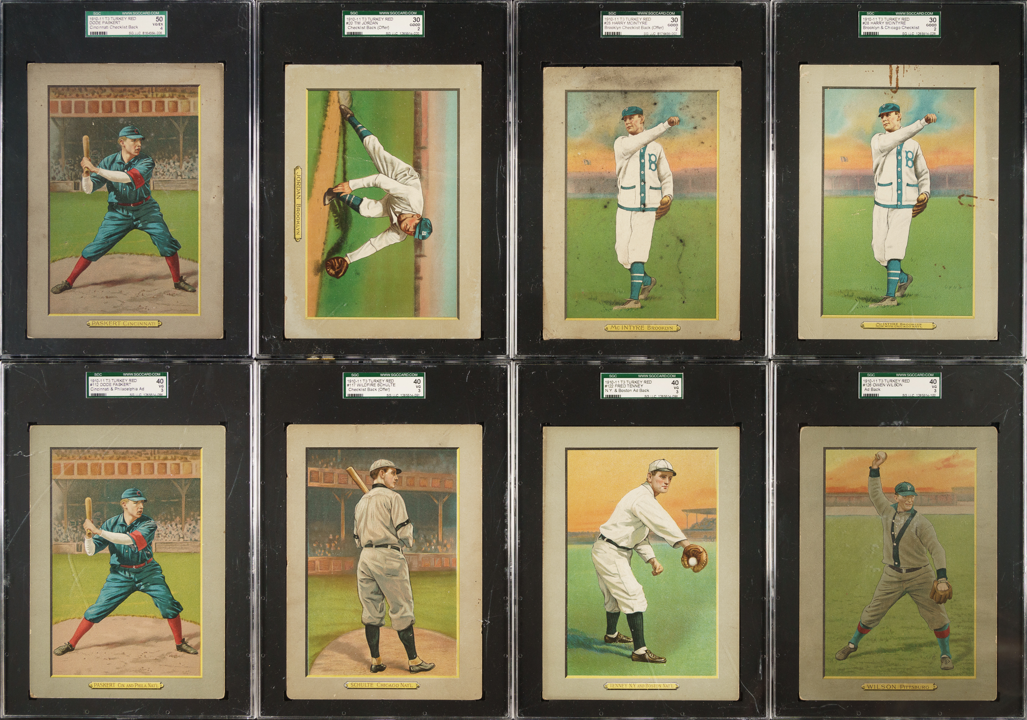 Offered here is a very presentable mixed-grade T3 Turkey Red complete set, assembled by a long-time collector over a period of many years. Turkey Red cabinet cards are one of the most highly prized of all tobacco issues, and are rarely offered as a complete set. They were available only by mail in exchange for coupons packaged with Turkey Red Cigarettes. Because Turkey Reds are large cards that are easily damaged, they are particularly difficult to find in high grade. This lot includes all 100 baseball players (#1-50 and #77-126) plus all four variations (#28, 90, 112, and 122) for a total of 104 cards. Each card has been professionally graded and encapsulated by SGC. At the time the SGC Registry was discontinued , this was the only fully completed T3 Master Set and the third highest ranked T3 set in terms of quality. Seventeen cards have a Turkey Red advertisement on the backs, one card has a rare checklist (no offer) back, while the balance are checklist (with offer) backs.