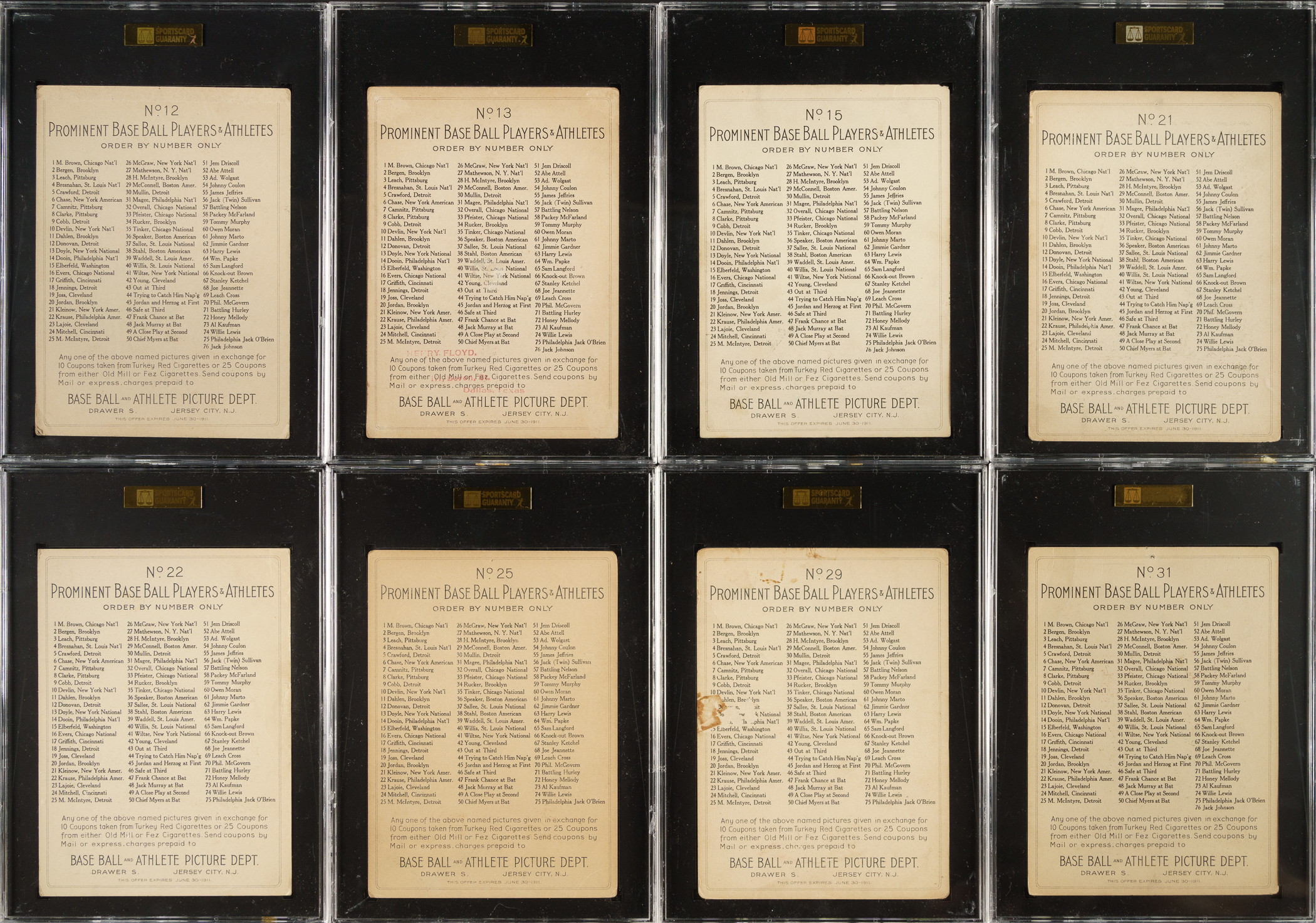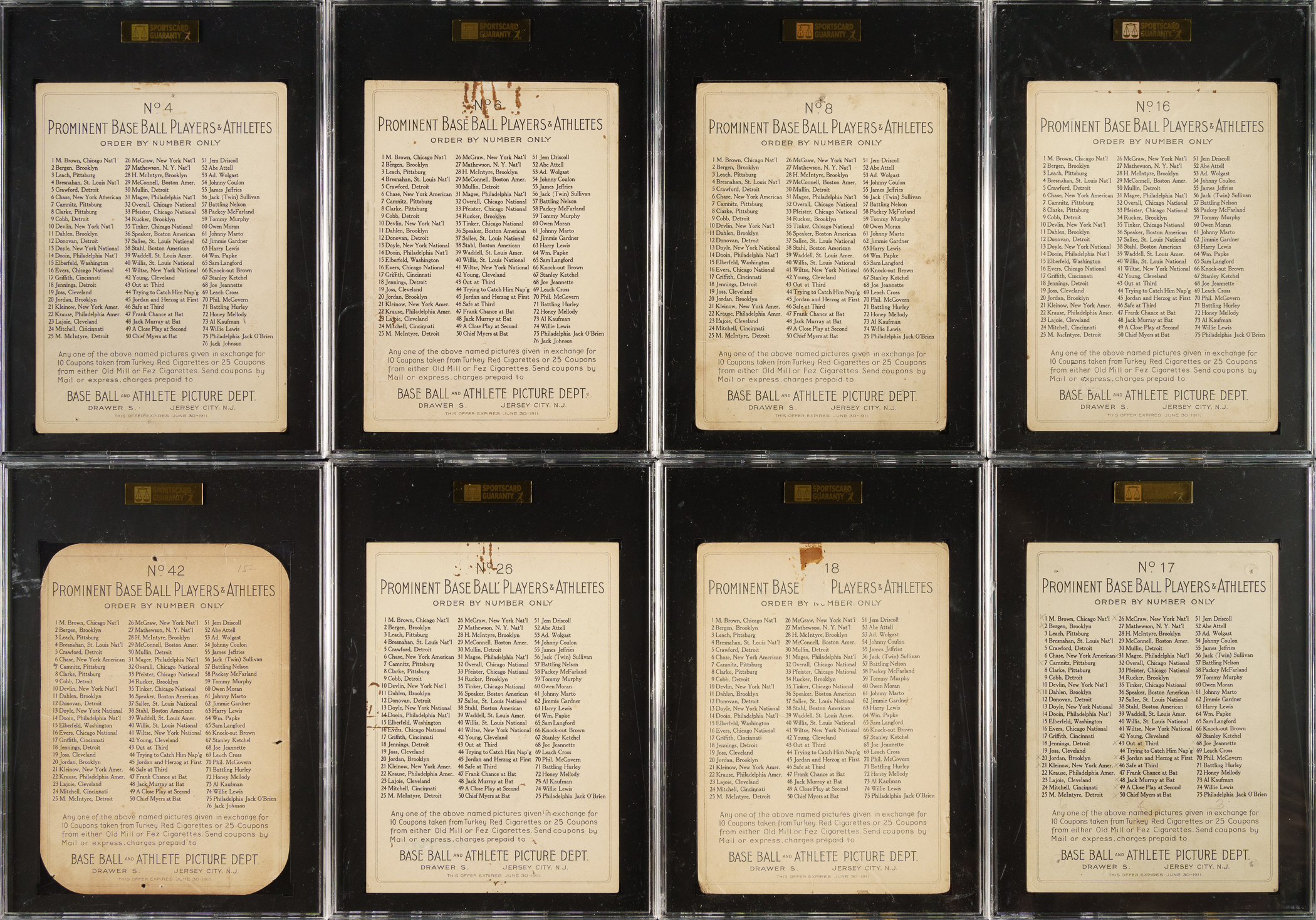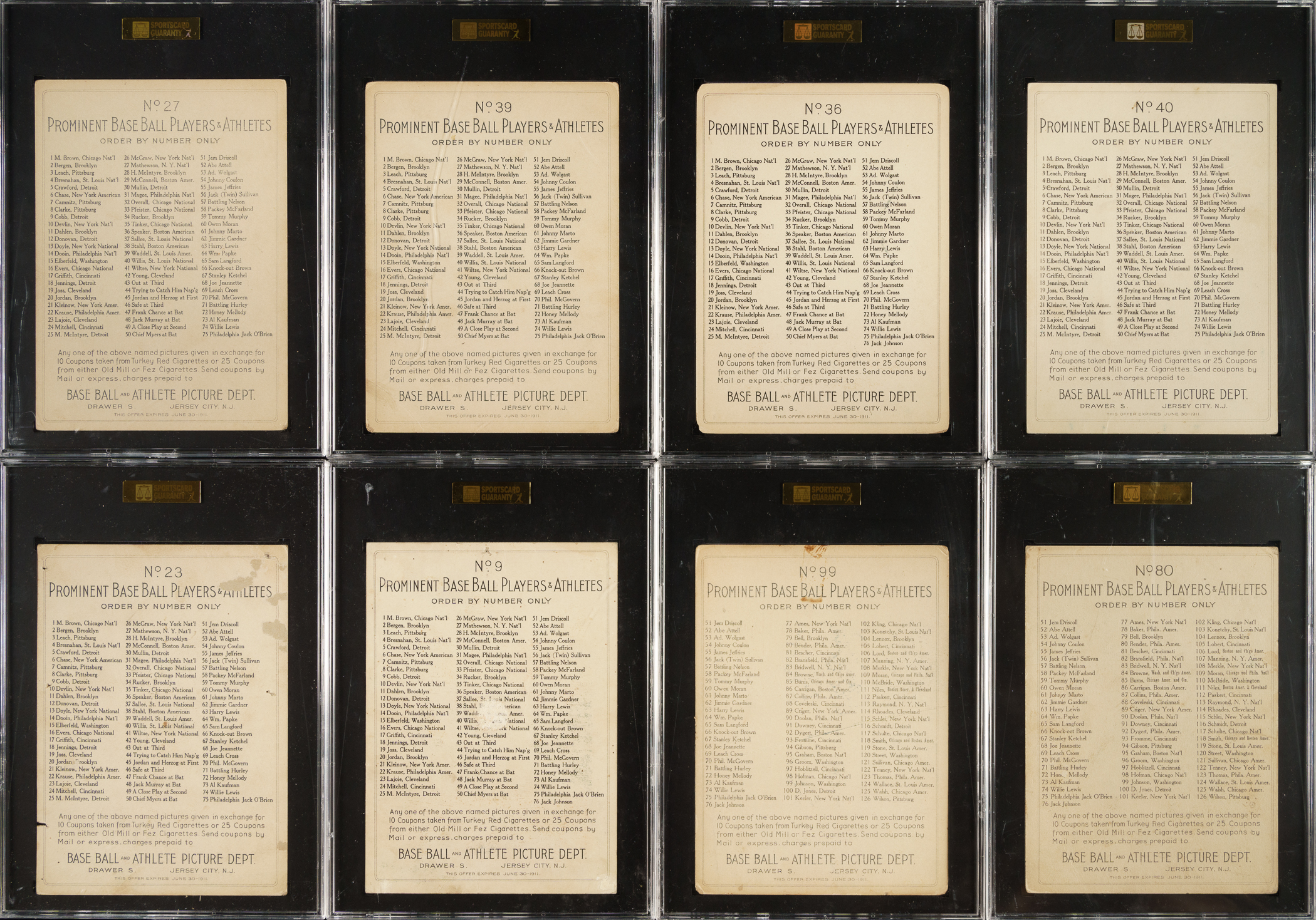 SGC Grading Composite: EX 60 (1 card): #86. VG/EX 50 (11 cards): #24, 27 Mathewson, 38, 41, 46, 89 (Ad Back), 92, 94, 106, 112 (Cincinnati), and 120 (Ad Back). VG 40 (18 cards): #3, 7, 36 Speaker, 39 Waddell, 40 Willis, 50, 80 Bender, 82, 85, 88, 95, 97, 102 (Ad Back), 109, 112 (Cincinnati & Philadelphia; Ad Back), 117, 122 (N.Y. and Boston; Ad Back), and 126 (Ad Back). GOOD 30 (12 cards): #20, 28 (Brooklyn), 28 (Brooklyn and Chicago), 33 (No Offer), 79, 100, 101 Keeler (Ad Back), 110 (Ad Back), 113, 116, 119, and 121. FAIR 20 (29 cards): #1 Brown, 5 Crawford, 12, 13, 15, 21, 22, 25, 29, 31, 32, 44, 45, 49, 78 Baker, 81, 84, 87 Collins (Ad Back), 90, 93, 98 (Ad Back), 103, 111 (Ad Back), 115, 118, 122, 123 (Ad Back), 124 Wallace, and 125 Walsh. POOR 10 (27 cards): #2, 4 Bresnahan, 6 Chase, 8 Clarke, 10, 11, 14, 16 Evers, 17 Griffith, 18 Jennings, 19 Joss, 23 Lajoie, 26 McGraw, 30, 34, 37, 42 Young, 43, 47 Chance, 48, 90 (Ad Back), 91 (Ad Back), 96, 99 Johnson, 107 (Ad Back), 108, and 114. Authentic (6 cards): #9 Cobb, 35 Tinker, 77 (Ad Back), 83 (Ad Back), 104, and 105.
