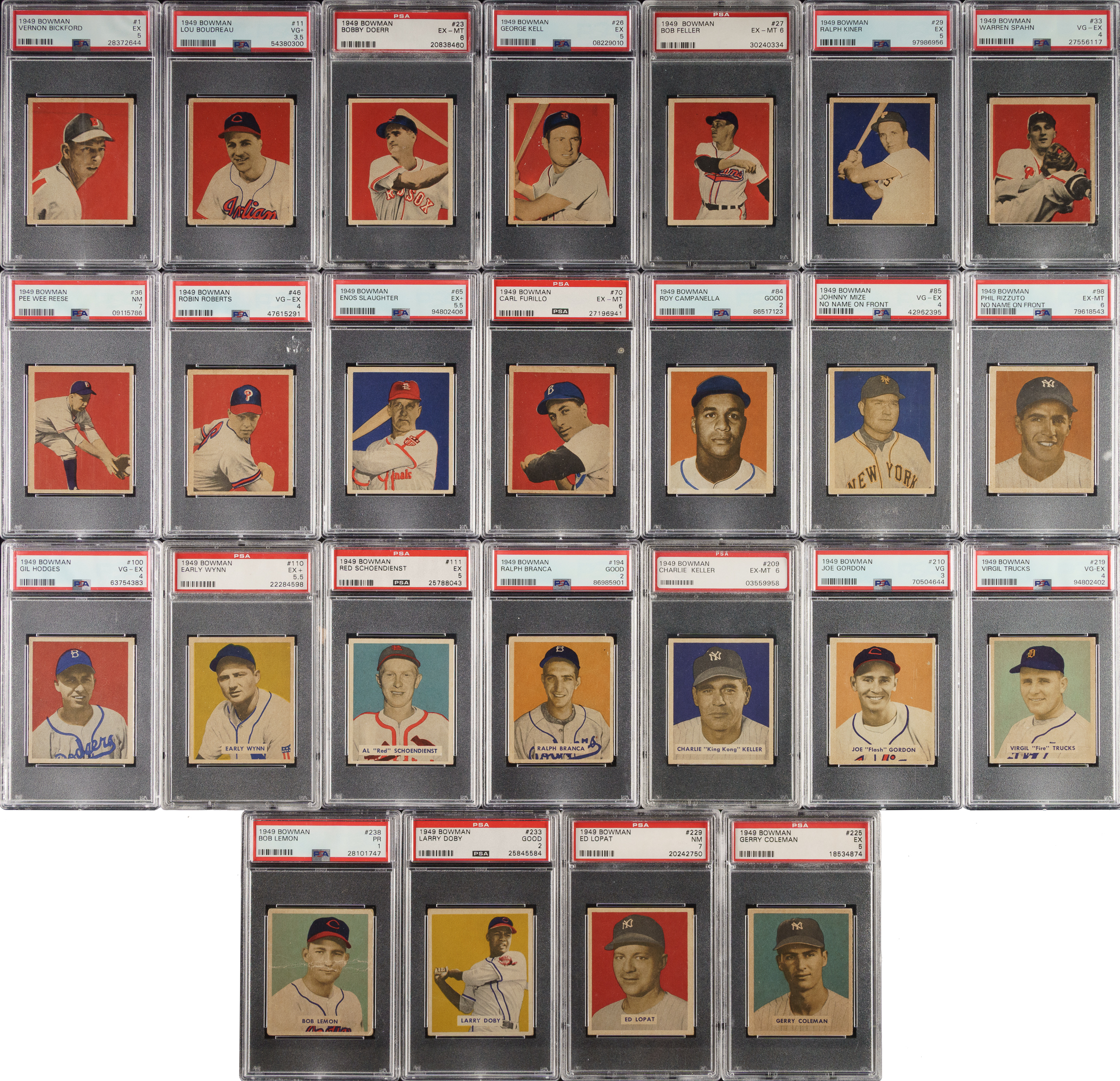 Presented is a near-complete set of 1949 Bowman consisting of 226 different cards (out of 240 in the set), entirely graded and encapsulated by PSA. This is an extremely attractive mid- to high-grade set. Many rookie cards of Hall of Famers are featured in this classic postwar issue, highlighted by Roy Campanella, Gil Hodges, Robin Roberts, Early Wynn, and Bob Lemon. Keys: #1 Bickford (EX 5), 11 Boudreau (VG+ 3.5), 23 Doerr (EX-MT 6), 24 Musial (EX-MT 6), 26 Kell (EX 5), 27 Feller (EX-MT 6), 29 Kiner (EX 5), 33 Spahn (VG-EX 4), 36 Reese (NM 7), 46 Roberts RC (VG-EX 4), 50 Robinson (POOR 1 [MK]), 65 Slaughter (EX+ 5.5), 70 Furillo RC (EX-MT 6), 84 Campanella RC (GOOD 2), 85 Mize NNOF (VG-EX 4), 98 Rizzuto NNOF (EX-MT 6), 100 Hodges RC (VG-EX 4), 110 Wynn RC (EX+ 5.5), 111 Schoendienst (EX 5), 194 Branca RC (GOOD 2), 209 Keller (EX-MT 6), 210 Gordon (VG 3), 219 Trucks (VG-EX 4), 224 Paige (GOOD 2), 225 Coleman RC (EX 5), 229 Lopat RC (NM 7), 233 Doby (GOOD 2), and 238 Lemon RC (POOR 1).