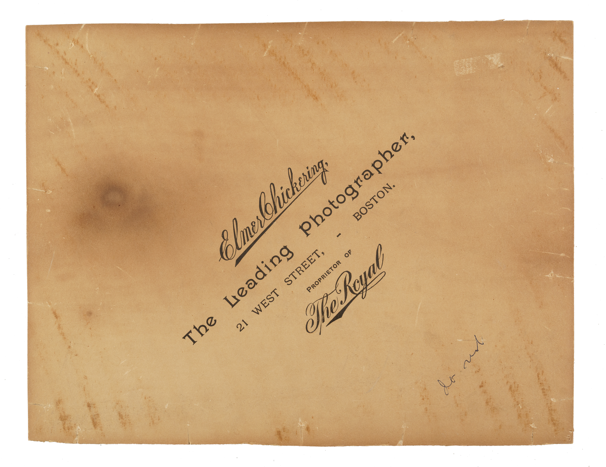 Rare imperial cabinet photograph capturing the 1897 National League Champion Boston Beaneaters in a classic team pose produced by extremely prominent Boston studio photographer Elmer Chickering. Chickering was responsible for virtually all quality images of the Boston Nationals in the 1890s. Seventeen team members are pictured here, including manager Frank Selee, who is nattily attired in a suit, Hugh Duffy, Kid Nichols, Billy Hamilton, Jimmy Collins, Bobby Lowe, Fred Tenney, Marty Bergen, Chick Stahl, Herman Long, Ted Lewis, and Jack Stivetts. The copyright notice, "Photo by E. Chickering," appears in tiny white lettering near the lower right edge. A second credit stamp ("Copyright by F. G. Selee and F. O. Woodruff '97"), also in white lettering, appears near the players sitting in the front row. The reverse of the mount features the proprietary stamp of noted Boston photographer Elmer Chickering. The Boston Beaneaters narrowly defeated the Baltimore Orioles by two games to capture the National League pennant in 1897. The Beaneaters roster boasts four future Hall of Famers (Duffy, Hamilton, Nichols, and Collins) as well as a number of star players (Bobby Lowe was the first player to hit four home runs in one game). Imperial team photographs from the 1880s, of course, are extremely rare, but those dating from the 1890s are even scarcer, almost to the point of being nonexistent. We do not recall ever offering another example of this rare cabinet team photograph. The photo remains in Excellent condition, while the mount (13-1/2 x 10-1/2 inches), which has been trimmed down in size, has light toning and number of discolorations.