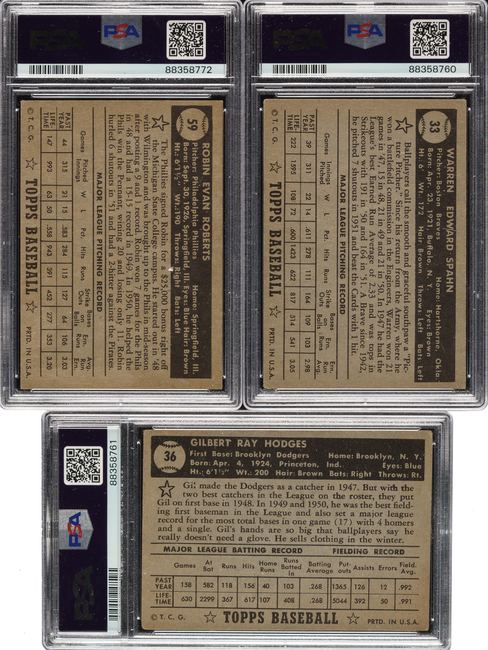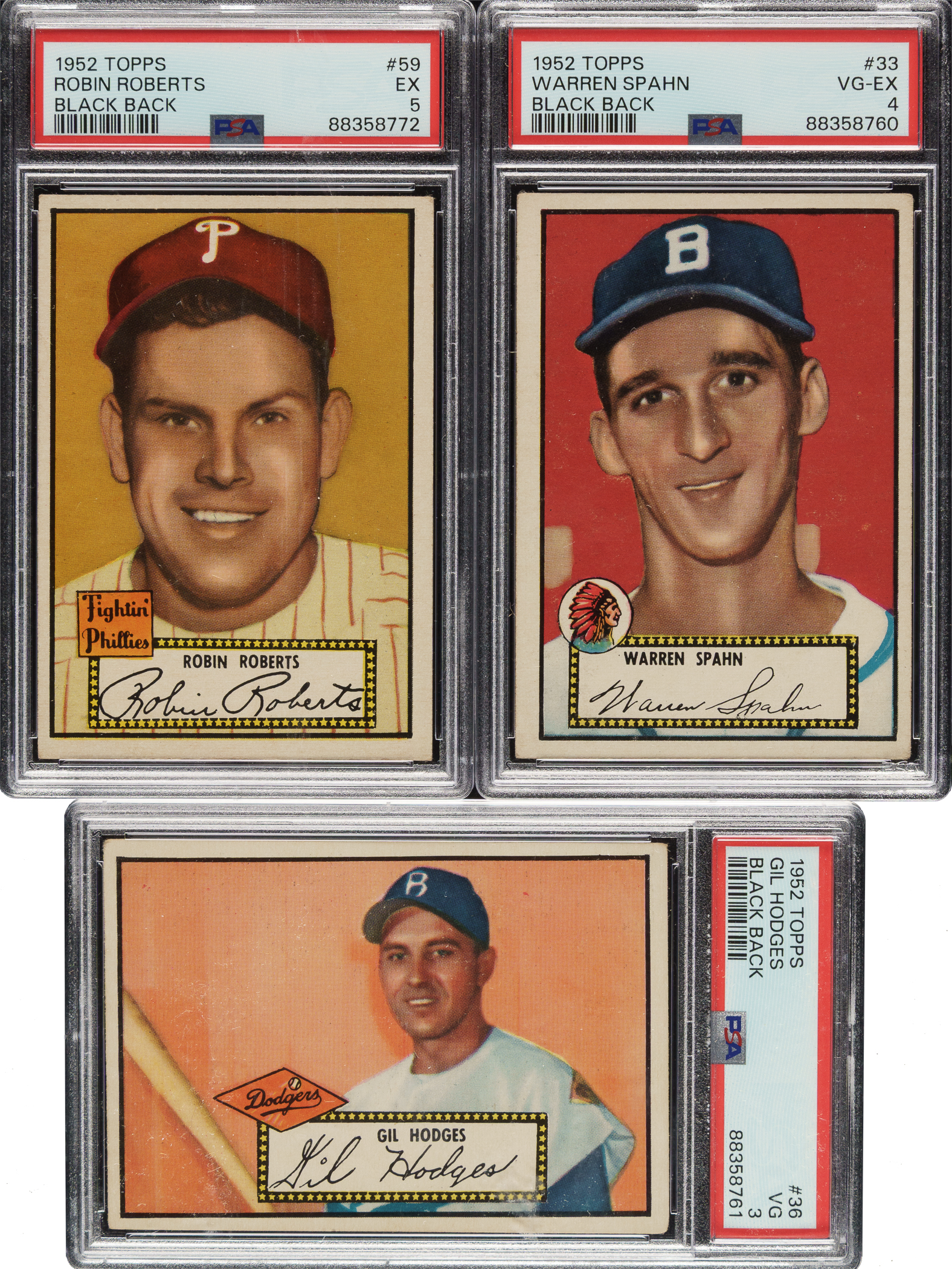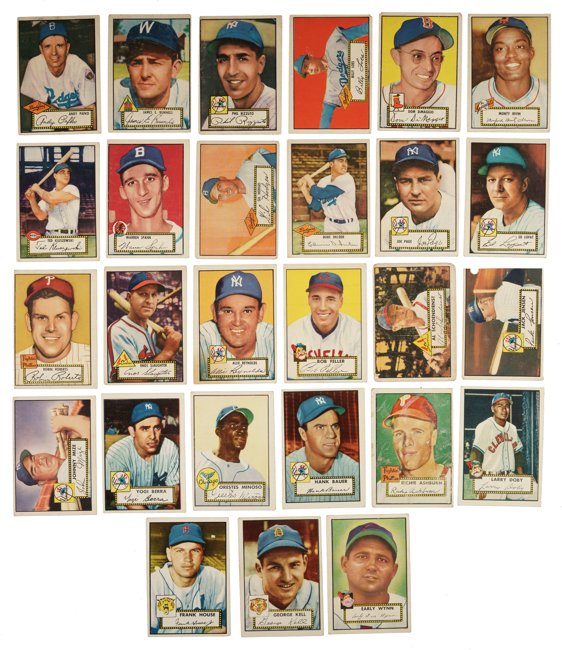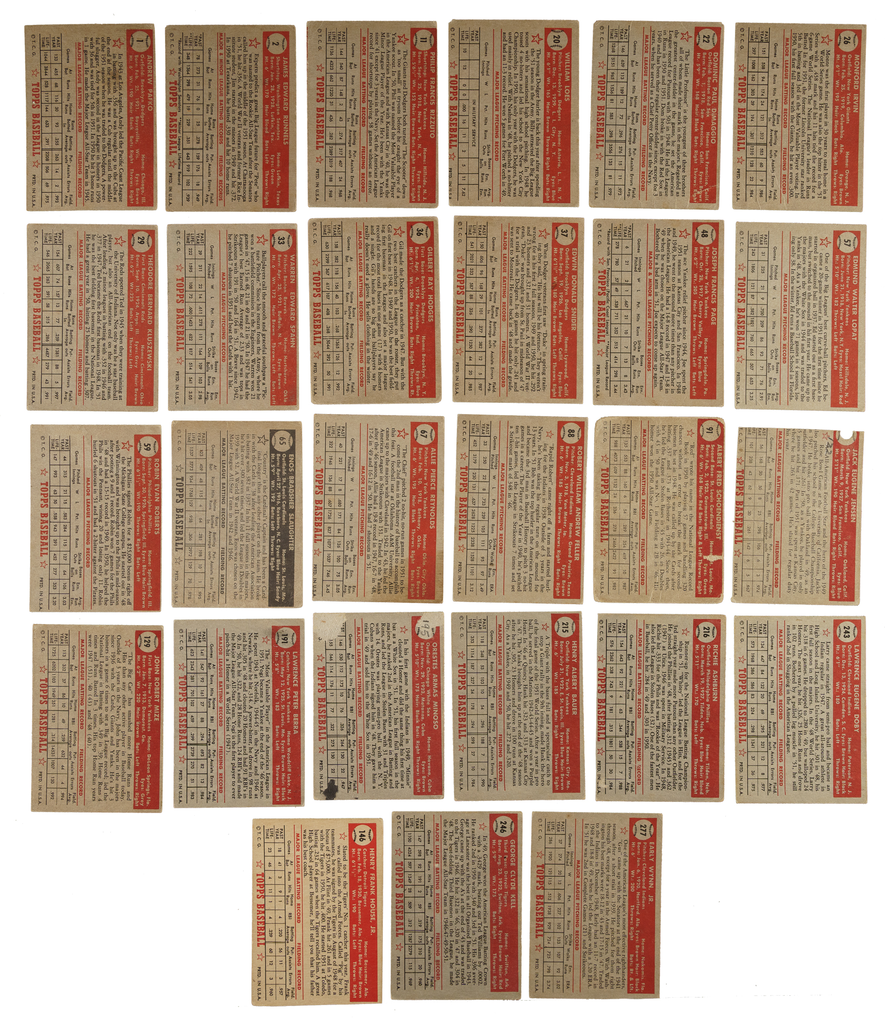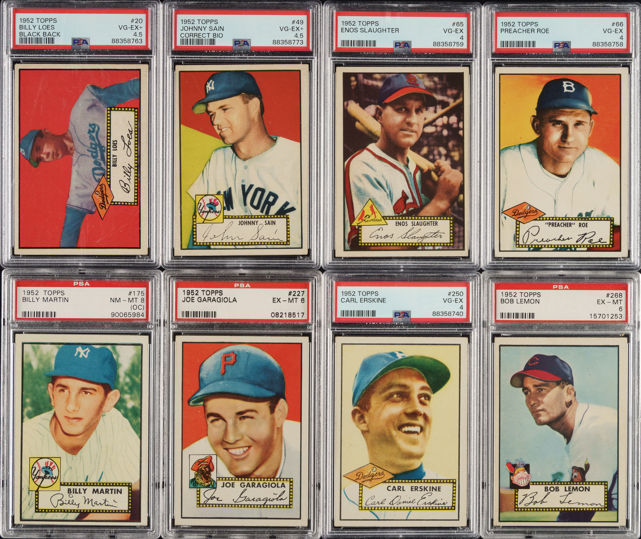 Near-complete low-number run (#1-310) from the classic 1952 Topps series. Missing just #261 Willie Mays (offered individually in this auction) and the ninety-seven rare high-number series cards (#311-407) for completion. Includes a total of twenty-two black-back variations, including both back variations of the following eighteen cards: #10, 15, 20 Loes RC, 25, 28, 33 Spahn, 36 Hodges, 39, 43, 46, 52, 54, 59 Roberts, 61, 63, 65 Slaughter, 71, and 76. A total of 143 cards have been professionally graded and encapsulated by PSA. Grading Composite: NM-MT 8 (3 cards): #105, 165 (OC), and 175 Martin RC (OC). NM 7 (8 cards): #39/black back (MC), 56, 92, 113, 139 (OC), 170 (MC), 239, and 265. EX-MT+ 6.5 (3 cards): #125, 180, and 299. EX-MT 6 (76 cards): #16, 21, 30, 41/black back, 50, 61/black back, 63/black back, 68, 70, 74, 75, 77, 85, 87, 90, 93, 94, 97, 99, 102, 104, 106, 111, 112, 115, 119, 126, 132, 133, 137, 140, 144, 154, 156, 162, 163, 164, 166, 167, 168, 169, 172, 177, 189, 190, 192, 193, 201, 203, 204, 206, 209, 212, 213, 217, 218, 220, 224, 225, 227 Garagiola, 229, 232, 234, 242, 247, 248, 249, 256, 260, 264, 268 Lemon, 276, 300, 302, 308, and 309. EX+ 5.5 (1 card): #28/black back. EX 5 (38 cards): #8, 10/black back, 17, 27, 43/black back, 47, 51, 54/black back, 59 Roberts/black back, 60, 62, 81, 84, 89, 96, 98, 101, 120, 131, 135, 145, 174, 184, 196, 208, 210, 245, 252, 253, 257, 262, 263, 269, 271, 274, 280, 297, and 304. VG-EX+ 4.5 (4 cards): #20 Loes RC/black back, 49b Sain/correct, 71/black back, and 284. VG-EX 4 (6 cards): #33 Spahn/black back, 46/black back, 52/black back, 65 Slaughter/red back, 66 Roe, and 250 Erskine. VG+ 3.5 (1 card): #76/black back. VG 3 (3 cards): #15/black back, 25/black back, and 36 Hodges/black back. The condition of the 184 unencapsulated cards is 14% Vg-Ex to Ex (mostly Vg-Ex), 49% Gd to Vg, and 39% lesser (including a few due mostly to pencil on the reverse and sixteen trimmed). Unencapsulated Keys (#1-310): #1 Pafko (Fr), 2 Runnels (Gd), 11 Rizzuto (Gd), 20 Loes RC/red back (Vg), 22 DiMaggio (Fr), 26 Irvin (Gd+), 29 Kluszewski (Vg), 33 Spahn/red back (Vg), 36 Hodges/red back (Vg), 37 Snider (Vg+), 48b Page/correct (Vg-Ex), 57 Lopat (Vg), 59 Roberts/red back (10/90 L/R, otherwise Vg+), 65 Slaughter/black back (Vg), 67 Reynolds (Fr), 88 Feller (Vg), 91 Schoendienst (Pr), 122 Jensen (trimmed, otherwise Pr), 129 Mize (Vg), 191 Berra (Vg+), 195 Minoso RC (Pr due to back damage), 215 Bauer (Vg-Ex), 216 Ashburn (trimmed, otherwise Pr), 243 Doby (Vg-Ex+), 246 Kell (Pr due to partially erased pencil on front), and 277 Wynn (Vg+). This is a very attractive near-complete low-number run of 1952 Topps, highlighted by 143 PSA-graded examples and representing a very substantial start toward a complete set. The SMR value for just 138 of the graded cards (not including the five PSA-qualified cards and factoring in the nine half grades at the lower whole-grade level) is $10,990. Total: 327 cards (near low-number run of 309 plus 18 variations). The size/weight of this item requires that there will be an additional shipping charge for this lot.