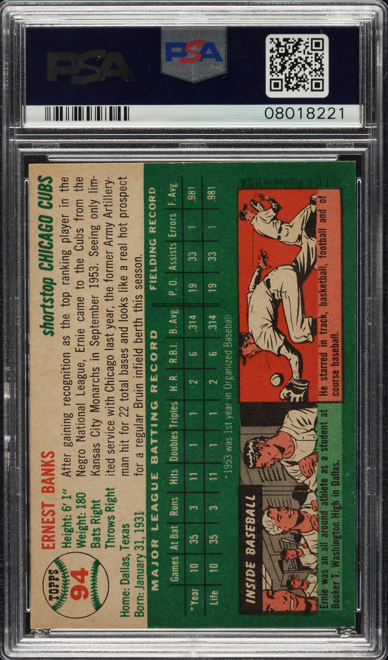 Graded NM-MT 8 by PSA. Superb high-grade rookie card of Chicago Cubs Hall of Famer Ernie Banks from the 1954 Topps issue. This card has bright colors, a crisp image, and strong corners. Clean, boldly printed reverse. High-grade Banks rookies are offered with less frequency than other Hall of Fame rookie cards or stars from this set. This is a fantastic high-grade example of Ernie Banks' rookie card.