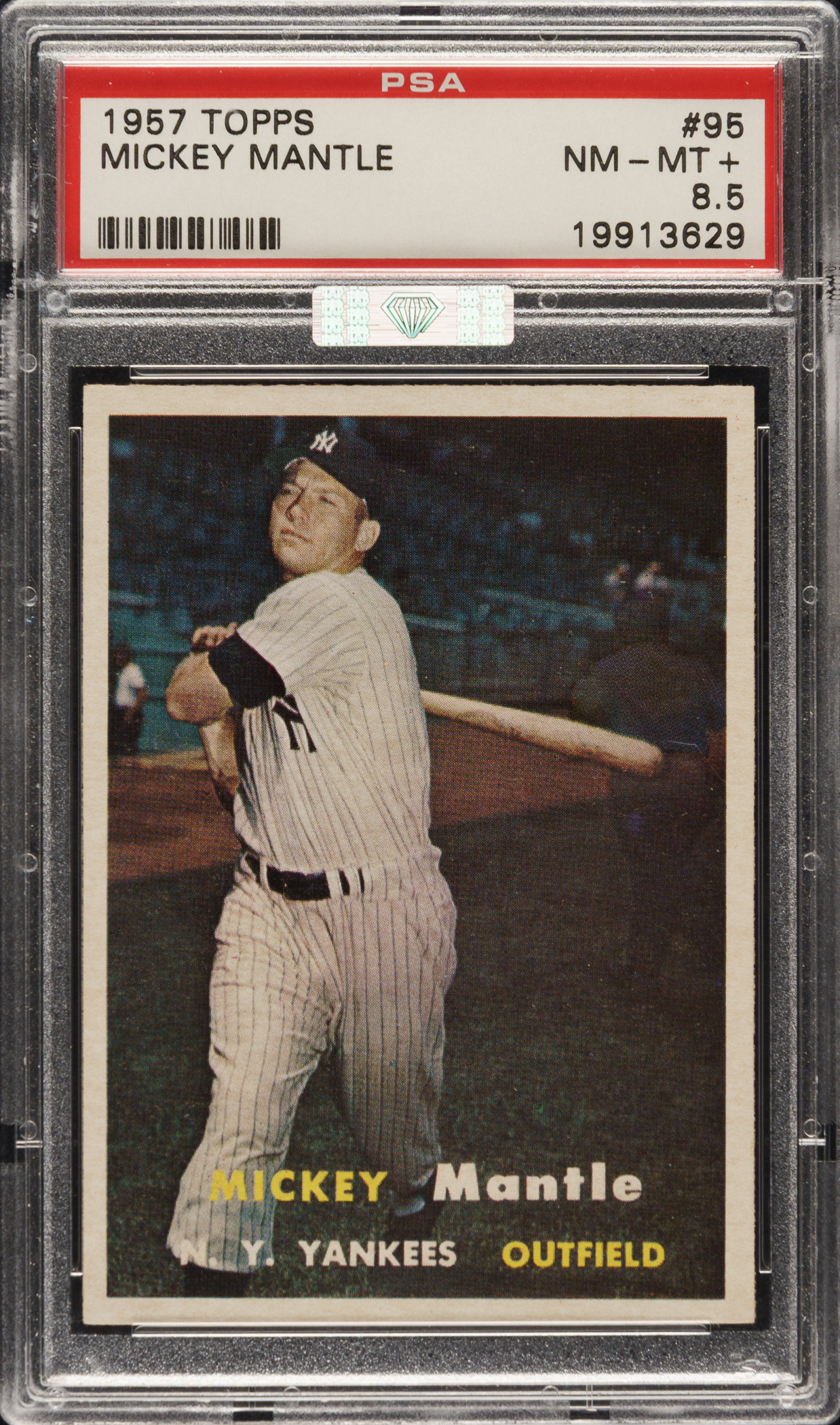 Graded NM-MT+ 8.5 by PSA. Outstanding high-grade example of one of Mickey Mantle's classic cards. In addition to being one of his most striking and popular cards, this card dates from one of Mantle's MVP years and follows his finest season (1956 Triple Crown statistics: 52 home runs, 130 RBI, .353 batting average). Getting this card in a pack in 1957 was as good as it got. The image used on the card features a young "Mick" in a mighty swing-through pose. This example boasts vibrant colors, superb image quality, bright white borders, and strong corners. Clean, boldly printed reverse. A world-class example of one of Mantle's most popular cards and the key card from the 1957 Topps set. Awarded an MBA Silver Diamond by Mike Baker Authenticated for high-end eye appeal. A corresponding MBA sticker is affixed to the front of the holder.