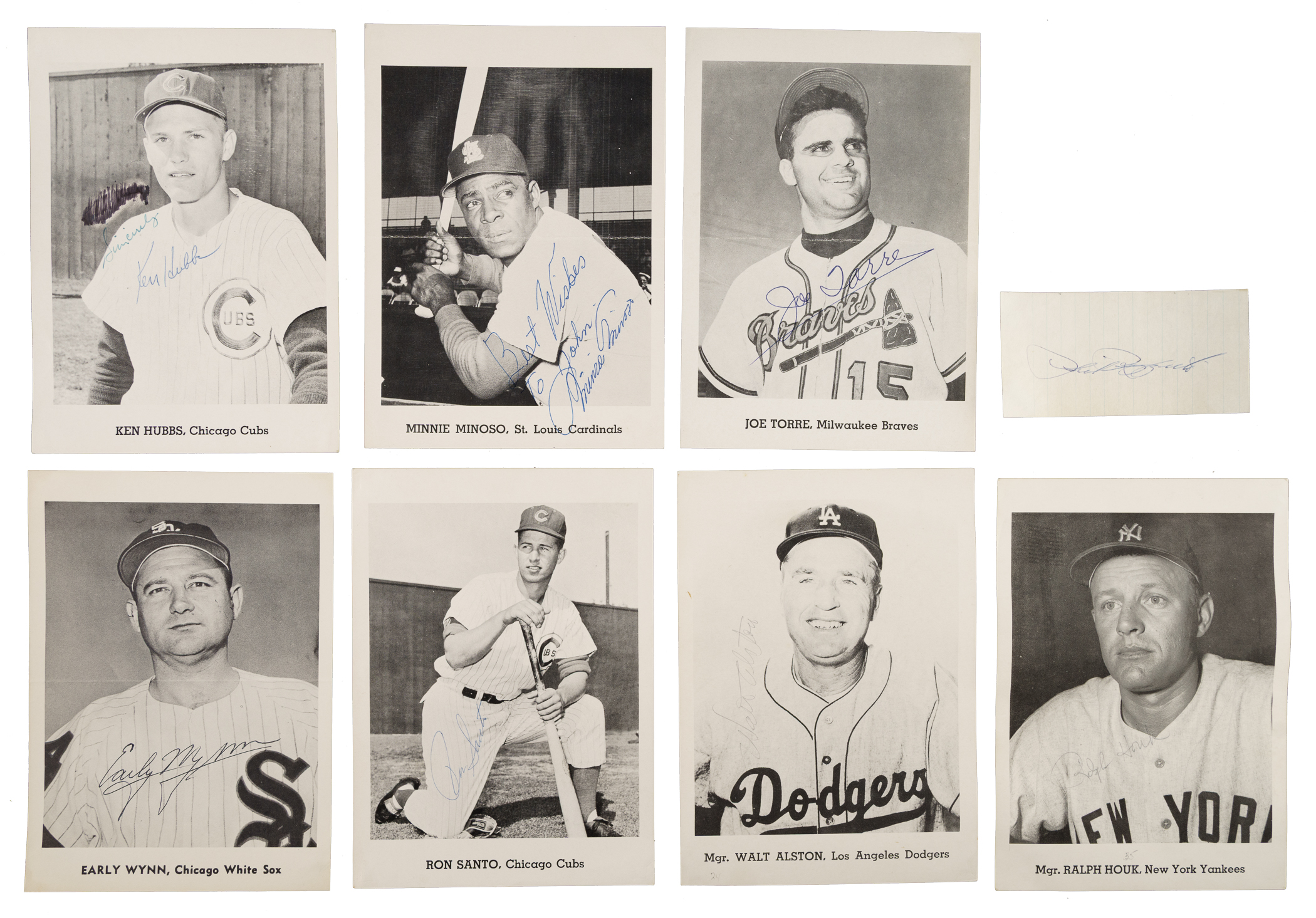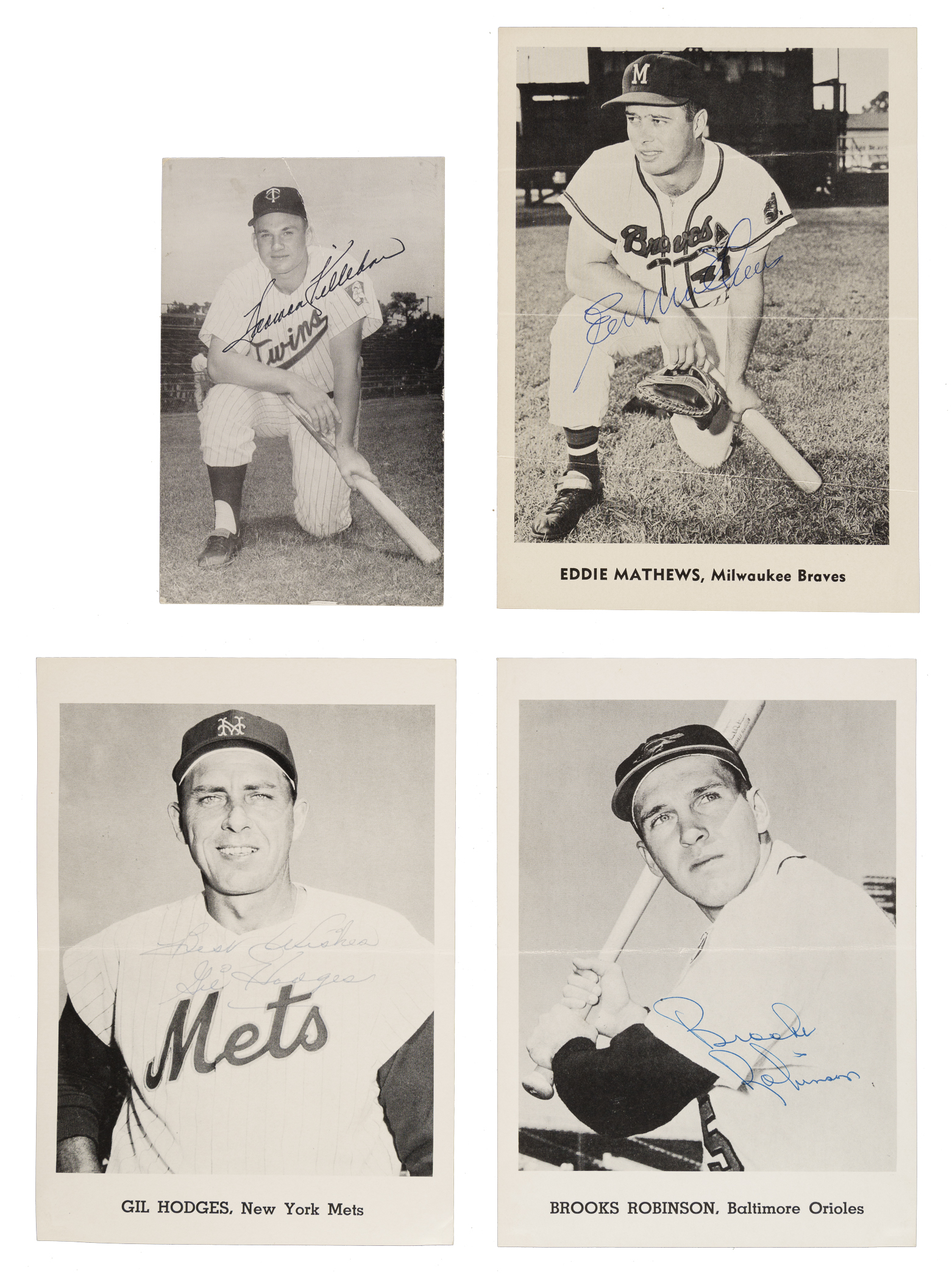 Collection of 57 different signed 1958-1961 Jay Publishing "Picture Pack" photos, plus eleven additional signed items (Topps cards, cuts, magazine cut-out photos, and postcards), highlighted by Curt Flood, Gil Hodges, Ken Hubbs, Eddie Mathews, Ken Boyer, and Brooks Robinson. All of the items have been signed in blue ink on the front (except for Killebrew and Wynn in black ink). This collection consists of the following: 1) 1958-1961 Jay Publishing "Picture Pack" (57): Alston (HOF), Altman, Archer, Barber, Boros, C. Boyer, K. Boyer, Brandt, Callison, Chacon, Clinton, Coleman, Craig, Daley, Elston, Estrada, Flood, Geiger, Green, Held, Hitchcock, Hobbie, Hodges (HOF), Houk, Hubbs, Javier, Kanehl, Kasko, Kirkland, Landis, Larker, Law, Mathews (HOF), Mauch, McMillan, Mejias, Minoso (personalized, HOF), Monbouquette, Neal, Pappas, Pearson (personalized), Piersall, Rakow, B. Robinson (HOF), Romano, Santo (HOF), Shaw, Skowron, Terry, Tillman, Torre (HOF), Virdon, Walker, White, S. Williams (personalized, N.Y. Yankees '1963'), Wills (personalized), and Wynn (HOF). All but three have a horizontal fold line, but otherwise they range from Vg to Vg-Ex condition. 2) 1963 Topps (2 cards): #34 Schofield (Gd) and 189 Giusti (Vg). 3) Postcards, Cut Signature, and Magazine Cut-Out Photos (9): Adcock, Crandall, Friend, Haddix, Killebrew (Wingfield postcard, HOF), Linz, Lollar (postcard), Malzone, and Rizzuto (cut signature, HOF). Total: 68 items. Auction LOA from James Spence/JSA.