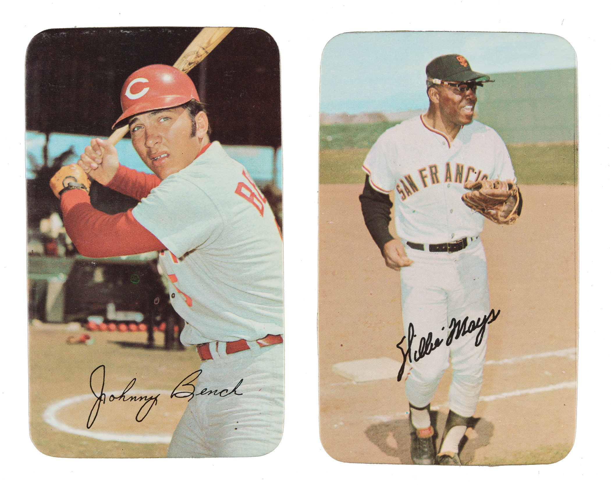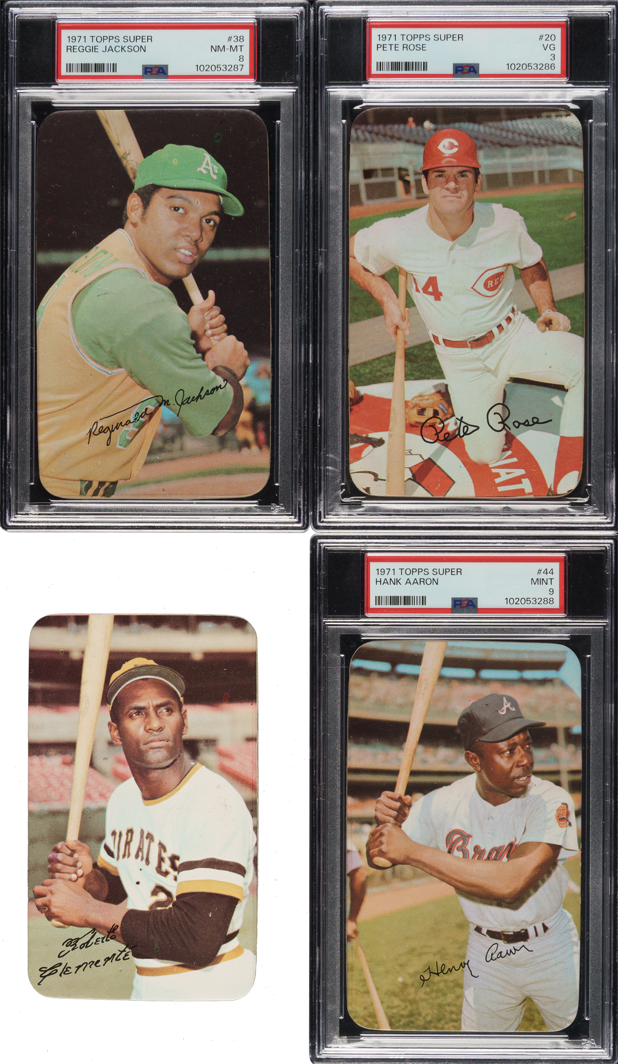 Presented is a complete 63-card set of the 1971 Topps Super series, highlighted by many Hall of Famers and stars including Willie Mays, Hank Aaron, and Roberto Clemente. Condition is 82% Nr/Mt to Nr/Mt-Mt (including a few bordering on Mint), 8% Ex to Ex-Mt, and 10% Vg to Vg-Ex (including one lesser). We have selected three cards for grading and encapsulation by PSA. Keys: #20 Rose (VG 3), 32 Bench (Nr/Mt), 37 Clemente (Ex-Mt), 38 Jackson (NM-MT 8), 44 Aaron (MINT 9), and 56 Mays (Ex due solely to gum stain on reverse). Because of their high-quality production values and scarcity relative to other Topps sets of the era, it is a little surprising that this issue has not received more attention from collectors, but this is primarily because for many years grading companies did not have holders for this large-format issue. This is no longer the case, and collectors can now build sets of these cards in graded form just like they've done for many years with standard-sized cards. A very attractive high-grade complete set with several notable highlights. Total: 63 cards.