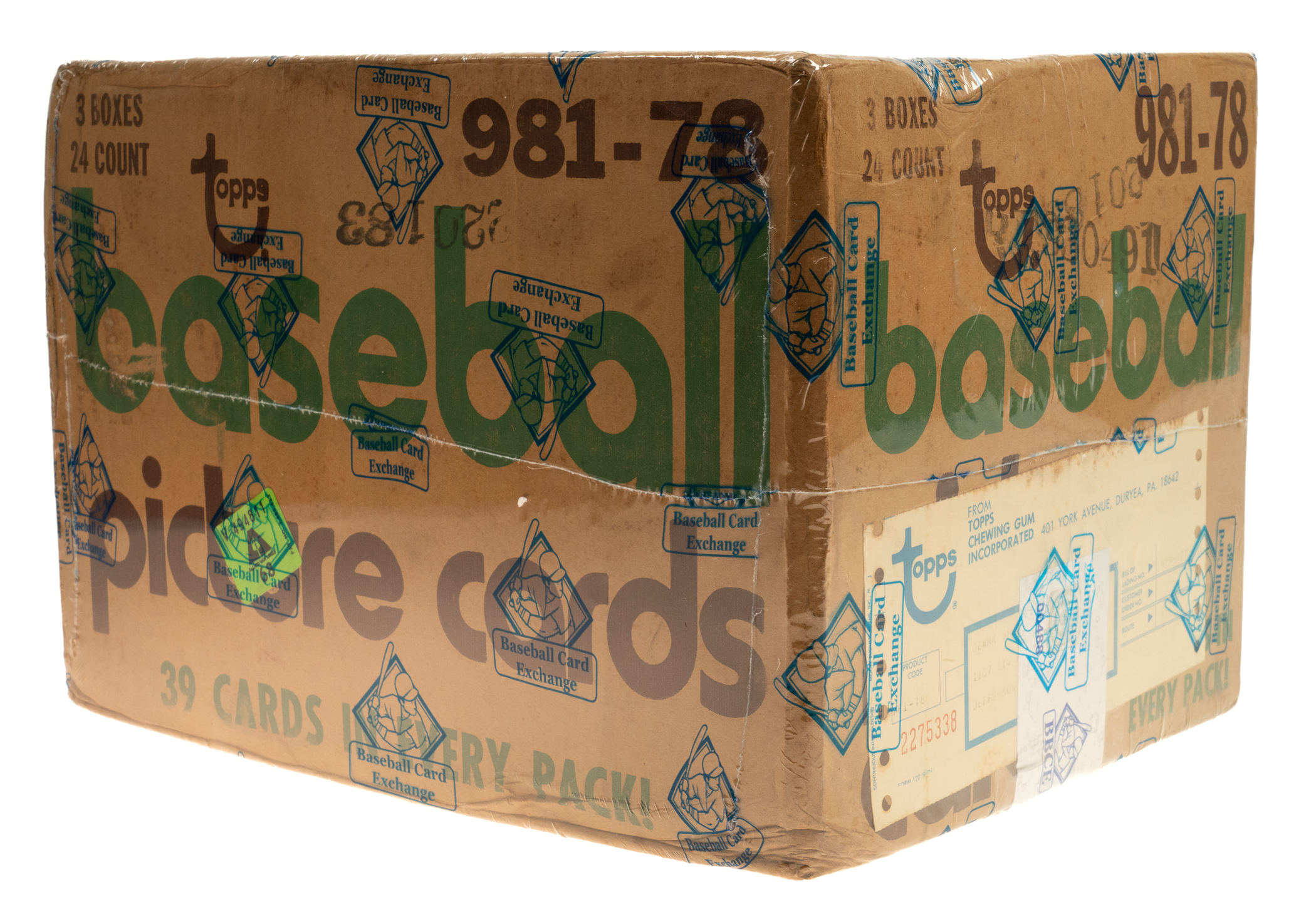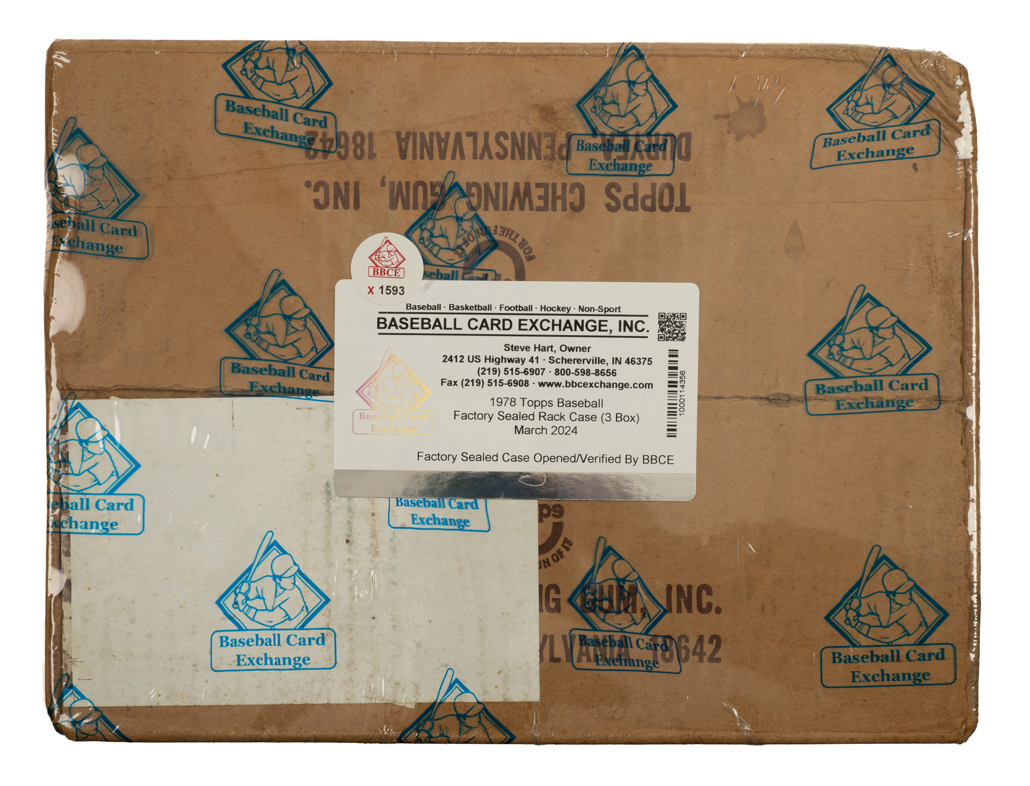 Complete, original rack box case of 1978 Topps baseball, which contains three unopened boxes with twenty-four packs per box for a total of seventy-two packs. With each pack containing thirty-nine cards, the case represents a total of 2,808 cards. This case comes shrink-wrapped by Baseball Card Exchange (owned by Steve Hart, the foremost expert on unopened material). Please note the case, which was presented for authentication factory-sealed from Topps, has been opened and verified by BBCE (as is their new policy) and is noted as such on their authentication label. Each box inside comes individually shrink-wrapped by BBCE and is noted to have originated from a sealed case (FASC designation on label). The "factory sealed" distinction is particularly important and makes the offered case even more impressive. The 1978 Topps set includes rookie cards of Eddie Murray, Paul Molitor, and Alan Trammell, and key cards of George Brett and Nolan Ryan. The original outer case displays moderate wear. A tremendous opportunity to acquire this extraordinary and rarely seen rack case from the popular 1978 Topps baseball issue. The size/weight of this item requires that there will be an additional shipping charge for this lot.