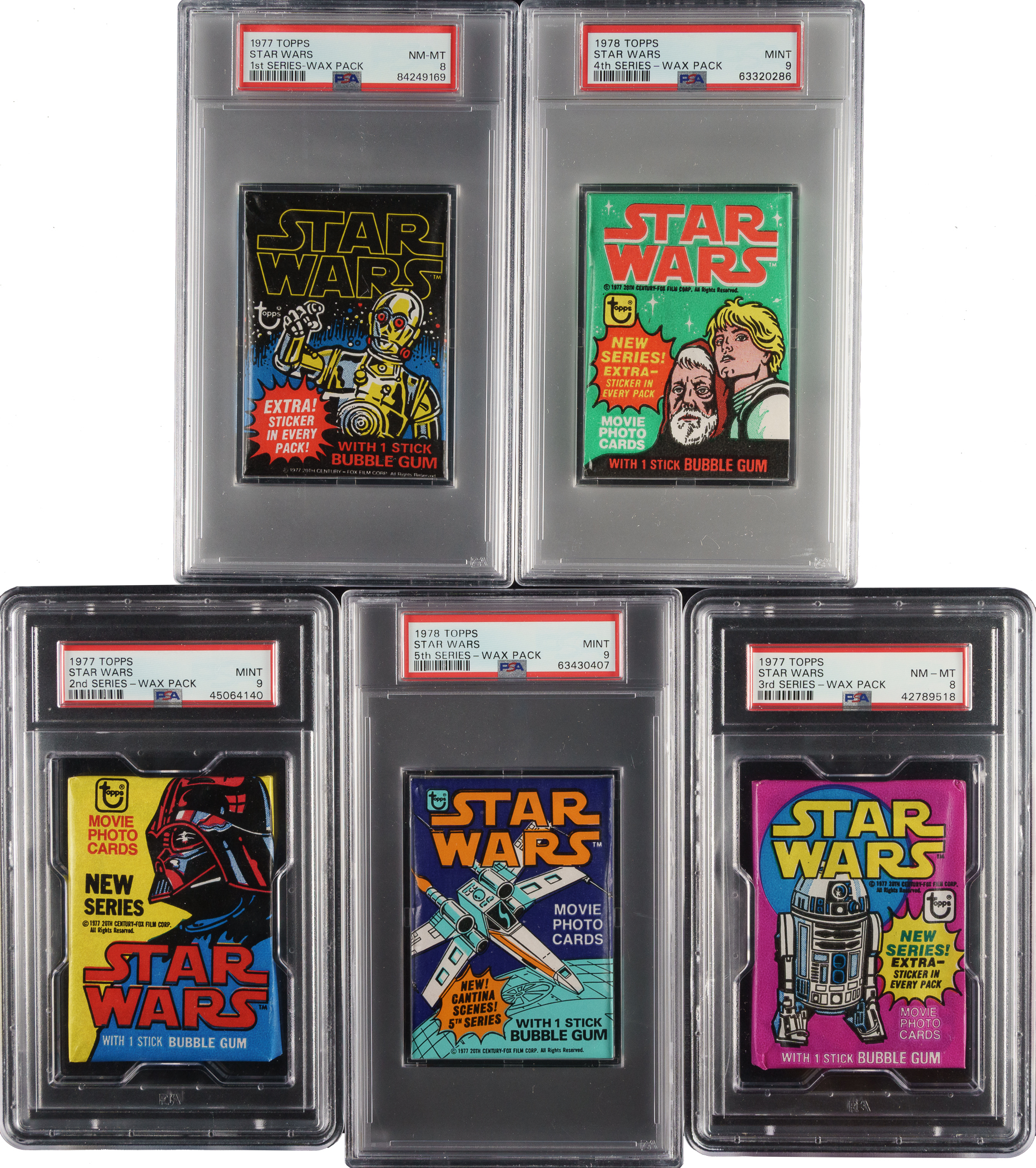 Presented is a collection of five original unopened wax packs from the 1977 and 1978 Topps "Star Wars" series. Each wax pack is professionally graded and encapsulated by PSA, with three grading MINT 9 and two grading NM-MT 8. The collection consists of the following: 1st Series (NM-MT 8), 2nd Series (MINT 9), 3rd Series (NM-MT 8), 4th Series (MINT 9), and 5th Series (MINT 9). Each pack is bright, crisp, and clean, appearing almost exactly as it did nearly fifty years ago! Seven cards and a sticker are housed within each pack for a total of thirty-five cards and five stickers. A worthy addition to any collection of "Star Wars" or unopened material. Total: 5 graded wax packs.