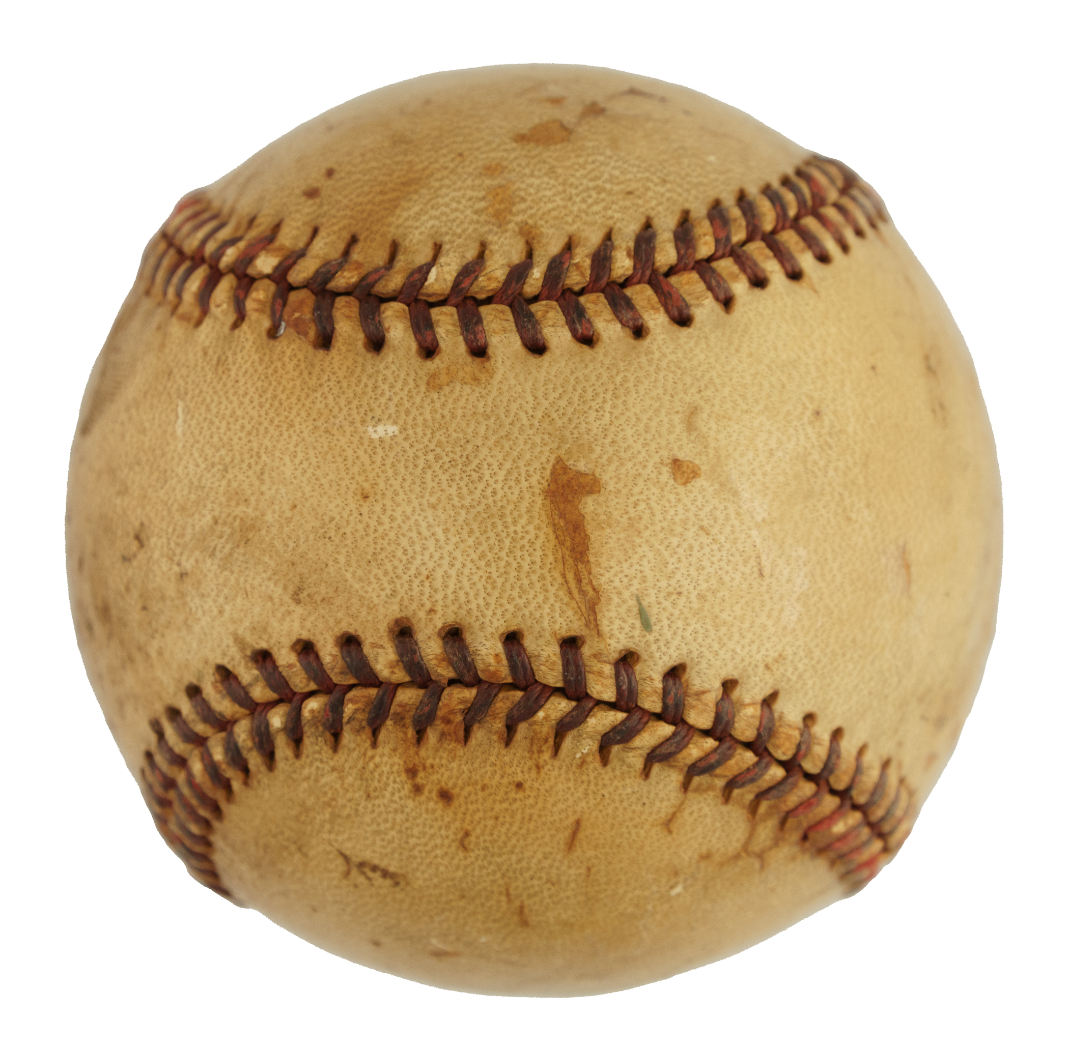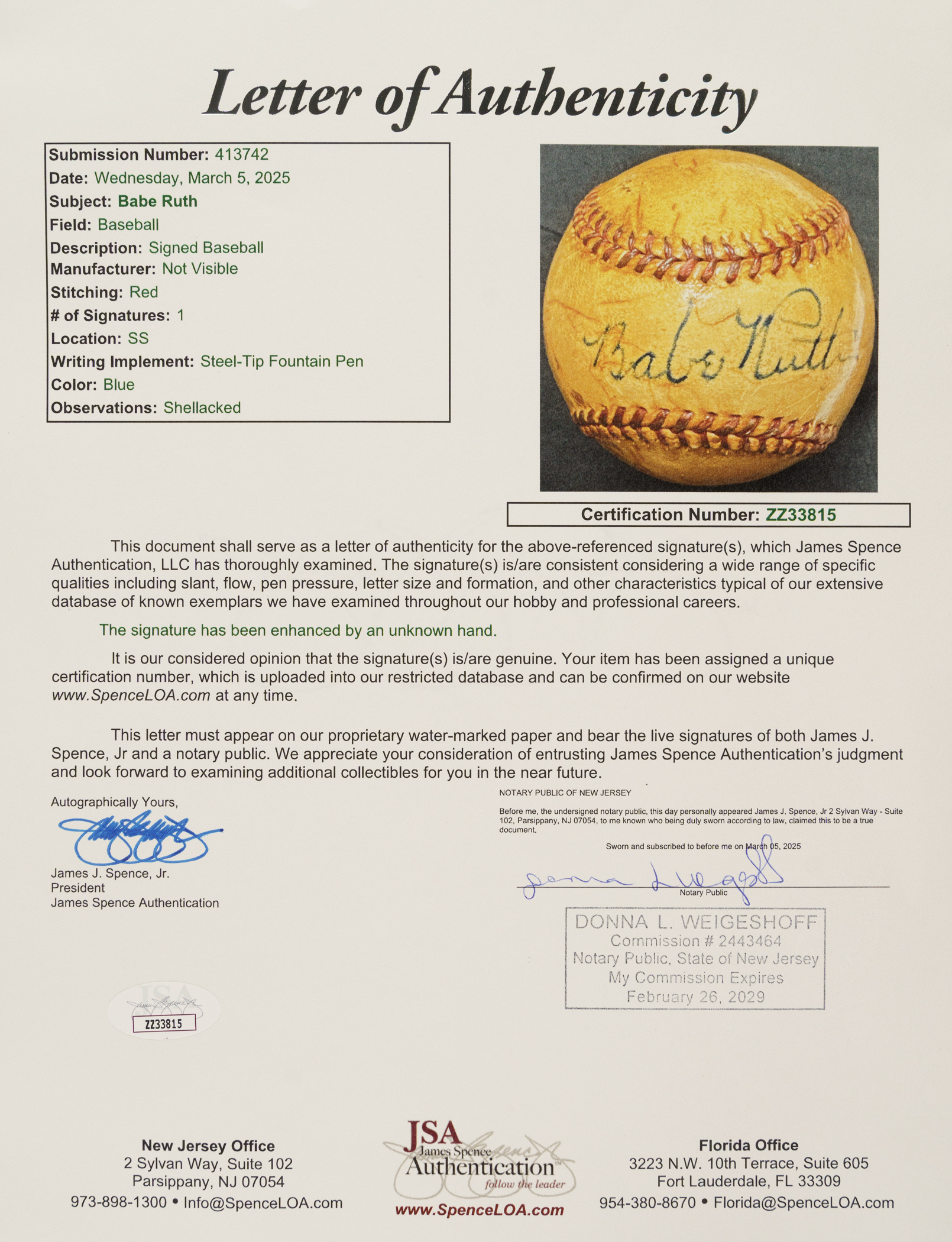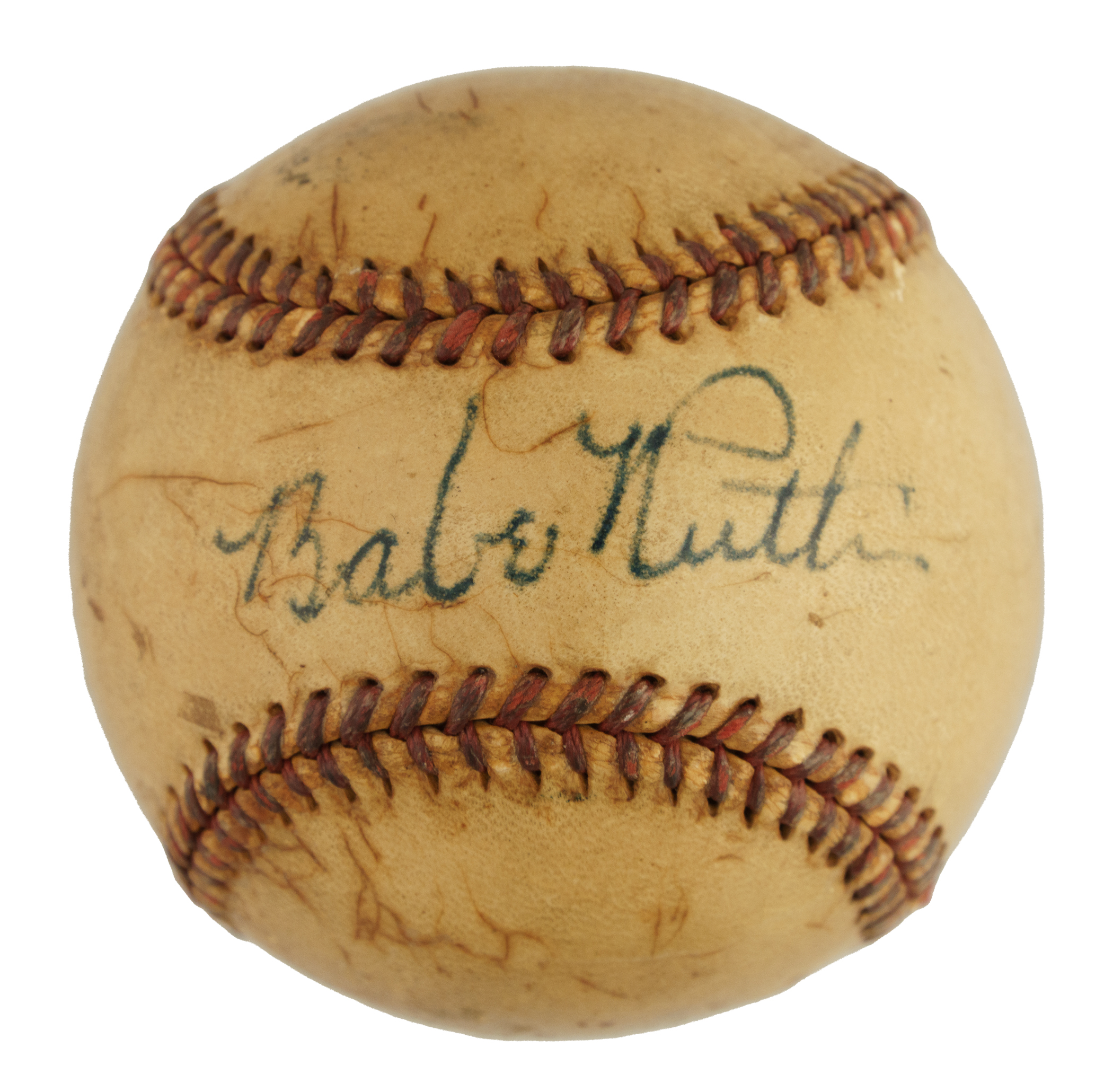 Baseball (manufacturer's stampings completely faded) signed by Babe Ruth in blue fountain pen across the sweet spot. JSA has noted that the "signature has been enhanced by an unknown hand." Despite the fact that the Babe was a prolific signer, the demand for single-signed Ruth balls has always far exceeded the supply. The ball, which has a protective coat of shellack, displays a few surface abrasions and scattered spots of discoloration throughout. In Fair condition overall. Full LOA from James Spence/JSA.