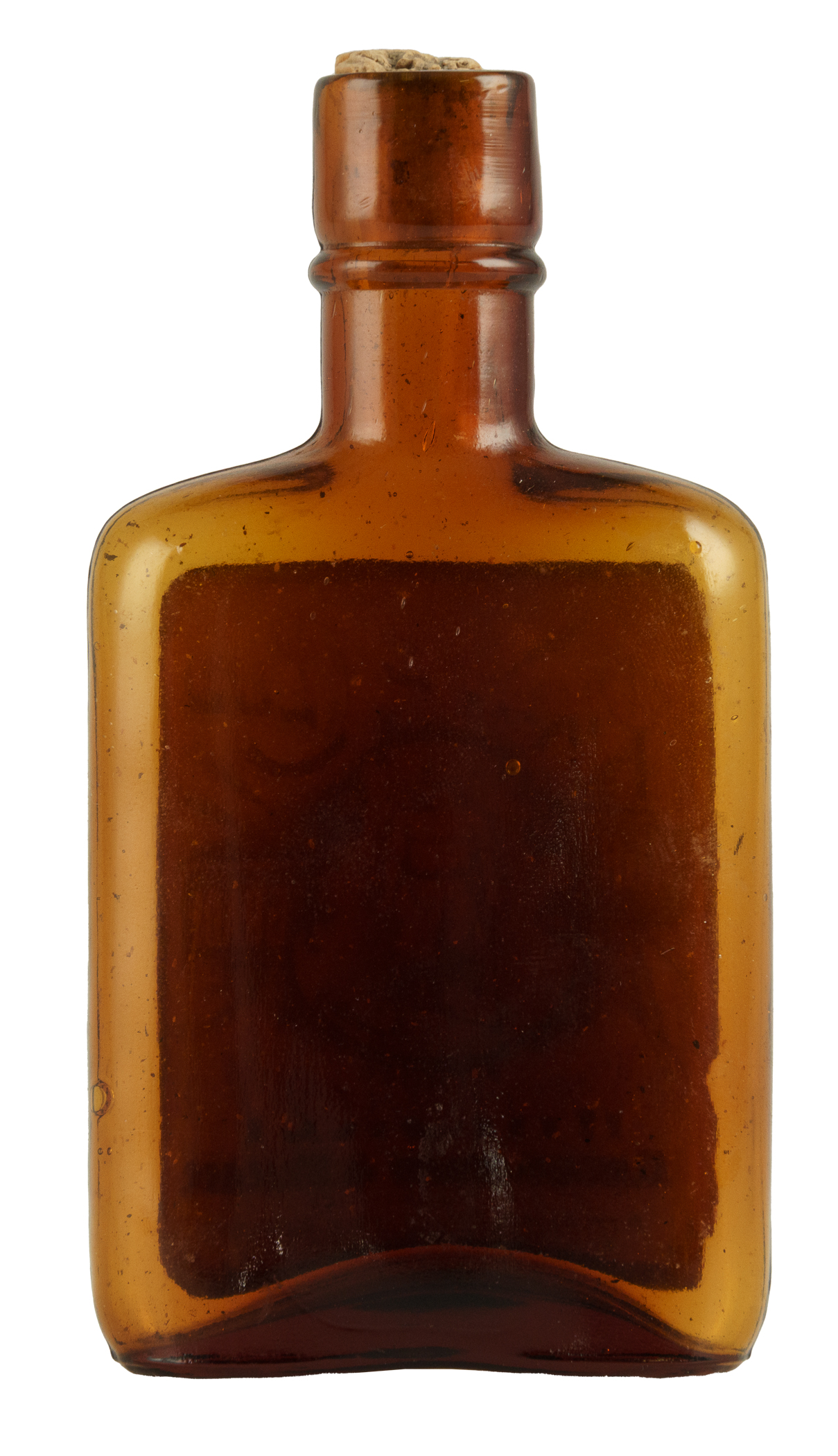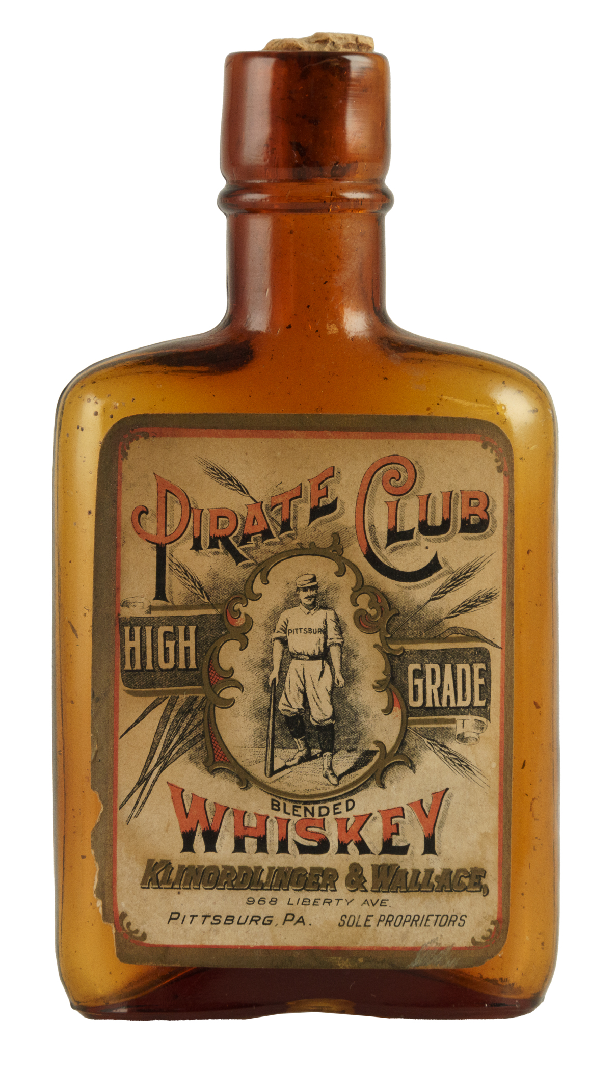 Rare Pirate Club High Grade Whiskey amber glass bottle, circa 1900s, measuring five inches tall with a decorative paper label on the front depicting a Pittsburg player in uniform with his sleeves rolled up and leaning on a bat. The label retains its exceptional design and detail and is largely intact, minus a small amount of paper loss along the left edge. The bottle's original cork is included. A scarce and very unusual piece of early twentieth-century baseball memorabilia from the days when baseball and hard liquor were very closely linked.