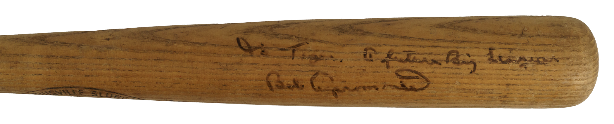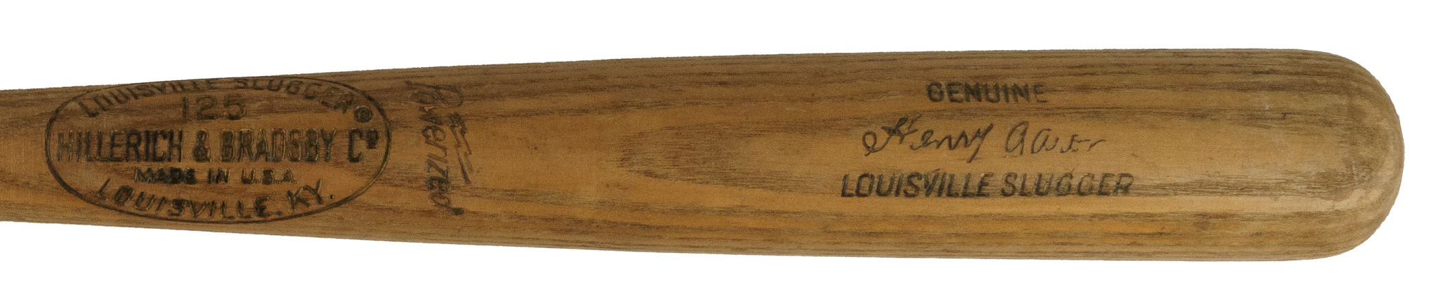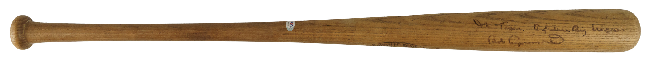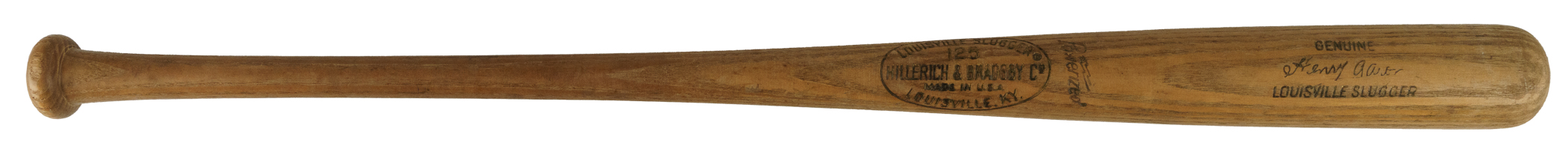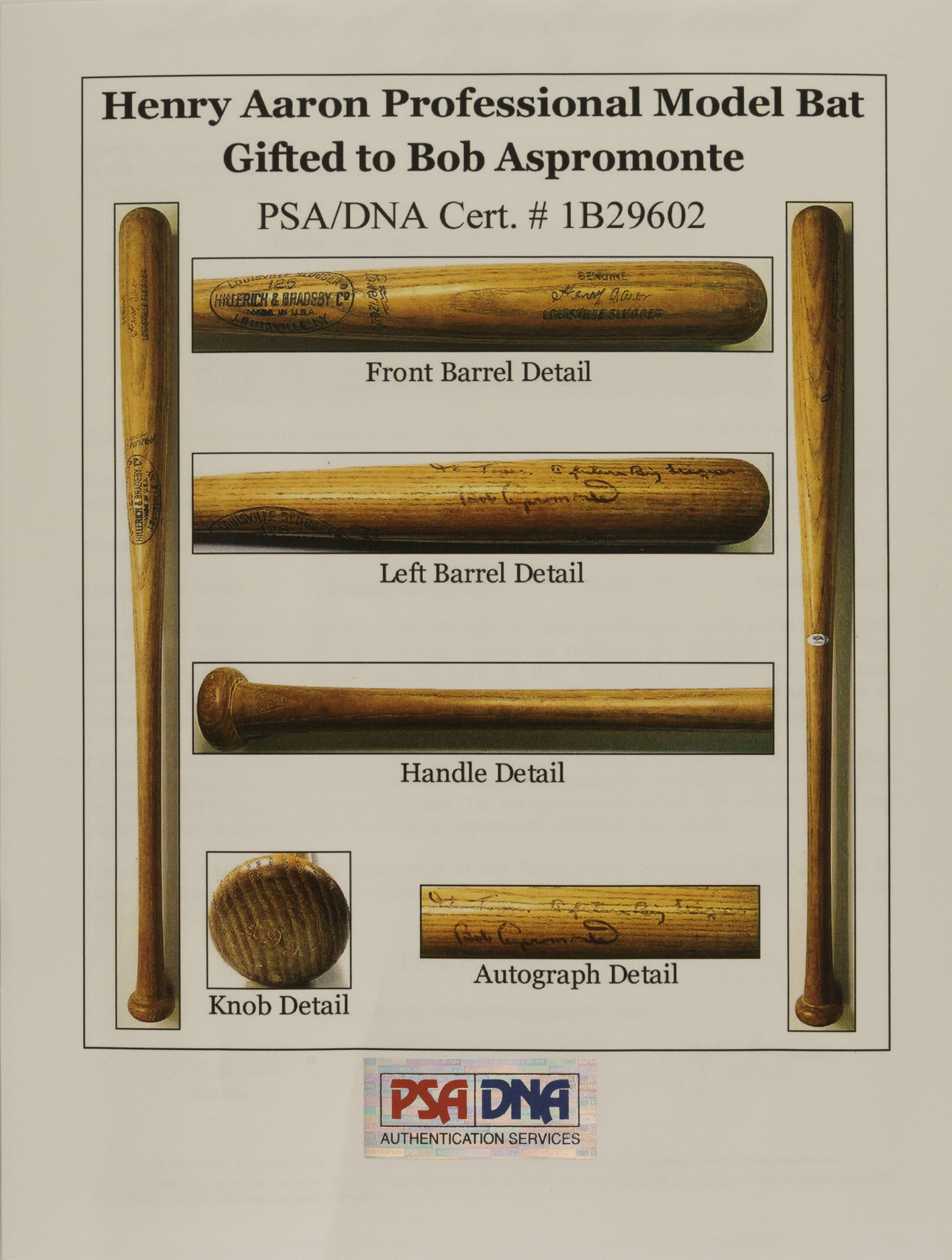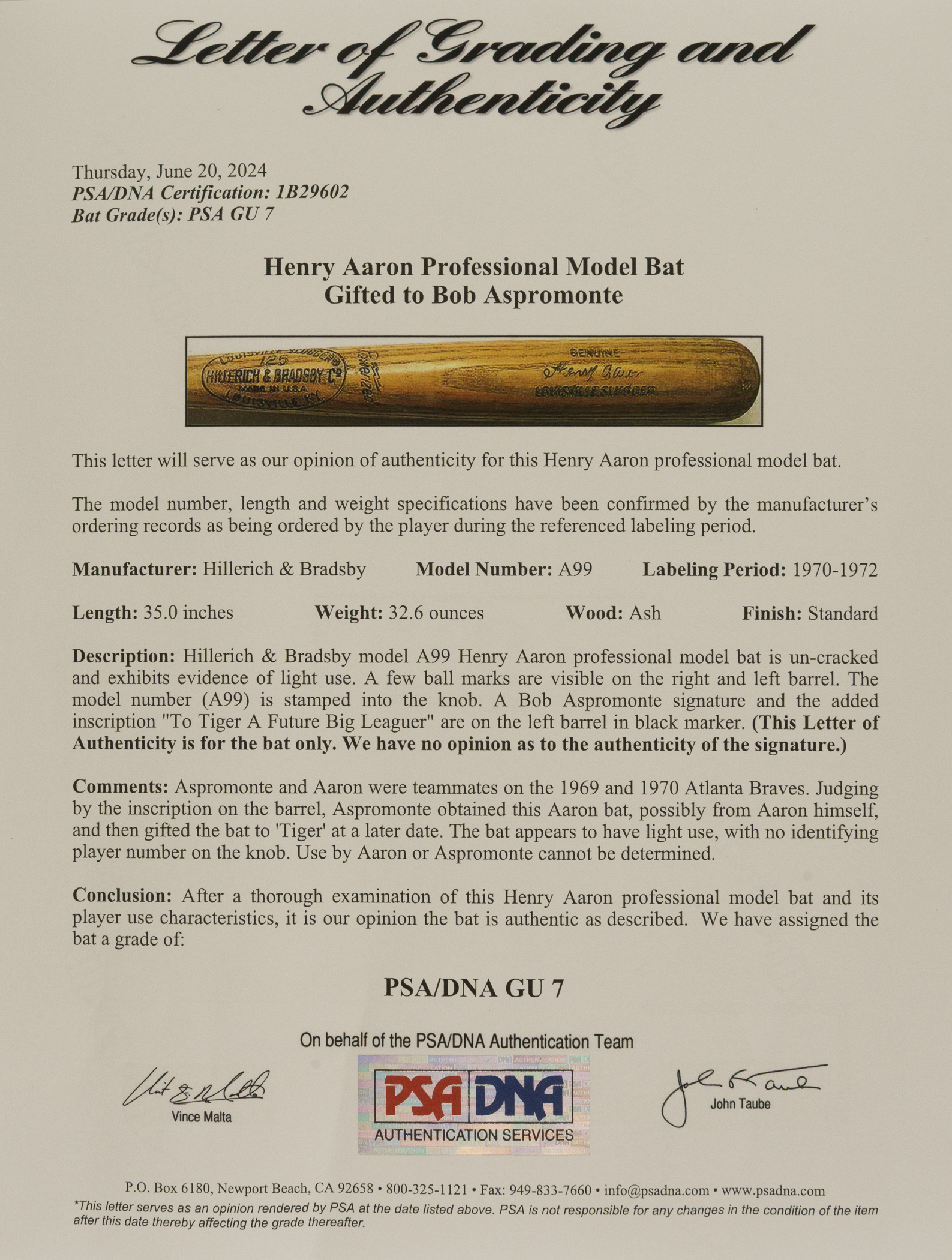 Hank Aaron H&B signature-model "A99" bat dating from the 1970-1972 manufacturing period. Graded GU 7 by PSA/DNA. The bat, which is uncracked, displays evidence of light use, including a few ball marks on the right and left barrel. The model number ("A99") is stamped into the knob. There is a Bob Aspromonte signature on the barrel in black marker. He added the inscription "To Tiger/A future Big Leaguer" directly above his signature. Aspromonte was Aaron's teammate with the Atlanta Braves in 1969 and 1970. PSA/DNA has asserted in its letter of authenticity that "Judging by the inscription on the barrel, Aspromonte obtained this Aaron bat, possibly from Aaron himself, and then gifted the bat to 'Tiger' at a later date. The bat appears to have light use, with no identifying player number on the knob. Use by Aaron or Aspromonte cannot be confirmed." Despite his advancing age, Aaron was still at the top of his game between the years 1970 and 1972, posting home-run totals of 38, 47, and 34, respectively, during that three-season span. Length: 35 inches. Weight: 32.6 ounces. Full LOA from John Taube of PSA/DNA (for the bat only, a corresponding sticker is affixed to the handle). Auction LOA from James Spence/JSA (for the autograph only). The size/weight of this item requires that there will be an additional shipping charge for this lot.