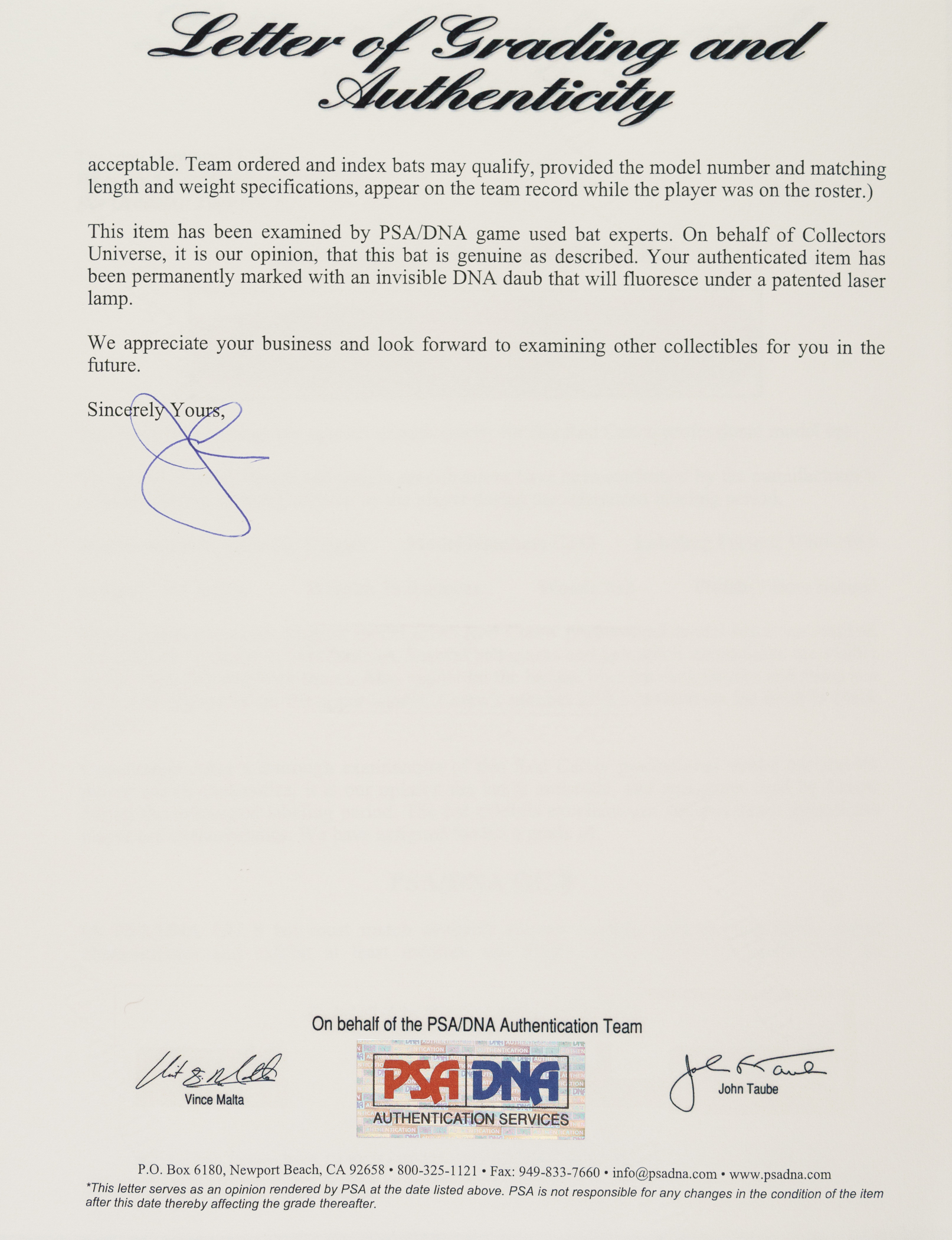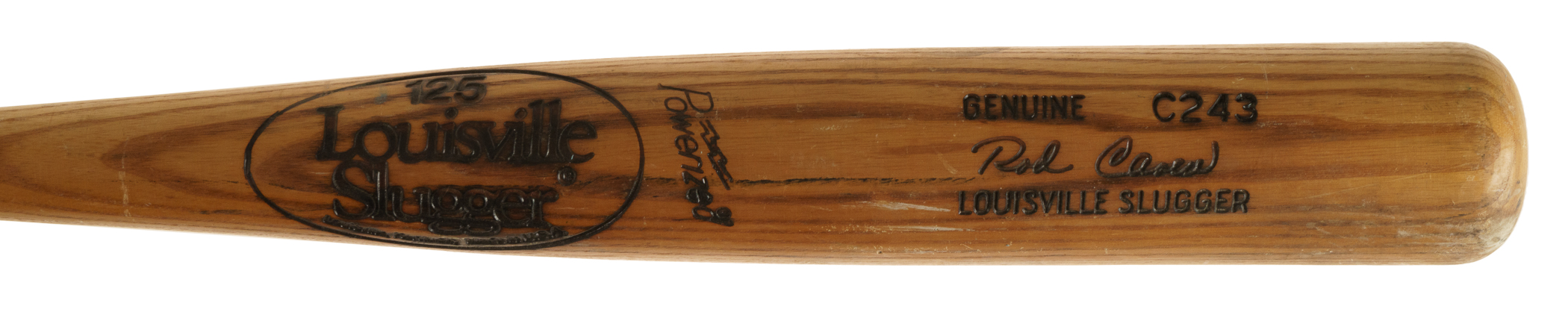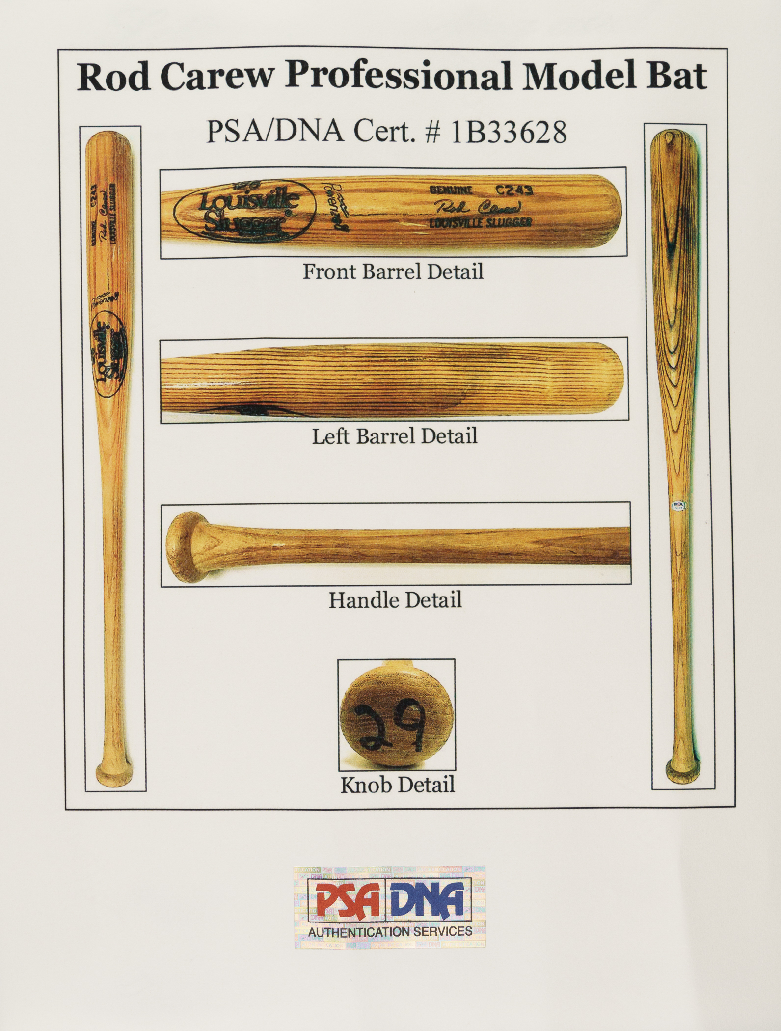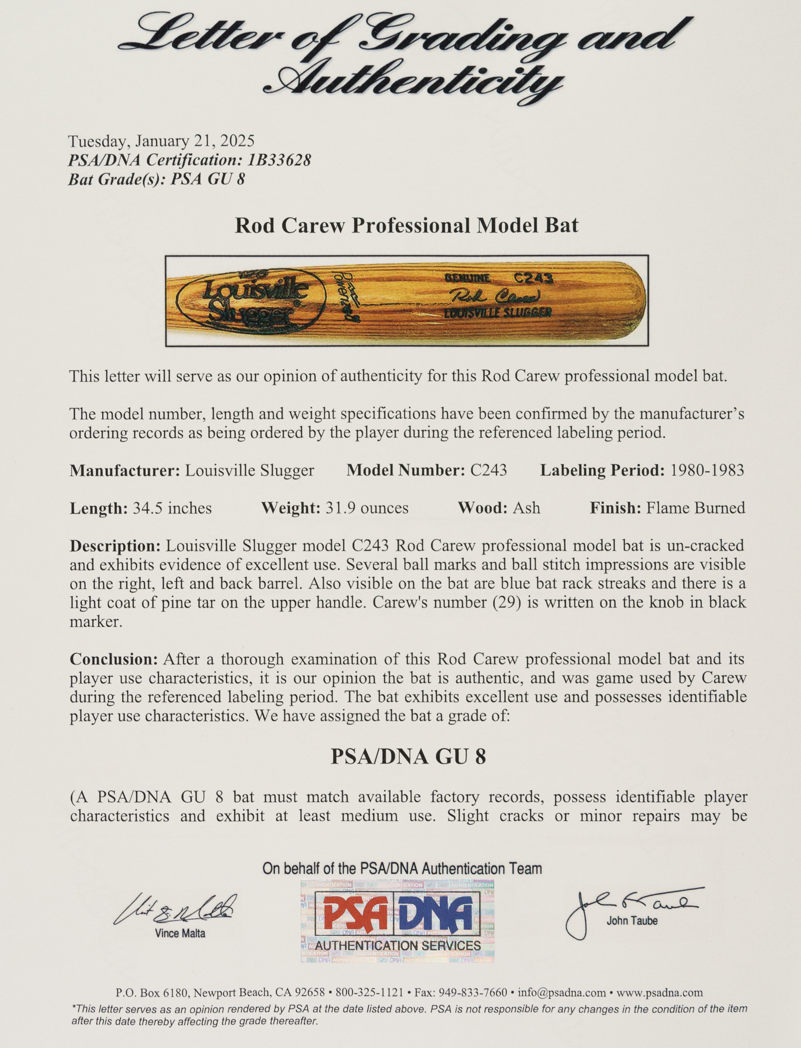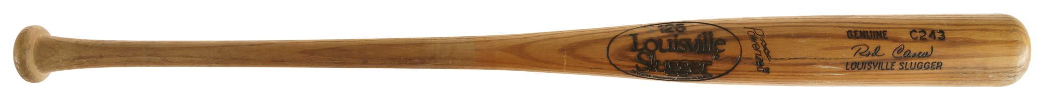 Rod Carew H&B signature-model ("C243") bat dating from the 1980 to 1983 manufacturing period. Graded GU 8 by PSA/DNA. The uncracked bat displays excellent use along the entire barrel, including several ball marks, ball stitch impressions, blue rack marks, and a light application of pine tar on the handle. Carew's uniform number ("29") is written on the knob in black marker. A member of baseball’s elite 3,000 Hit Club, Carew was one of the greatest hitters in baseball history. In 1977 he flirted with the magical .400 mark for much of the season before finishing with a league-leading and career-high average of .388. Even age 40 in 1985, he managed to appear in 127 games, finishing the season with a .280 average. He retired with a career .328 average and was elected to the Hall of Fame in 1991. Length: 34.5 inches. Weight: 31.9 ounces. Full LOA from John Taube of PSA/DNA (a corresponding sticker affixed to the handle). The size/weight of this item requires that there will be an additional shipping charge for this lot.