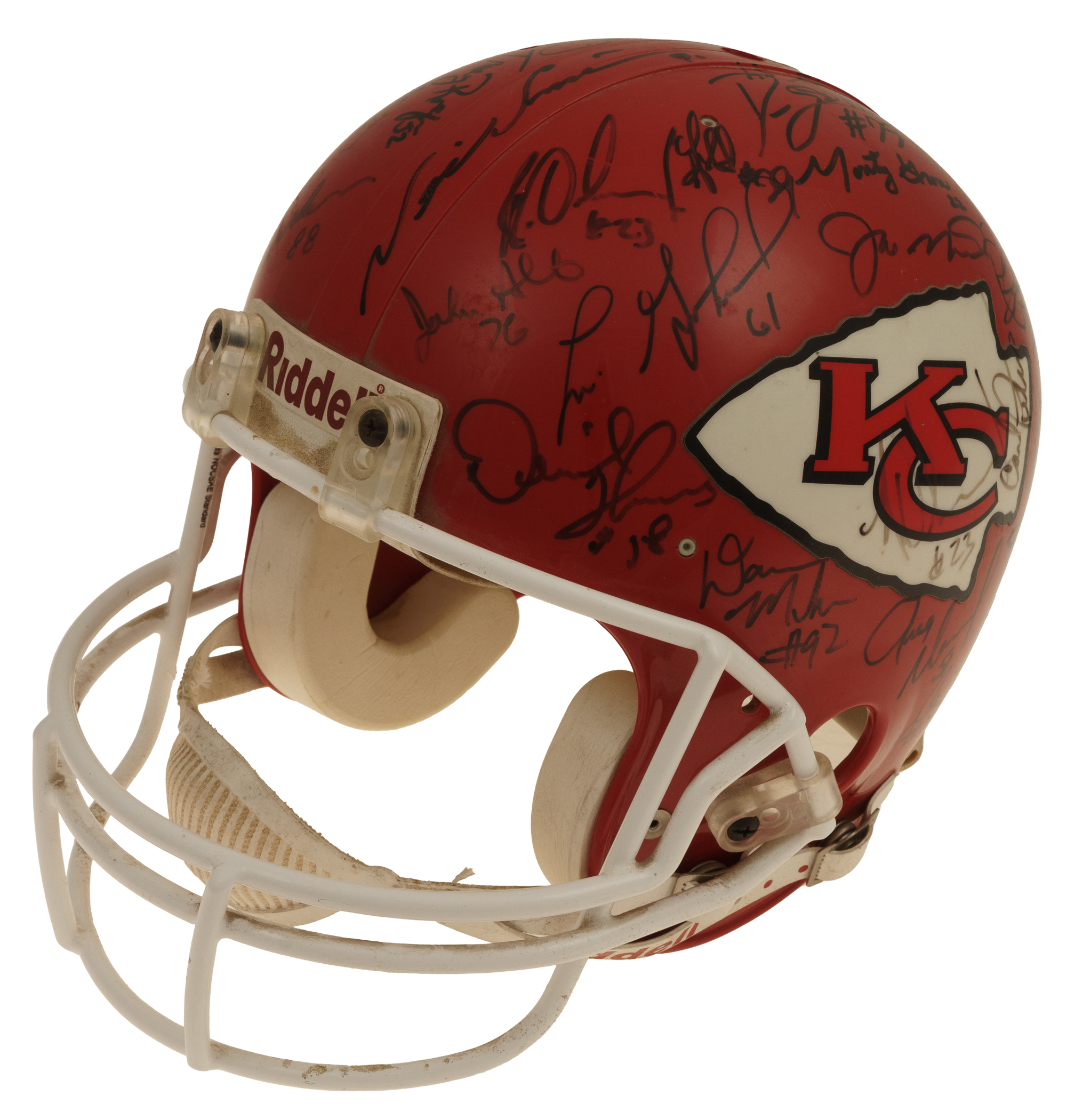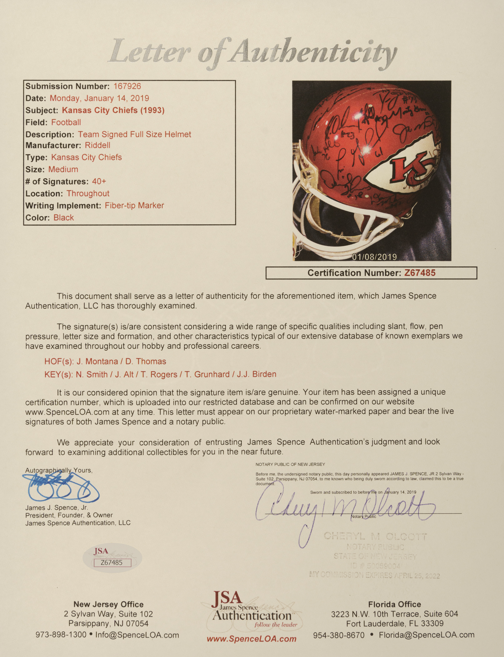 Riddell Kansas City Chiefs football helmet signed in black marker by forty-plus members of the 1993 Kansas City Chiefs including Joe Montana, Derrick Thomas, Neil Smith, John Alt, Tracy Rogers, Tim Grunhard, and J.J. Birden. The helmet (size Medium) displays staining along the interior; Excellent condition overall. Full LOA from James Spence/JSA. The size/weight of this item requires that there will be an additional shipping charge for this lot.