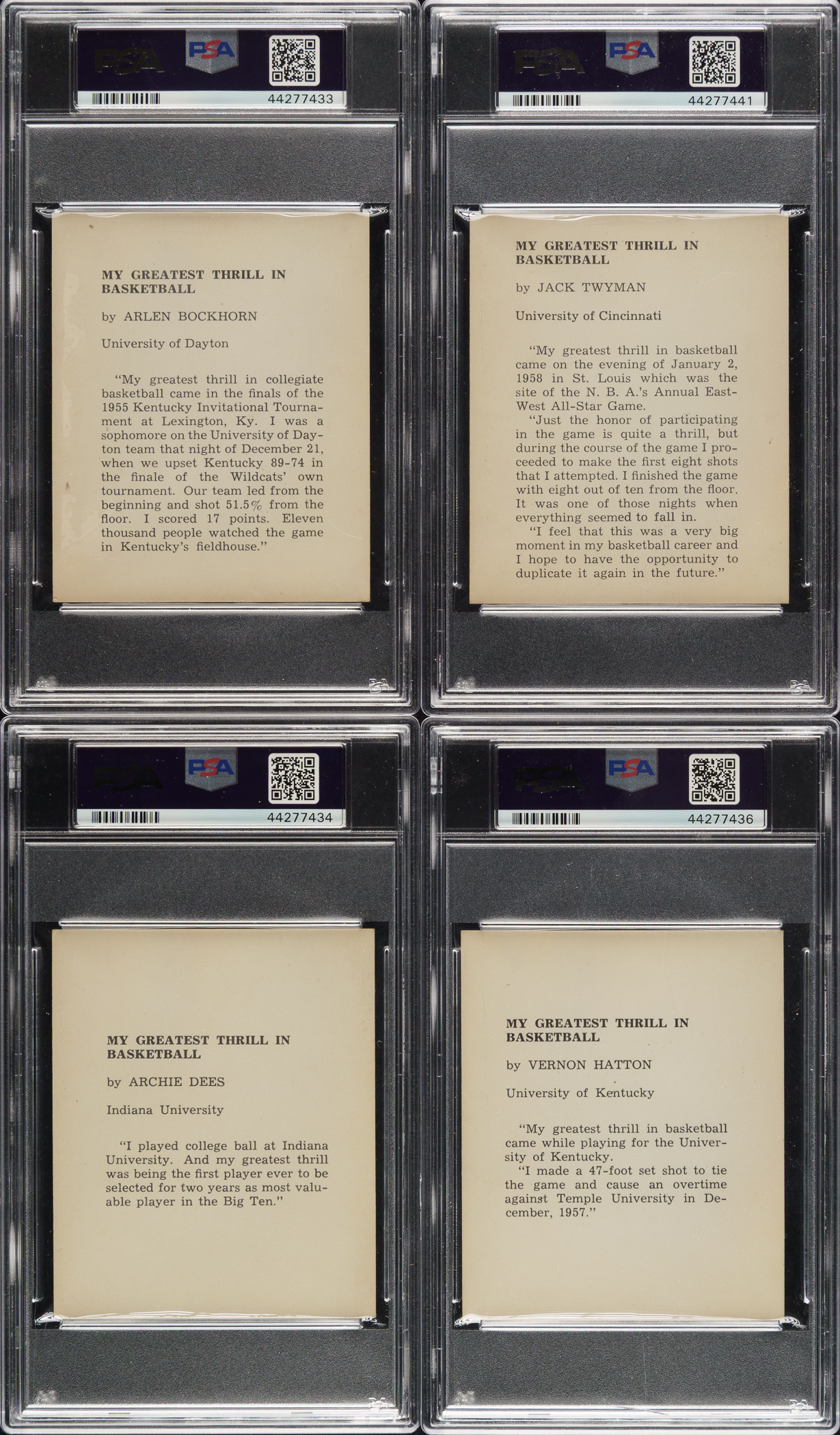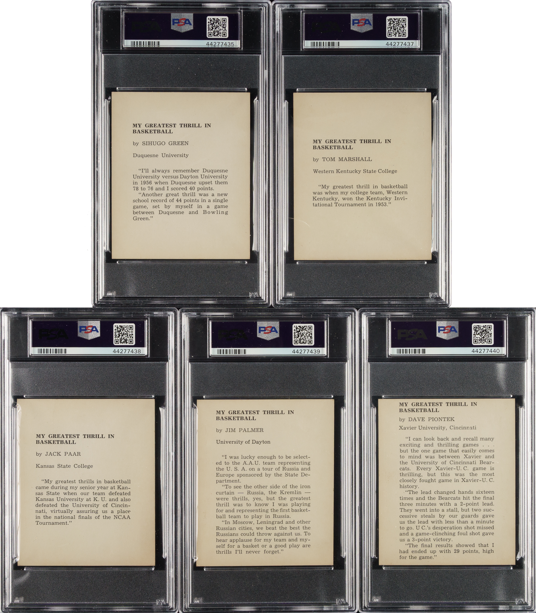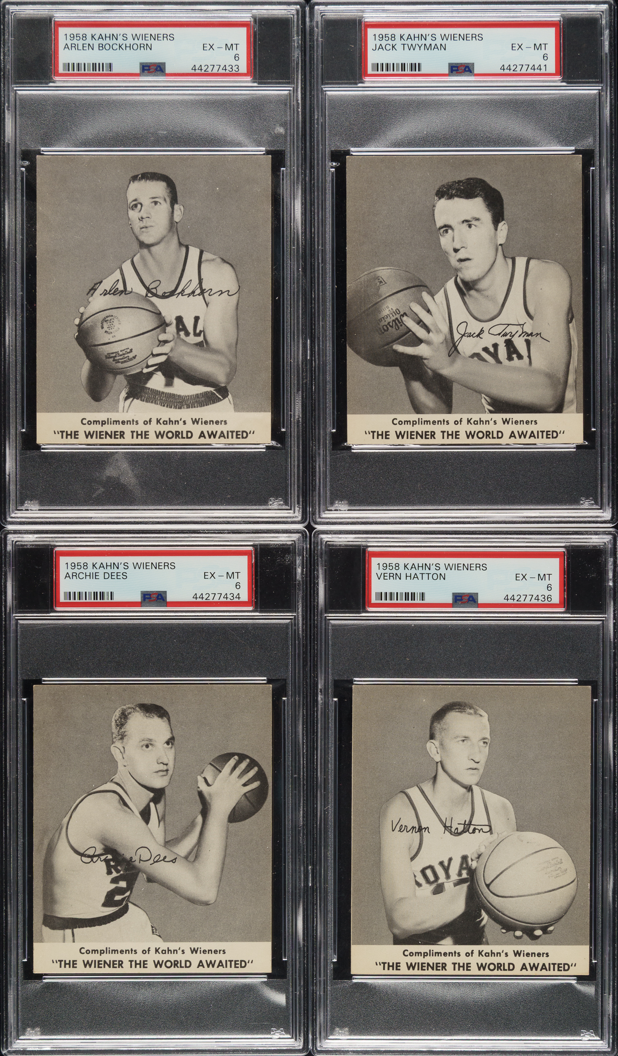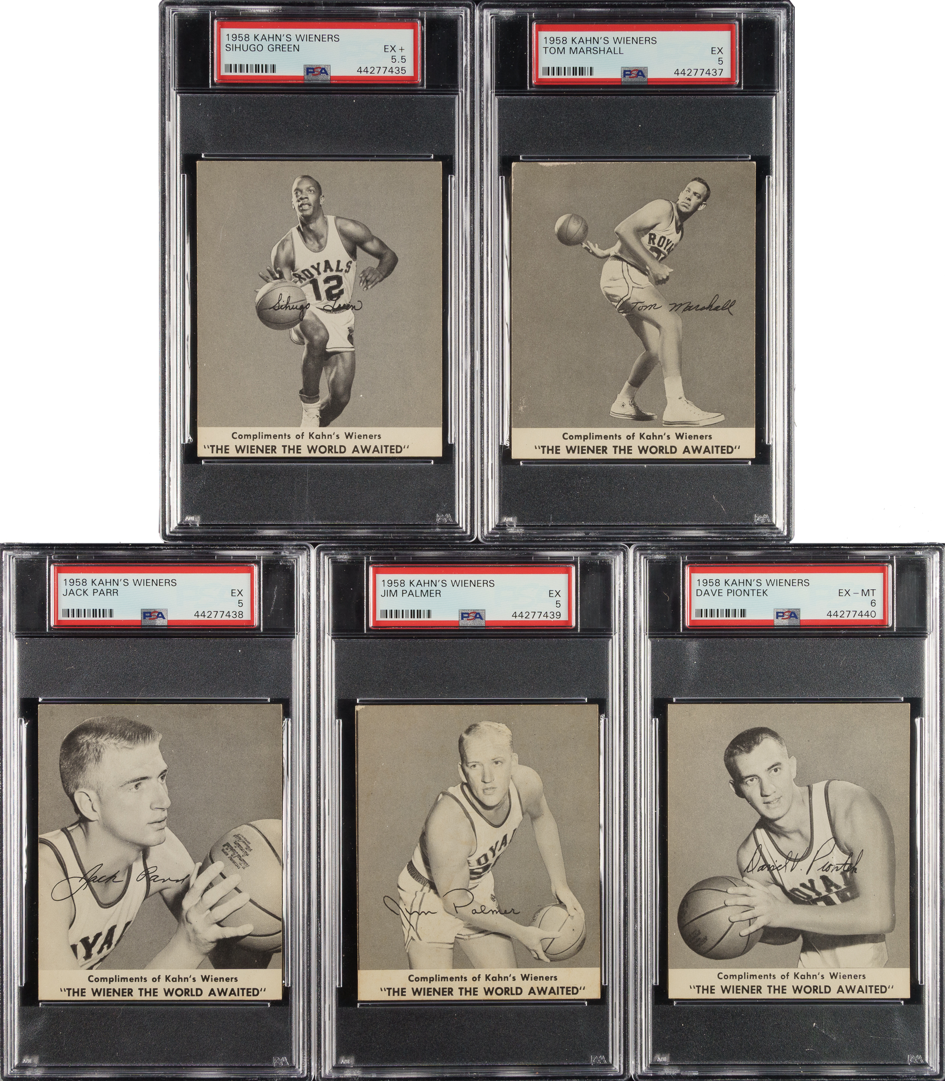 Rarely offered complete nine-card set of 1958-1959 Kahn’s Wieners basketball cards, highlighted by Hall of Famer Jack Twyman. The very scarce 1958-1959 Kahn's Wieners basketball set features nine members of the Cincinnati Royals. This is only the second complete set we have offered in the past twenty-one years! Each card has been graded and encapsulated by PSA. This set currently ranks first on the PSA Set Registry with an impressive overall GPA of 5.66. PSA Grading Composite: EX-MT 6 (5 cards): Bockhorn, Dees, Hatton, Piontek, and Twyman. EX+ 5.5 (1 card): Green. EX 5 (3 cards): Marshall, Palmer, and Par. One card was issued with each package of Kahn's meats. Because of the product with which they were packaged, heavy grease stains and creases are common with this issue, making it all the more difficult to assemble a high-grade set. This is a very attractive mid-grade complete set of this popular and attractive issue. Kahn's Wieners cards are far rarer than most 1950s basketball cards and are one of the few food issues of the era. Total: 9 cards.