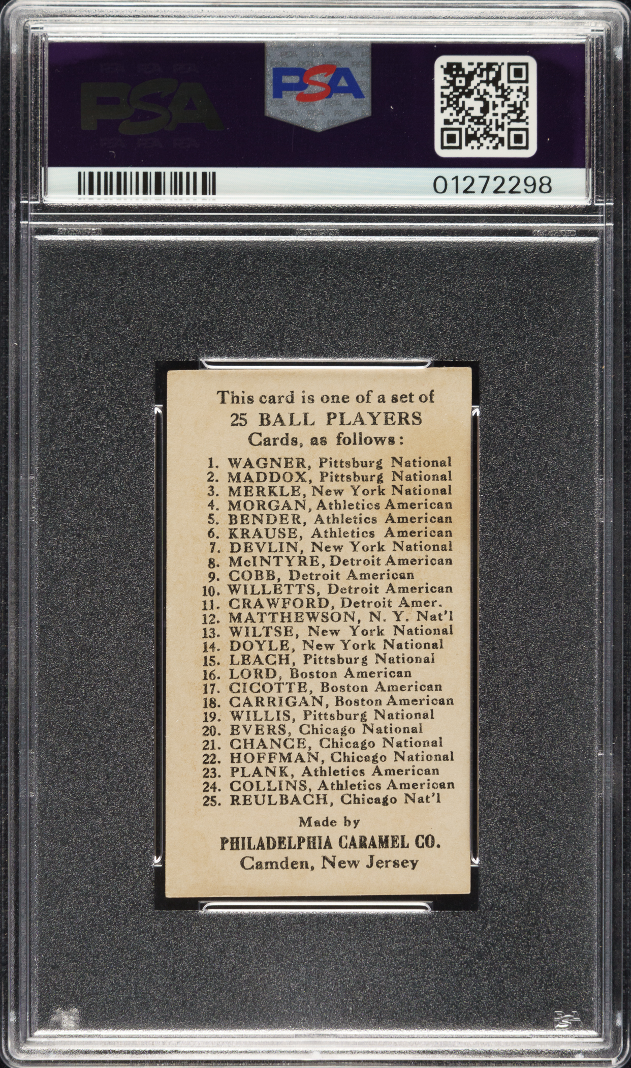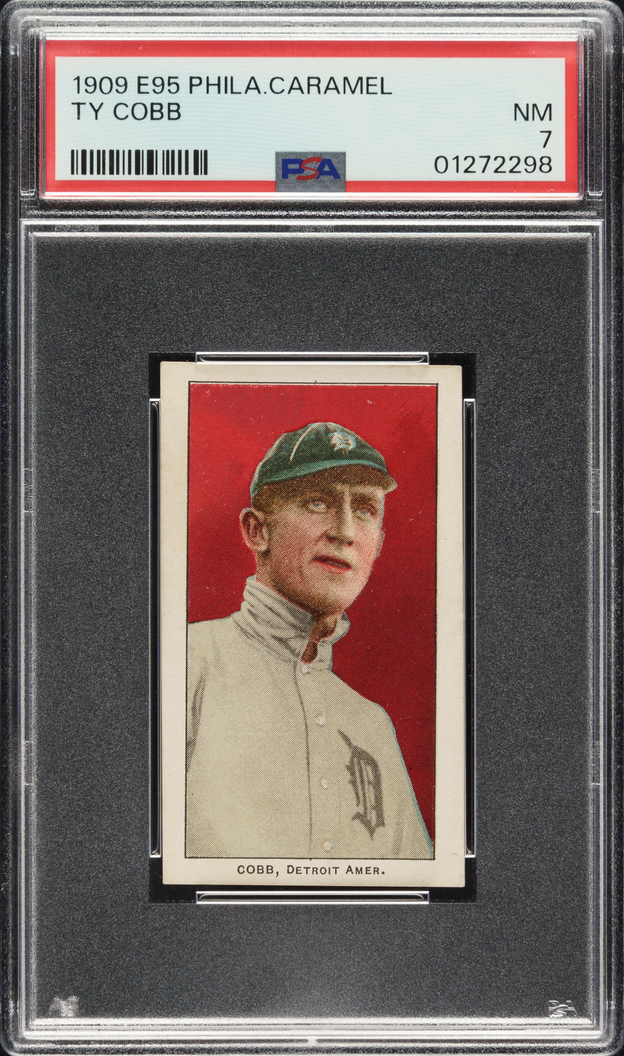 Graded NM 7 by PSA. One of only four examples graded at this level by PSA with none higher! Spectacular high-grade example of Hall of Famer Ty Cobb from the E95 Philadelphia Caramel series, one of Cobb's most beautifully designed cards and the key card from this rare and classic 1910-era candy set. The image on this card is unique to the set. The E95 Philadelphia Caramel card of Ty Cobb is one of his most highly prized cards in any grade, but this example is just incredible in all respects. Cobb’s image is boldly set against the vibrant red background. The card is well-centered (slight tilt to the image), with large borders, a flawlessly bright and clean surface, and with just the slightest hint of wear to the four square corners. The reverse has very faint traces of caramel staining (noted for accuracy), with a sharply printed checklist for the set. This card is in magnificent condition for any card, let alone for a caramel card, which because they were issued with candy, one card per package, tend to survive in lesser condition than their more common tobacco-card counterparts. This card is a gem! It is a simply extraordinary high-grade example of one of Cobb’s most desirable cards from one of the most popular and colorful of all “E” card issues, and one that would be a highlight in any extremely high quality classic, Hall of Fame, E95, or Ty Cobb card collection.