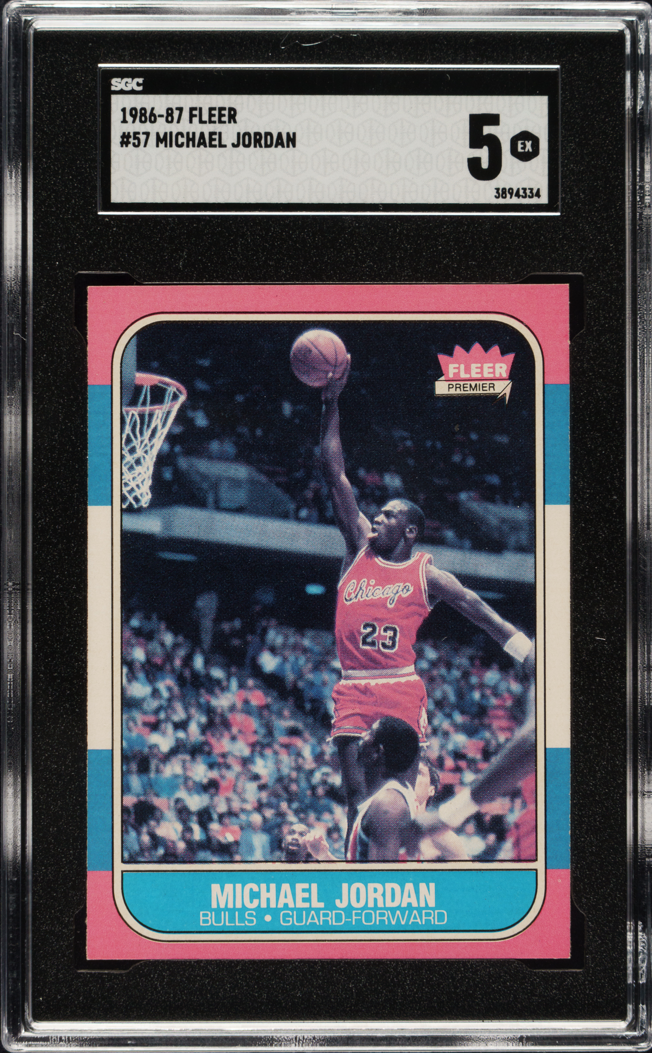 Graded EX 5 by SGC. Outstanding mid-grade rookie card of Chicago Bulls Hall of Famer Michael Jordan, arguably the greatest basketball player ever. This is a beautiful example of the premier modern-day basketball card. The 1986-1987 Fleer basketball issue is extremely condition-sensitive due to its blue flush-to-the-border design. The offered example boasts bold colors, strong corners, and minimal chipping to the extreme edges of the condition-sensitive borders. Clean reverse. The Fleer Jordan card is one of the cards that is recognizable to collectors of all ages and is one of the great cardboard collectibles in our hobby. This is a solid example of this most sought-after modern basketball-card classic.
