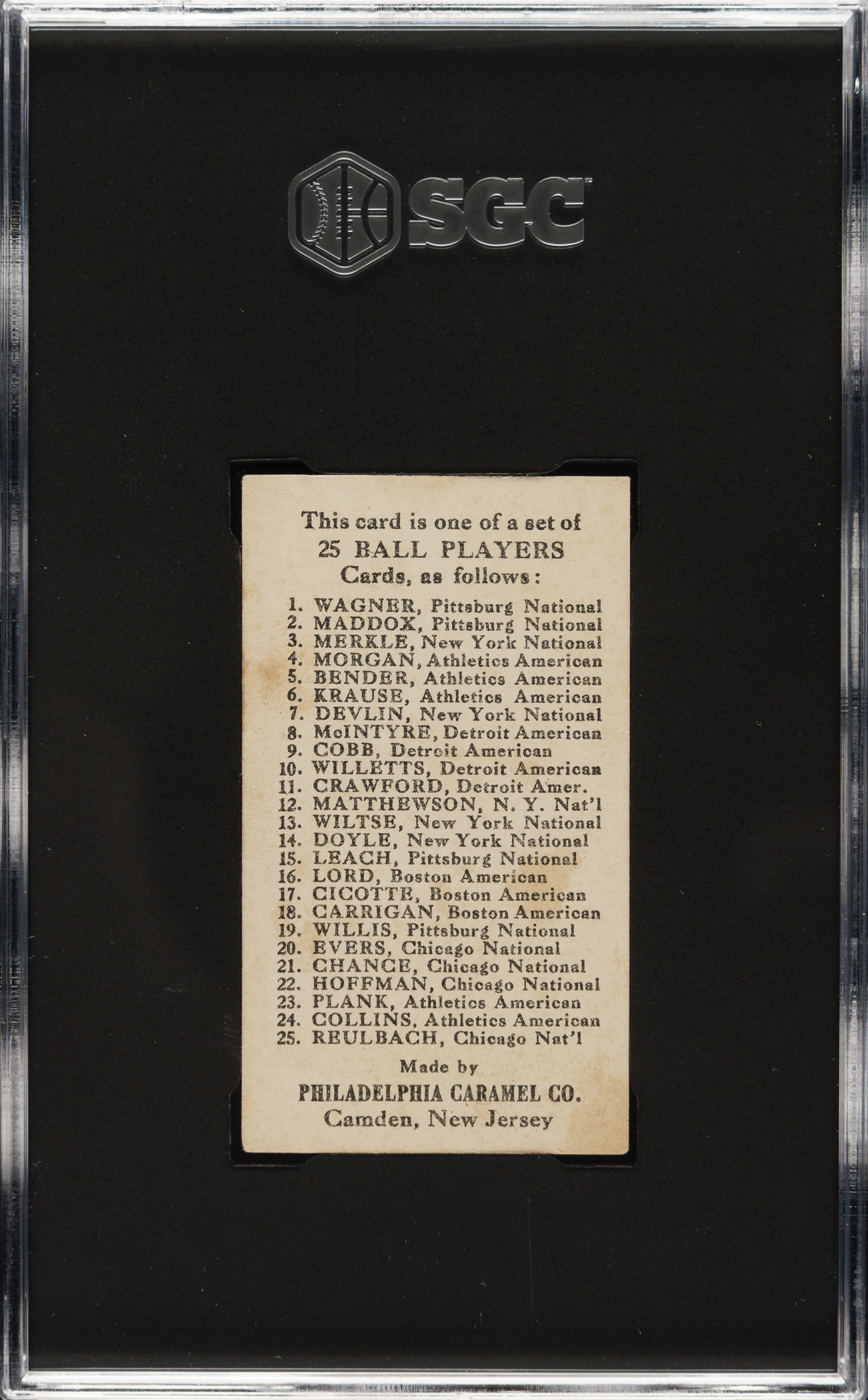 Graded VG/EX 4 by SGC. Stunning mid-grade example of Hall of Famer Honus Wagner in a batting pose from the E95 Philadelphia Caramel series, one of Wagner's most beautifully designed cards and one of the key cards from this rare and classic 1910-era candy set. The image on this card is unique to the set. This example has bright colors, a strong image, and excellent centering. Condition issues include light corner wear and corner crease on the upper left. The reverse has light caramel stains and a very sharply printed checklist for the set. This card would be in magnificent condition for any card issued in 1909 but is all the more so for a caramel card, which because they were issued with candy, one card per package, tend to survive in lesser condition than their more common tobacco-card counterparts. The E95 Philadelphia Caramel card of Honus Wagner is one of his most highly prized cards in any grade, but this is a particularly strong example in all respects with tremendous eye-appeal.