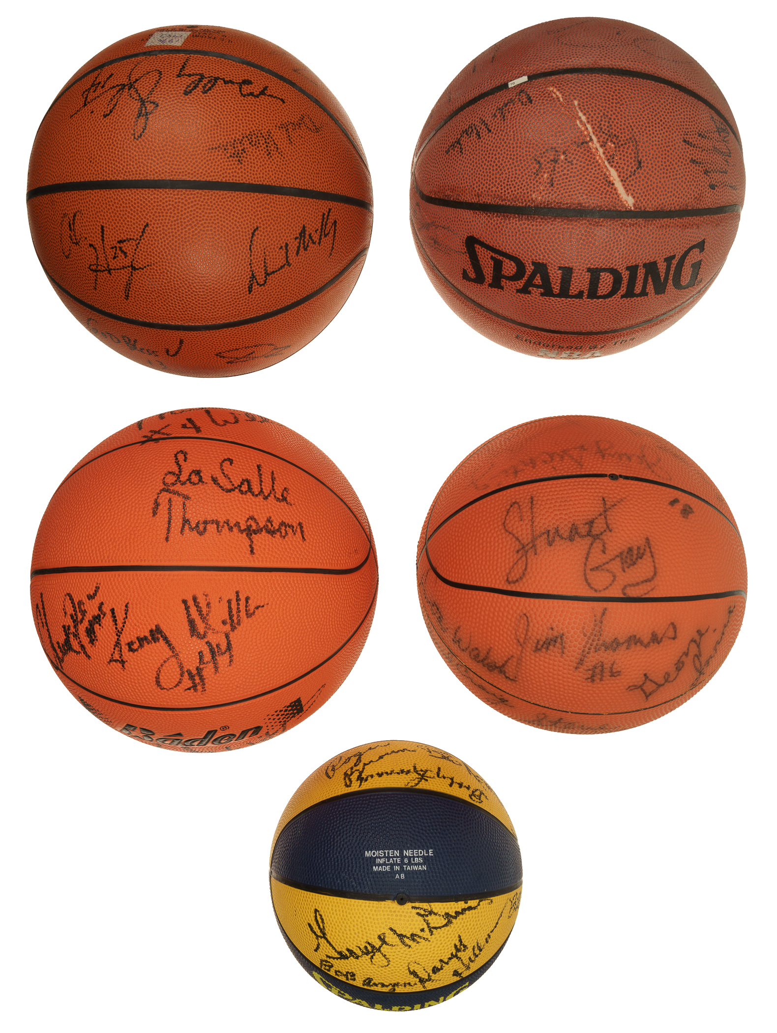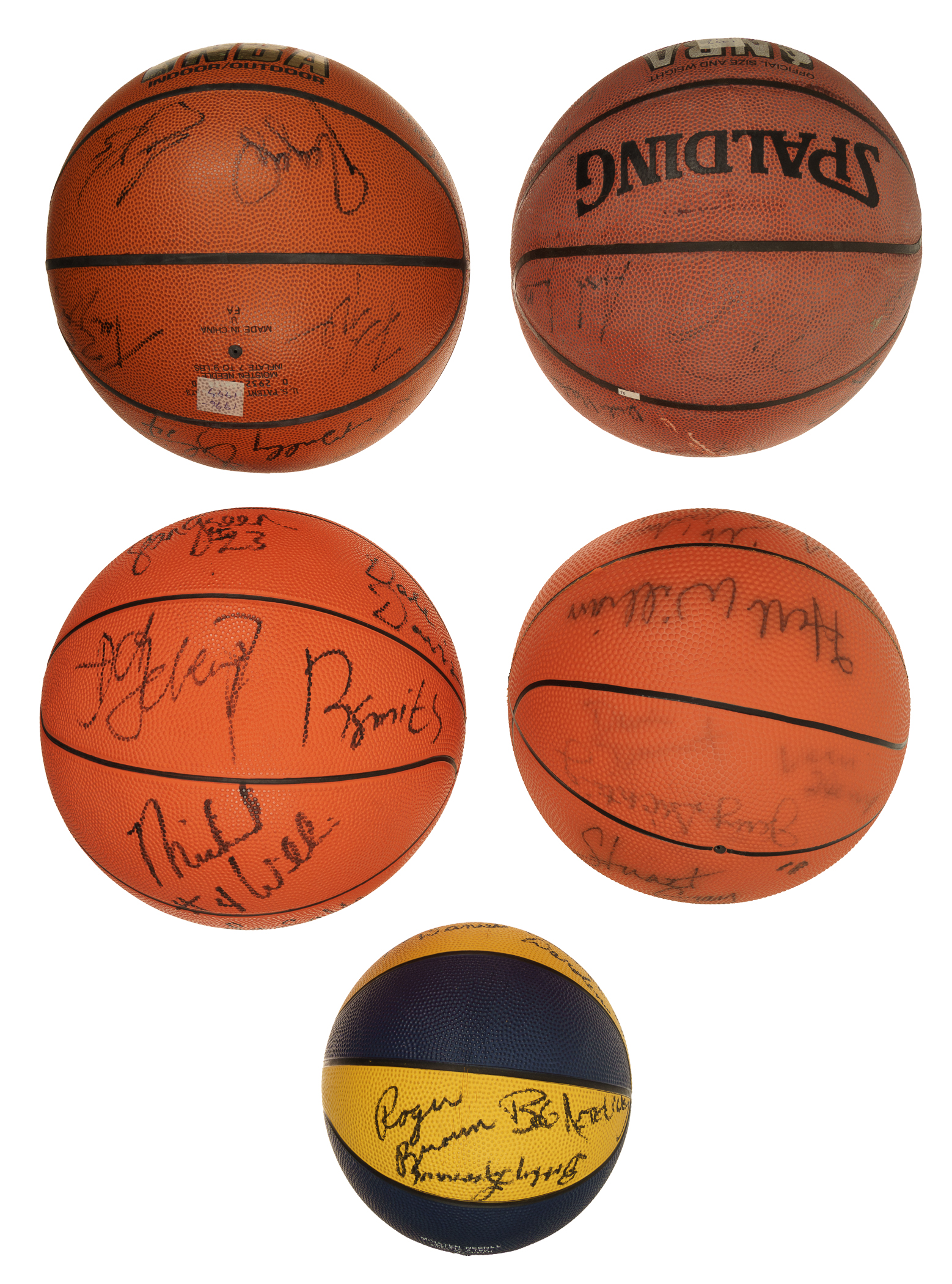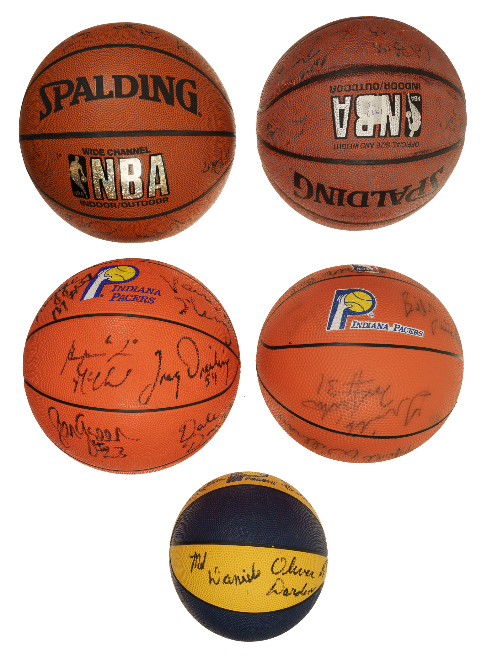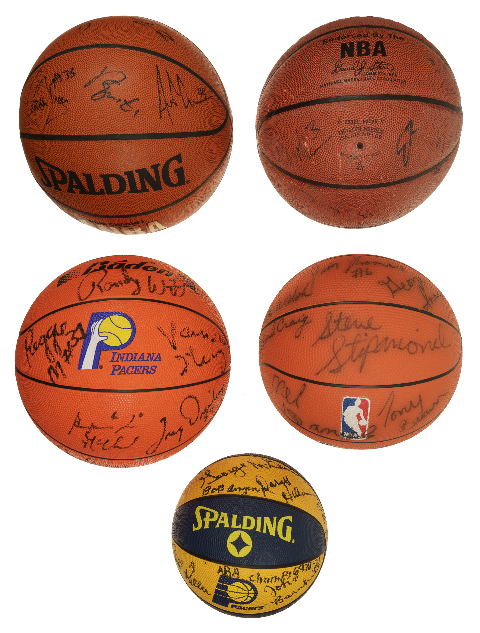 Collection of five Indiana Pacers team-signed basketballs. This collection consists of the following: 1) 1969-1970 (ABA Champions). Twelve black marker signatures on a Spalding Pacers reunion mini-basketball. Key signatures include Daniels, Brown, and Netolicky. Slightly deflated but otherwise Near Mint. 2) 1984-1985. Fifteen black marker signatures on a Pacers NBA basketball. Key signatures include Williams, Brown, Walsh (coach), and Daniels (coach). Slightly deflated but otherwise in Near Mint condition. 3) 1991-1992. Thirteen black marker signatures on a Baden Pacers basketball. Key signatures include Miller, Person, Thompson, Schrempf, and Smits. Slightly deflated but otherwise Near Mint. 4) 1997-1998. Fourteen black marker signatures on a Spalding Indoor/Outdoor basketball. Key signatures include Jackson, Rose, and A. Davis. Fair condition due to scattered surface wear and spots of discoloration. 5) circa 1998-1999. Seventeen black marker signatures on a Spalding Indoor/Outdoor basketball. Key signatures include Miller, Jackson, Harrington, and A. Davis. Total: 5 signed basketballs. The size/weight of this item requires that there will be an additional shipping charge for this lot.