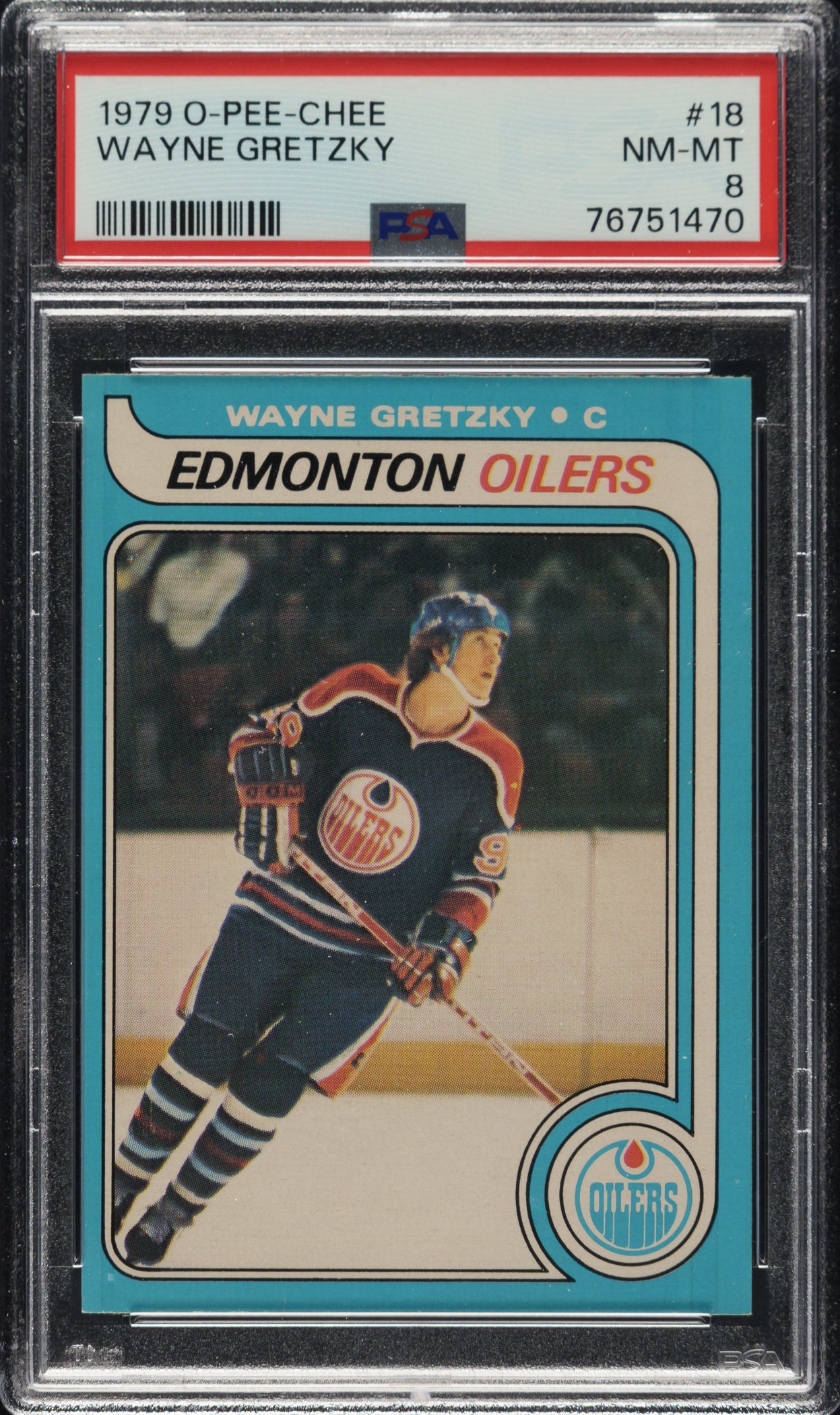 Graded NM-MT 8 by PSA. Outstanding high-grade rookie card of Edmonton Oilers Hall of Famer Wayne Gretzky, recognized by many as the greatest hockey player ever. This card is the "1952 Topps Mickey Mantle" of hockey cards! The Gretzky rookie will always be one of the most important of all hockey cards, especially prized in high grade. The 1979-1980 O-Pee-Chee hockey issue is extremely condition-sensitive because of its blue flush-to-the-border design. The offered example has vibrant colors, superb image quality, and strong corners. Clean reverse. A tremendous high-grade example of this most sought-after modern hockey-card classic.