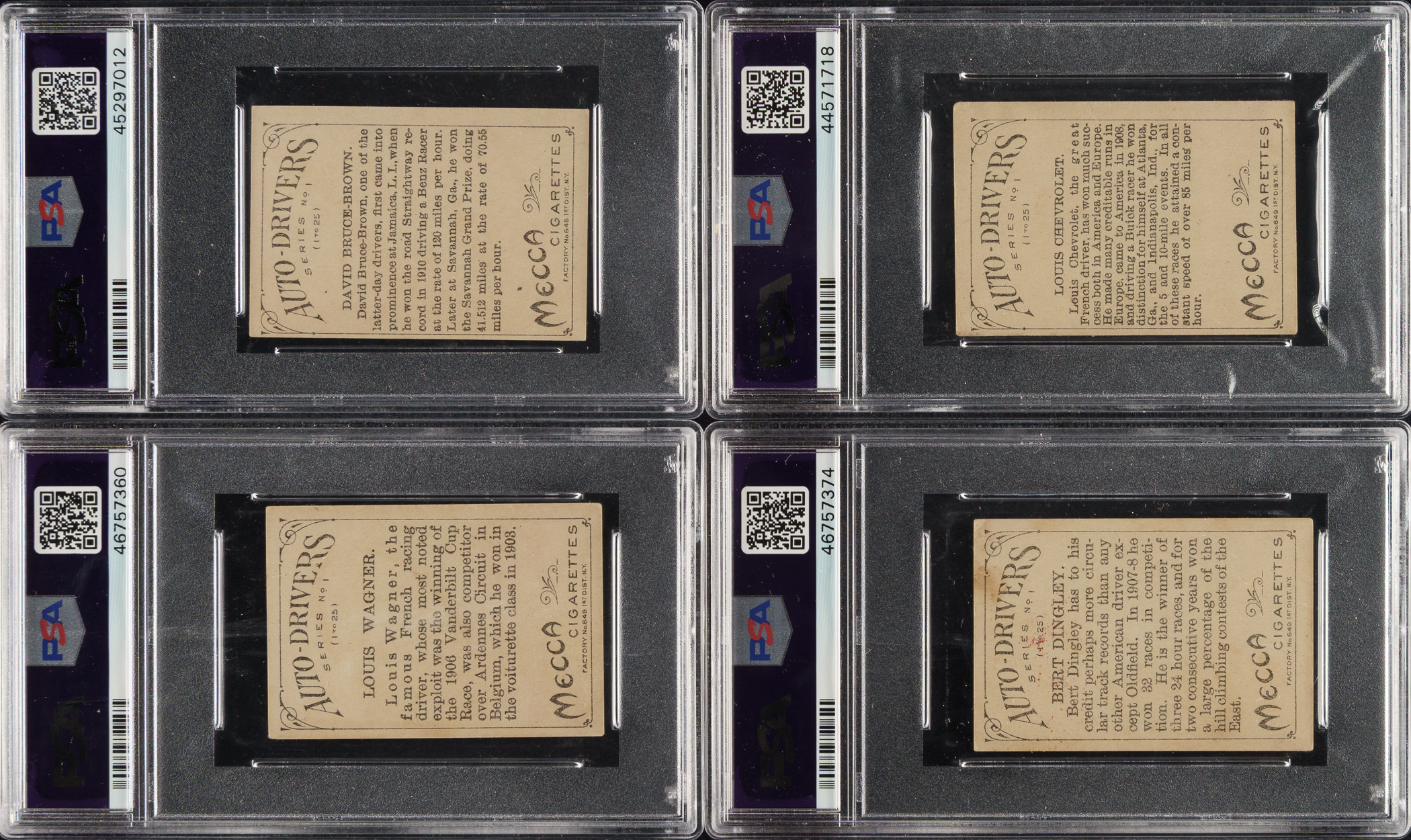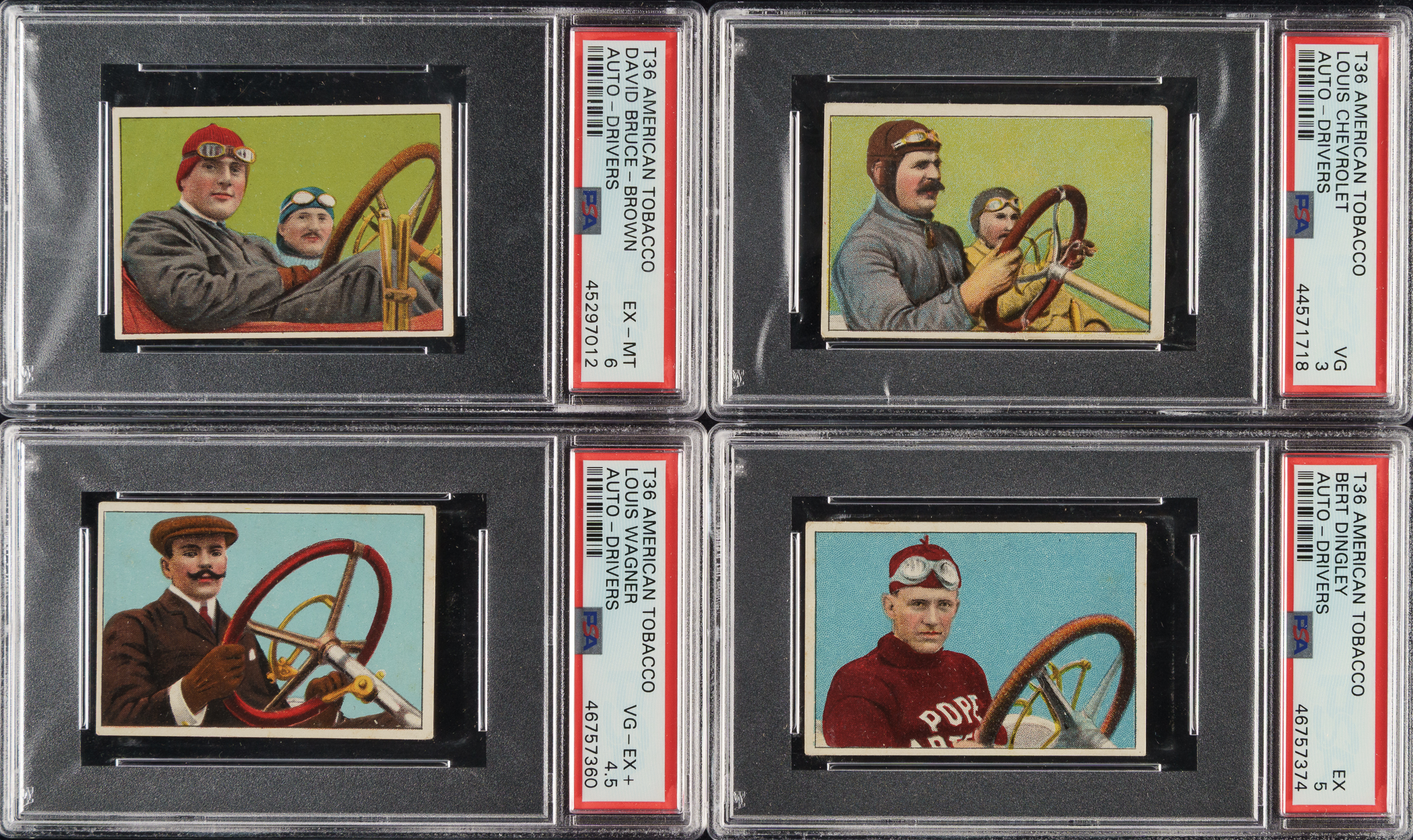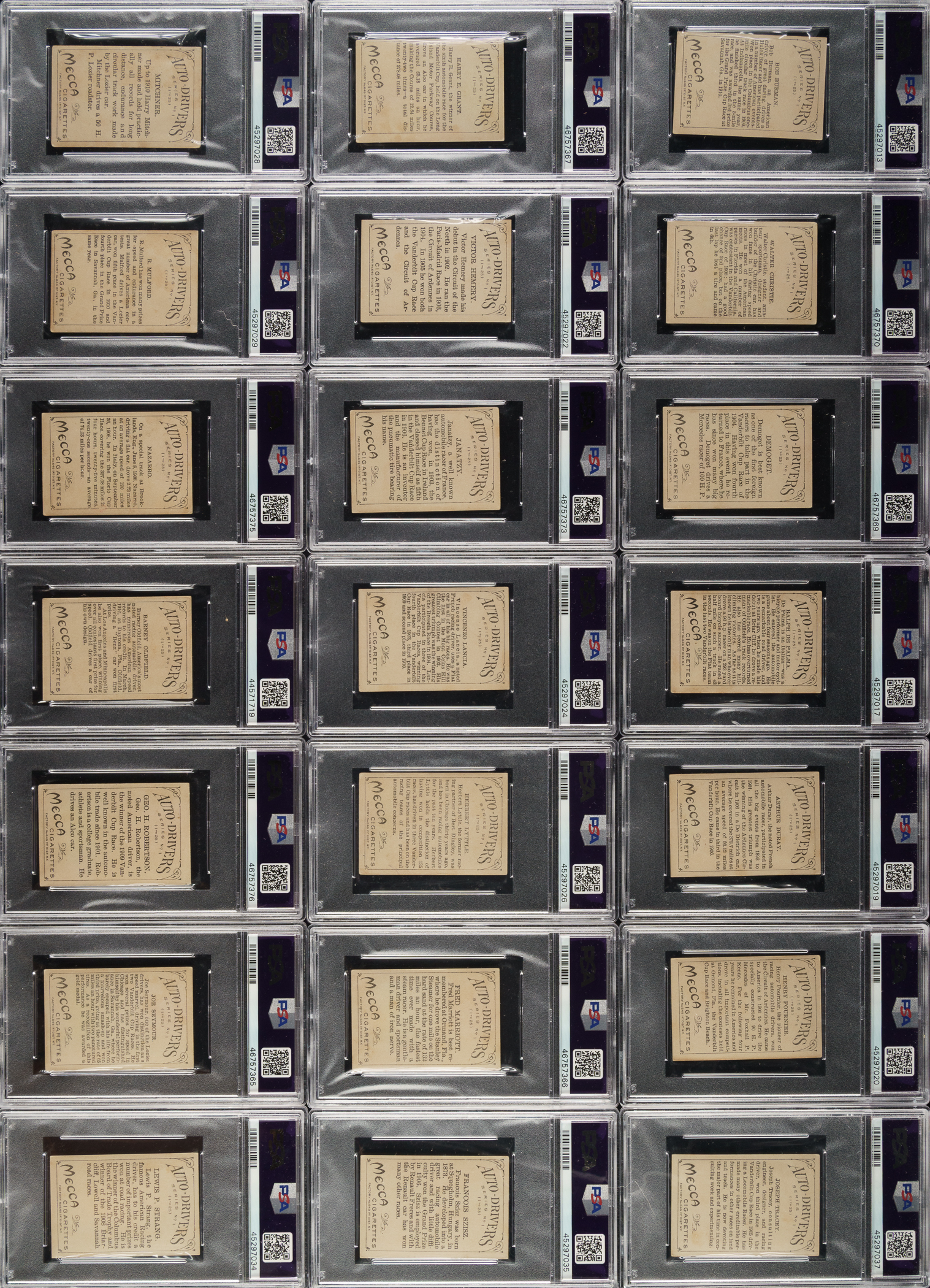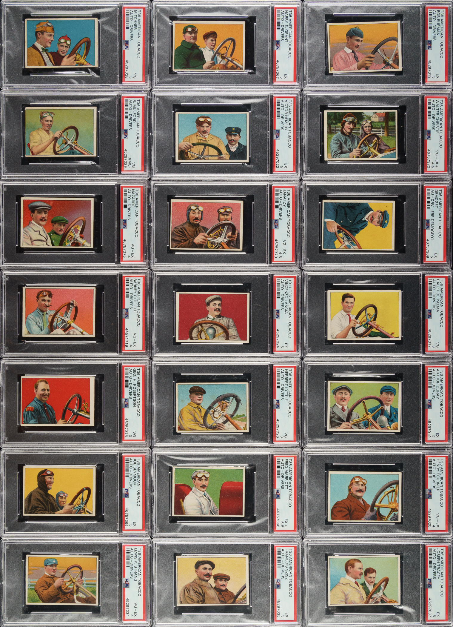 Offered is a complete 25-card set of 1910 T36 "Auto-Drivers" cards, entirely graded and encapsulated by PSA. The offered set is ranked first on the PSA Set Registry with an overall GPA of 4.32. Issued with Hassan or Mecca Cigarettes, each card features a beautifully rendered multicolor illustration of a legendary race car driver or automobile pioneer, including famous names like Barney Oldfield and Louis Chevrolet. The reverse displays a brief description of the featured subject. PSA Grading Composite: EX-MT 6 (1 card): Bruce-Brown. EX+ 5.5 (1 card): Marriott. EX 5 (10 cards): Burman, Demoget, Dingley, Duray, Grant, Hemry, Lancia, Seymour, Szisz, and Tracey. VG-EX+ 4.5 (3 cards): Christie, Janatzy, and Wagner. VG-EX 4 (4 cards): Fournier, Nazarro, Oldfield, and Strang.VG 3 (6 cards): Chevrolet, Palma, Lyttle, Mitchner, Mulford (MC), and Robertson. Total: 25 cards. The size/weight of this item requires that there will be an additional shipping charge for this lot.