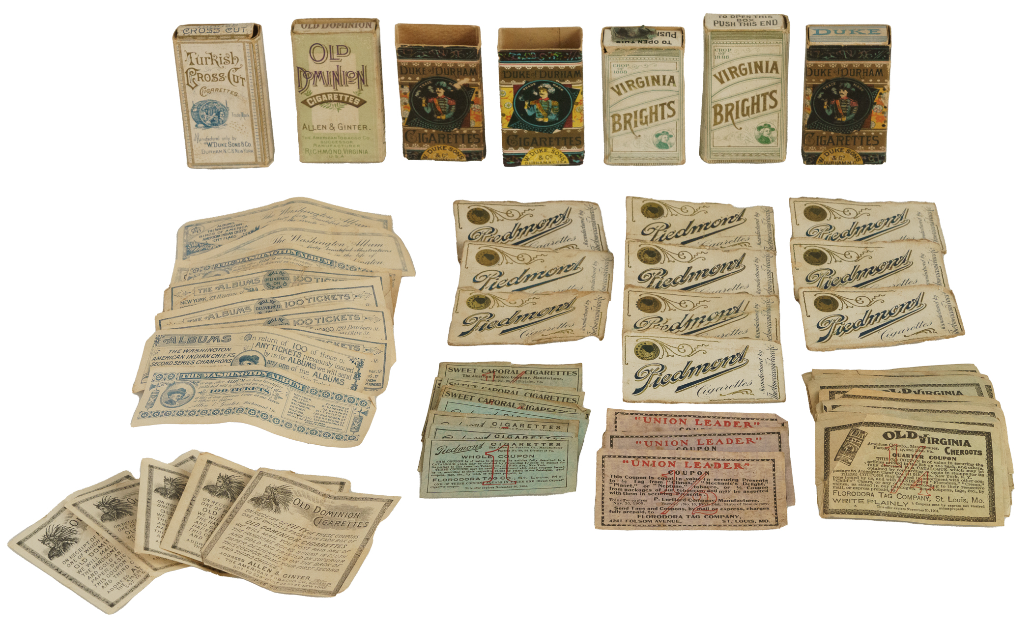 Collection of sixty-six late nineteenth-century and early twentieth-century cigarette packages and coupons. This collection consists of the following: 1) Allen & Ginter (12 coupons). Gd. 2) Sweet Caporal Cigarettes (7 "1/2 coupons"). Fr. 3) Old Virginia Cheroots (18 "1/4" coupons). Overall condition ranges from Pr to Gd. 4) Piedmont Cigarettes (4 coupons). Fr. 5) Old Dominion Cigarettes (5 coupons). Fr. 6) Union Leader (3 coupons). Gd. 7) Piedmont Cigarettes (10 box panels). Present in Pr to Fr condition overall. 7) Virginia Brights (2 empty boxes, no cigarettes). "Crop of 1886" (Fr) and "Crop of 1888" (Gd). 8) Old Dominion Cigarettes (1 empty box, no cigarettes). Fr. 9) Duke of Durham Cigarettes (3 empty boxes, no cigarettes). Two packs are missing their tray (both Pr) while the other is Vg. 10) Turkish Cross Cut Cigarettes (1 empty box, no cigarettes). Gd. Total: 66 items (49 coupons, 10 box panels, and 7 boxes).