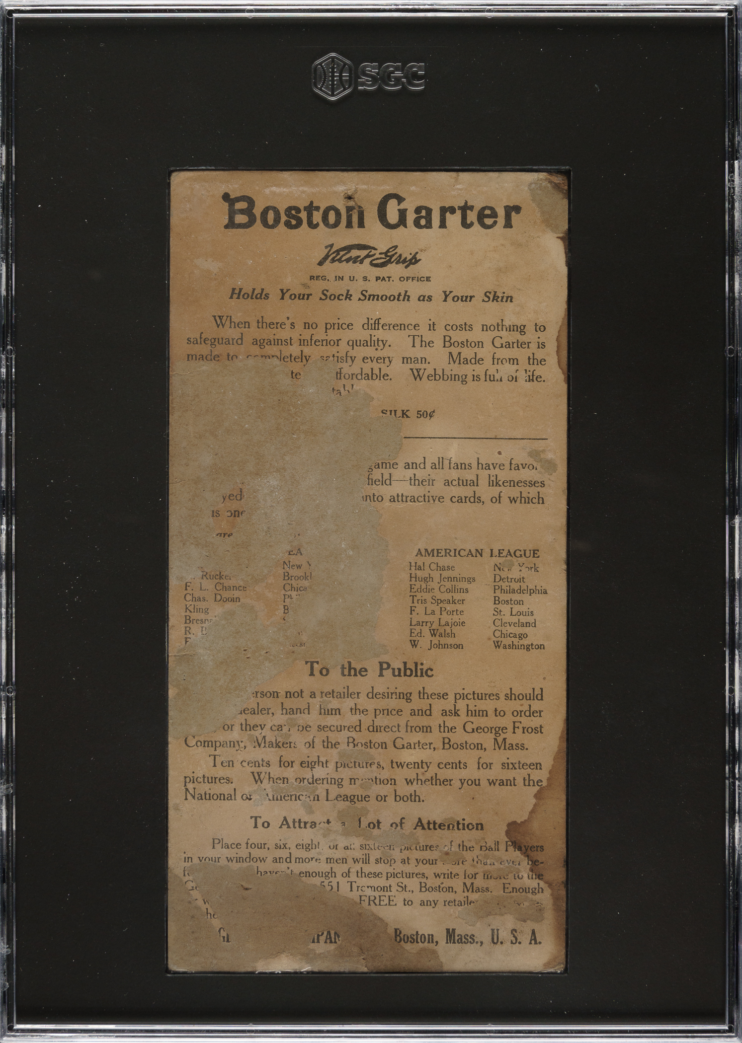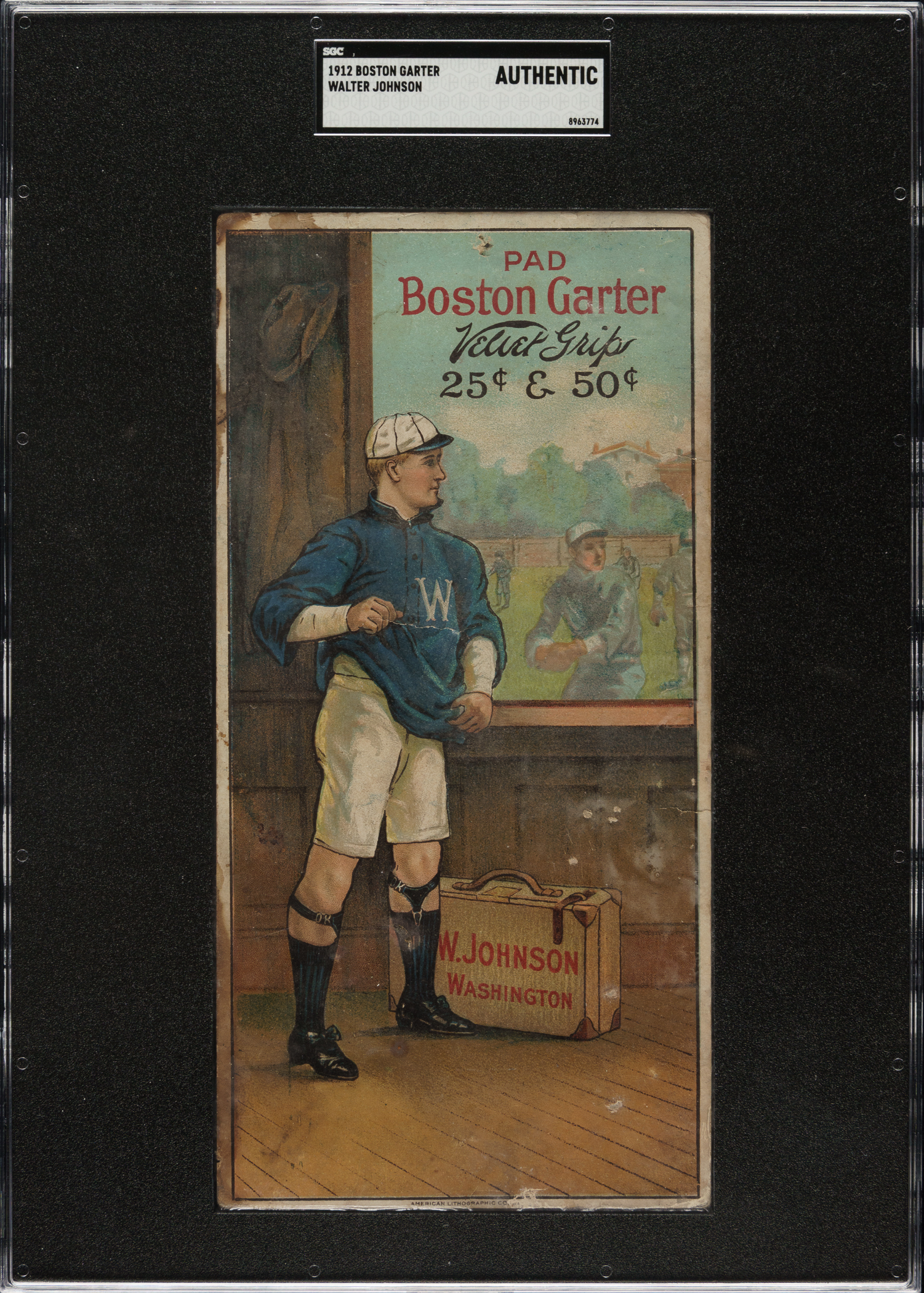 Presented is an example of Washington Senators Hall of Famer Walter Johnson from the H813 Boston Garter series. The offered example is one of five H813 Boston Garter cards recently discovered in the Midwest. Each card is presented individually in this auction, encapsulated as "Authentic" by SGC (submitted by REA). The 1912 Boston Garter set is one of the most beautiful card issues ever produced. It is also one of the rarest. In fact, as duly noted in the Standard Catalog, these cards are so rare that if it were not for the checklist which appears on the back of each card, we would not even know what players comprise the set, let alone that there are sixteen cards to the set (each team is represented by one player). It is a privilege for REA to offer one of the key Hall of Famers, Walter Johnson, from this extraordinary set. This is the first example of Johnson that we have ever seen! 1912 Boston Garters are unique in that each features a player in the locker room, without pants, in the midst of getting dressed, proudly displaying his Boston-brand garters. In the background are beautiful stadium scenes, featuring ballplayers on the field. On this example, Johnson is standing next to his suitcase (with "W. Johnson Washington" on the side of his case) and with his coat and hat hanging on the wall, as he prepares to dress prior to taking the field. The unparalleled quality of the lithography and the unique concept of the set both contribute to making 1912 Boston Garters one of the most distinctive and noteworthy baseball-card sets ever issued. The offered example of Johnson is bright and crisp with bold colors. The card displays a number of obvious condition flaws but still possesses outstanding visual appeal and displays extremely well. 1912 Boston Garters measure 4 x 8.25 inches. This card would be a highlight in even the most advanced card collection in the world and represents an extremely rare opportunity to acquire one of the key cards from the legendary and elusive 1912 Boston Garter set.