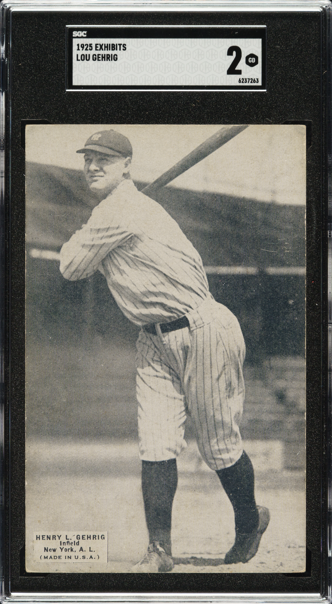 Graded GOOD 2 by SGC (submitted by REA). Presented is a very attractive Exhibits card dating from Gehrig's first full season with the Yankees, in 1925. This is an extremely significant card as it is recognized as Lou Gehrig's true rookie card. This is also one of the key rarities and perhaps the most noteworthy of all Exhibits cards. The card is bright and crisp with outstanding picture quality but has light corner wear and a light, diagonal crease on the upper-right quadrant. There appears to be erased writing on the lightly toned reverse. Though accurately graded at Good, it certainly has a far better appearance. This is an extremely historic card, Lou Gehrig's true rookie card, and one that would be a highlight in even the most advanced card or Hall of Fame collection.