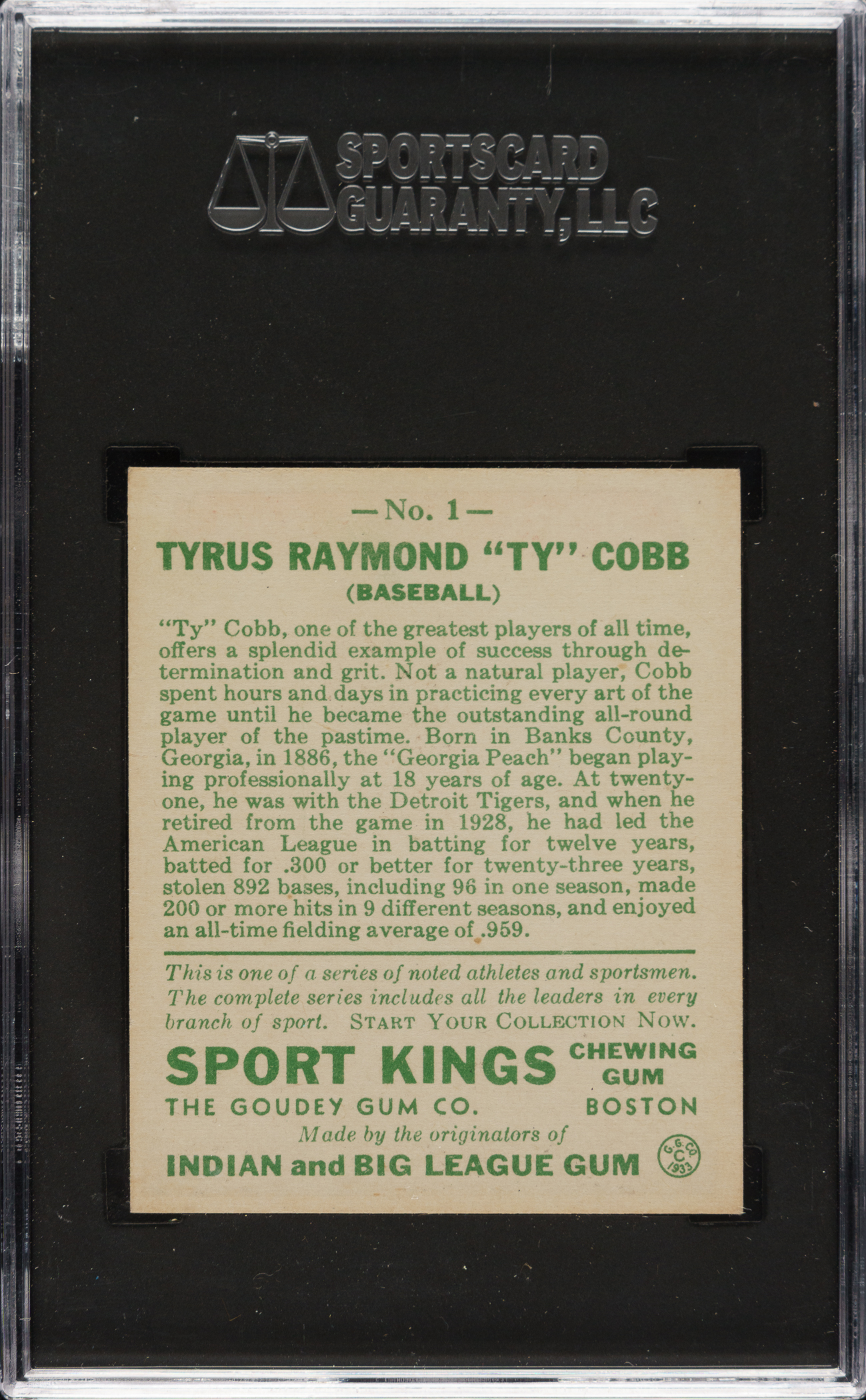Graded NM/MT+ 8.5 by SGC. One of only two examples graded at this level by SGC with none graded higher! Extremely striking ultra-high-grade example of one of Ty Cobb's most sought-after cards. Bright and clean, both front and back, beautifully centered (slightly toward the bottom right), with crisp, bold printing on front and reverse, and strong corners. The Sport Kings is one of Cobb's most popular and majestic cards. Being the No.1 card in the set, this card naturally gravitated to the top of a stack, exposing it to extra wear and handling and thus making high-grade examples even more difficult to find than most other Sport Kings and other Cobb cards. This is an extremely attractive ultra-high-grade example of one of Cobb's most classic cards.